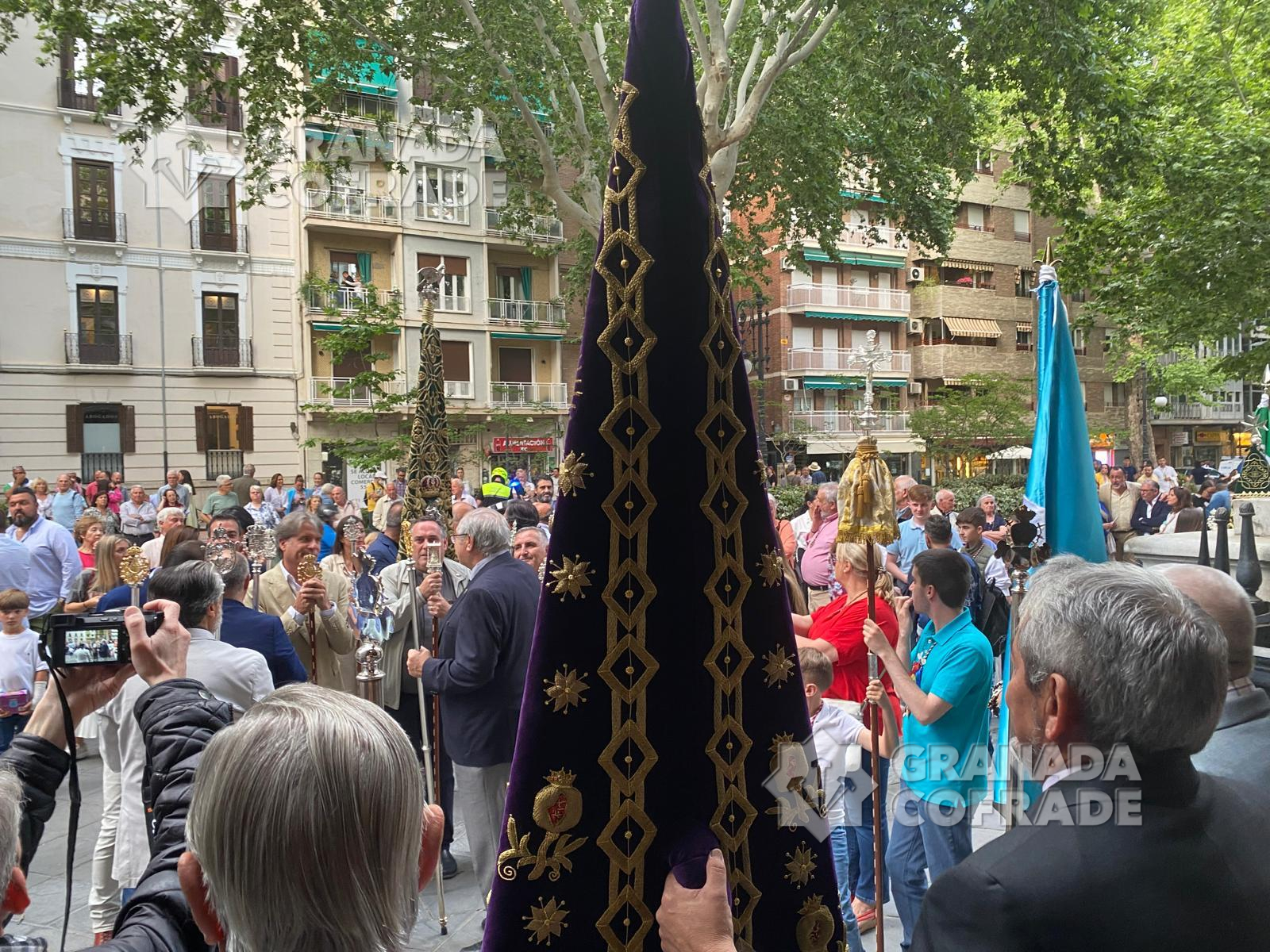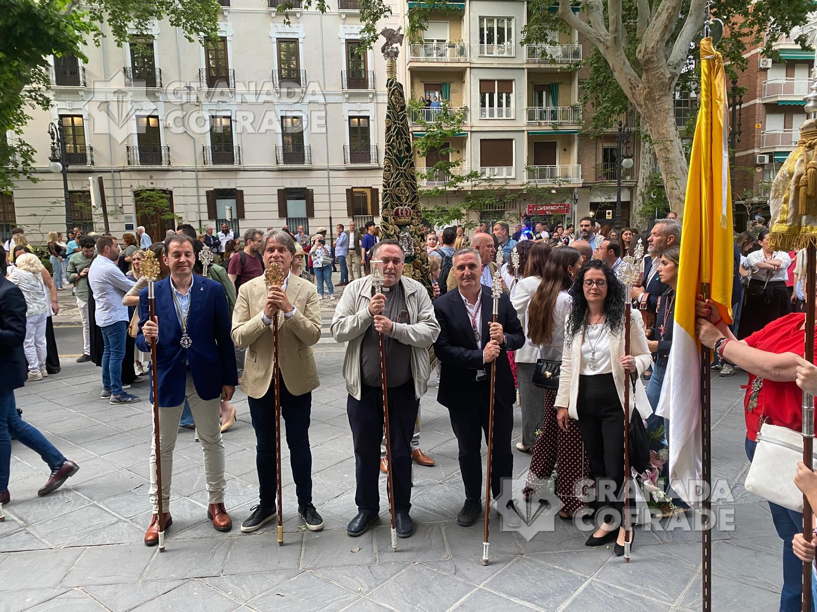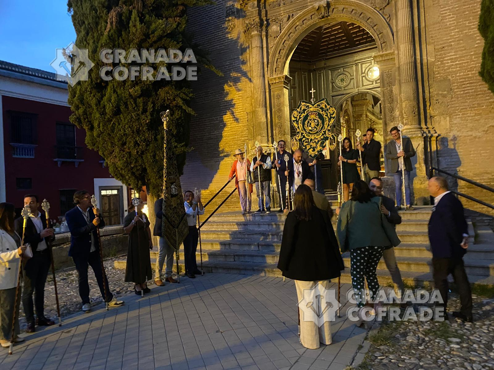 Después, los romeros caminaron por la Carrera de la Virgen con los hermanos turnándose para portar el Simpecado llevado a mano y en dirección a plaza de Mariana Pineda. Nuestro compañero Manuel Sánchez aseguró a la redacción de GRANADA COFRADE que «acompañaron más personas y hermanos que nunca en dirección a la calle San Matías donde fue recibido por la hermandad de Jesús de la Paciencia y María Santísima de las Penas». Luego, por calle Colcha y Reyes Católicos hasta la Plaza de Santa  Ana donde también fue recibido el Simpecado del Rocío por la hermandad de Nuestra Señora de la Esperanza, con unas palabras del consiliario de ambas hermandades, Martín Rodríguez. Finalizó el camino de regreso con la presencia del Simpecado por su entorno, Carrera del Darro y atrio de San Pedro donde fue portado por el mayordomo saliente de este año, Luis Carlos Oriol, hasta el altar mayor. Fue así la despedida del trabajo realizado por el mayordomo que a decir de numerosos rocieros, ha sido un magnífico e impecable trabajo.