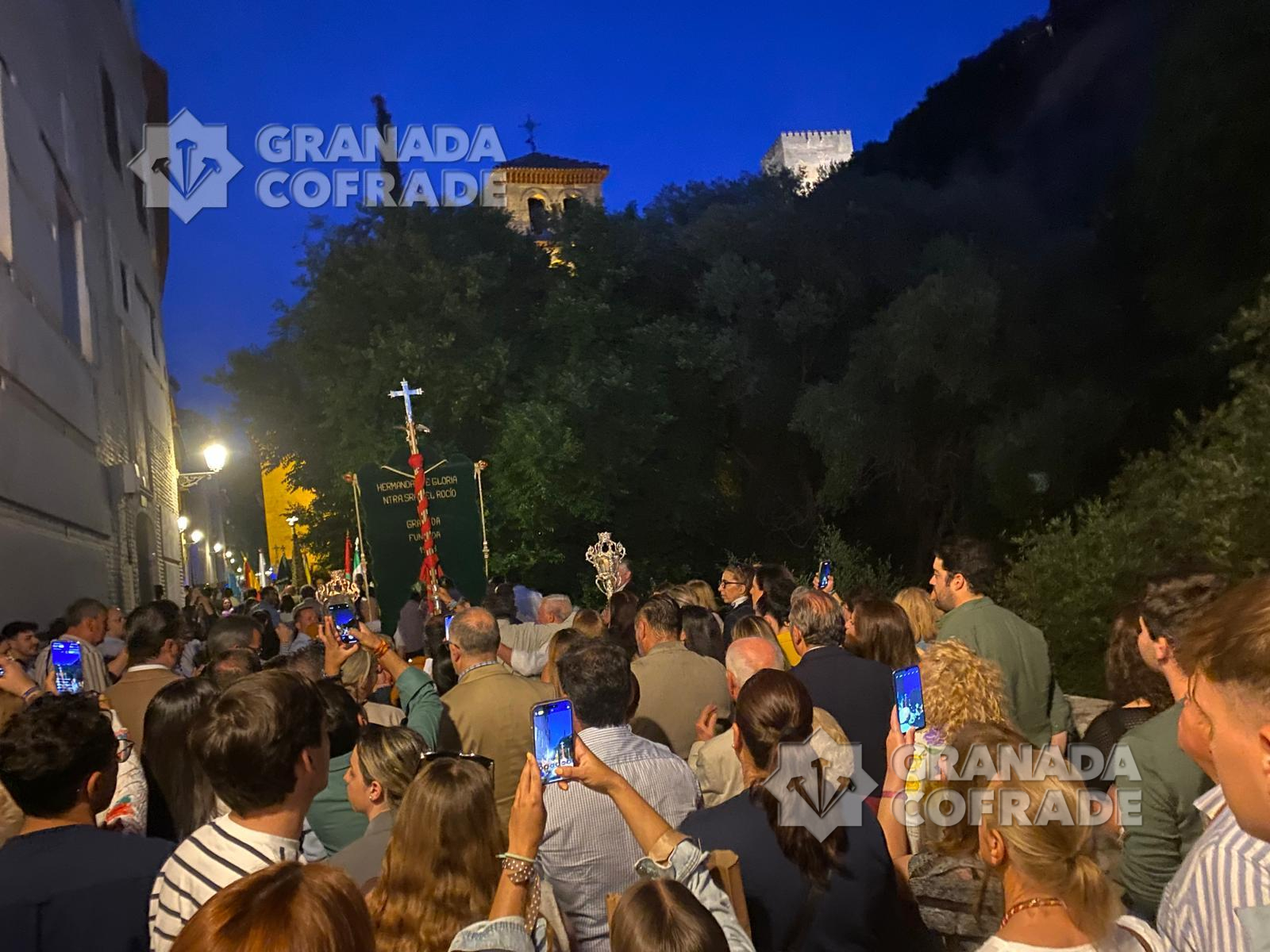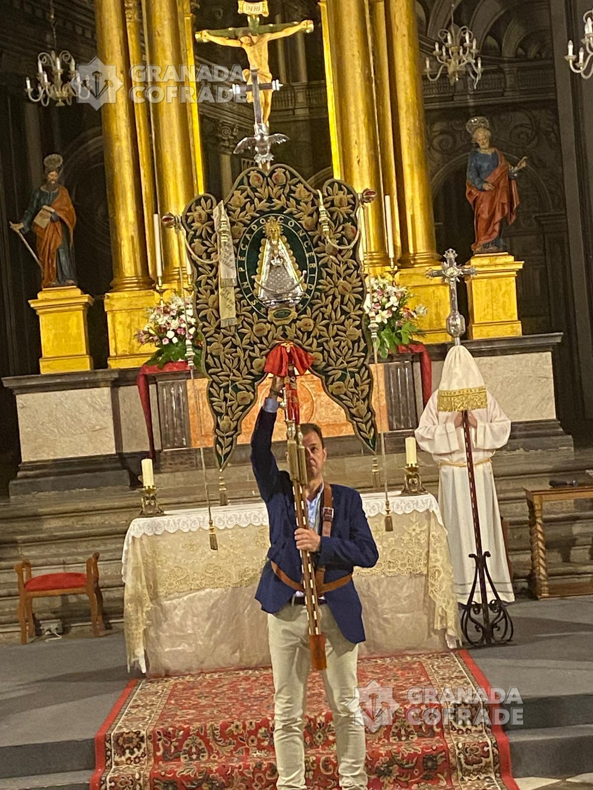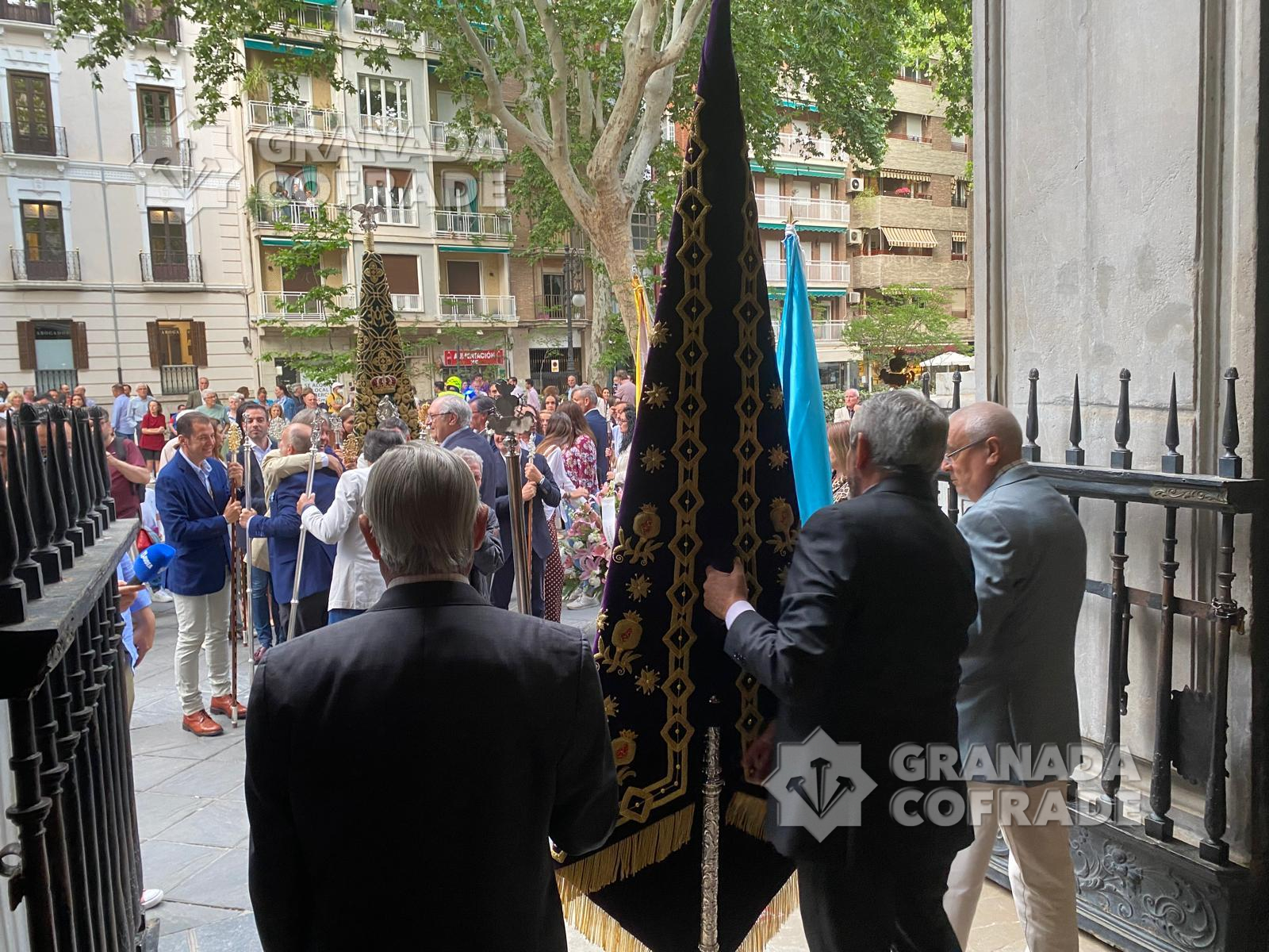 Después, los romeros caminaron por la Carrera de la Virgen con los hermanos turnándose para portar el Simpecado llevado a mano y en dirección a plaza de Mariana Pineda. Nuestro compañero Manuel Sánchez aseguró a la redacción de GRANADA COFRADE que «acompañaron más personas y hermanos que nunca en dirección a la calle San Matías donde fue recibido por la hermandad de Jesús de la Paciencia y María Santísima de las Penas». Luego, por calle Colcha y Reyes Católicos hasta la Plaza de Santa  Ana donde también fue recibido el Simpecado del Rocío por la hermandad de Nuestra Señora de la Esperanza, con unas palabras del consiliario de ambas hermandades, Martín Rodríguez. Finalizó el camino de regreso con la presencia del Simpecado por su entorno, Carrera del Darro y atrio de San Pedro donde fue portado por el mayordomo saliente de este año, Luis Carlos Oriol, hasta el altar mayor. Fue así la despedida del trabajo realizado por el mayordomo que a decir de numerosos rocieros, ha sido un magnífico e impecable trabajo.