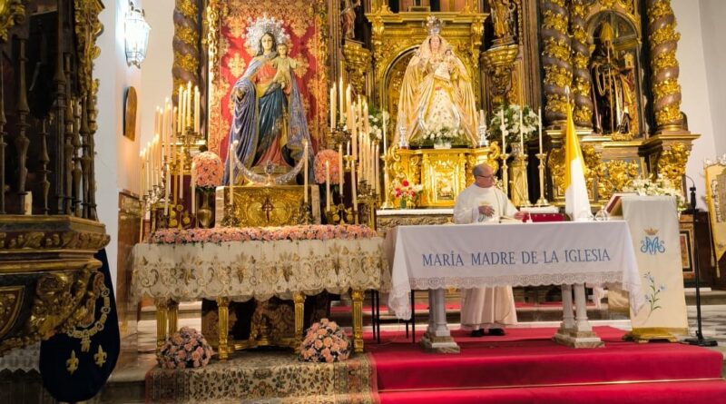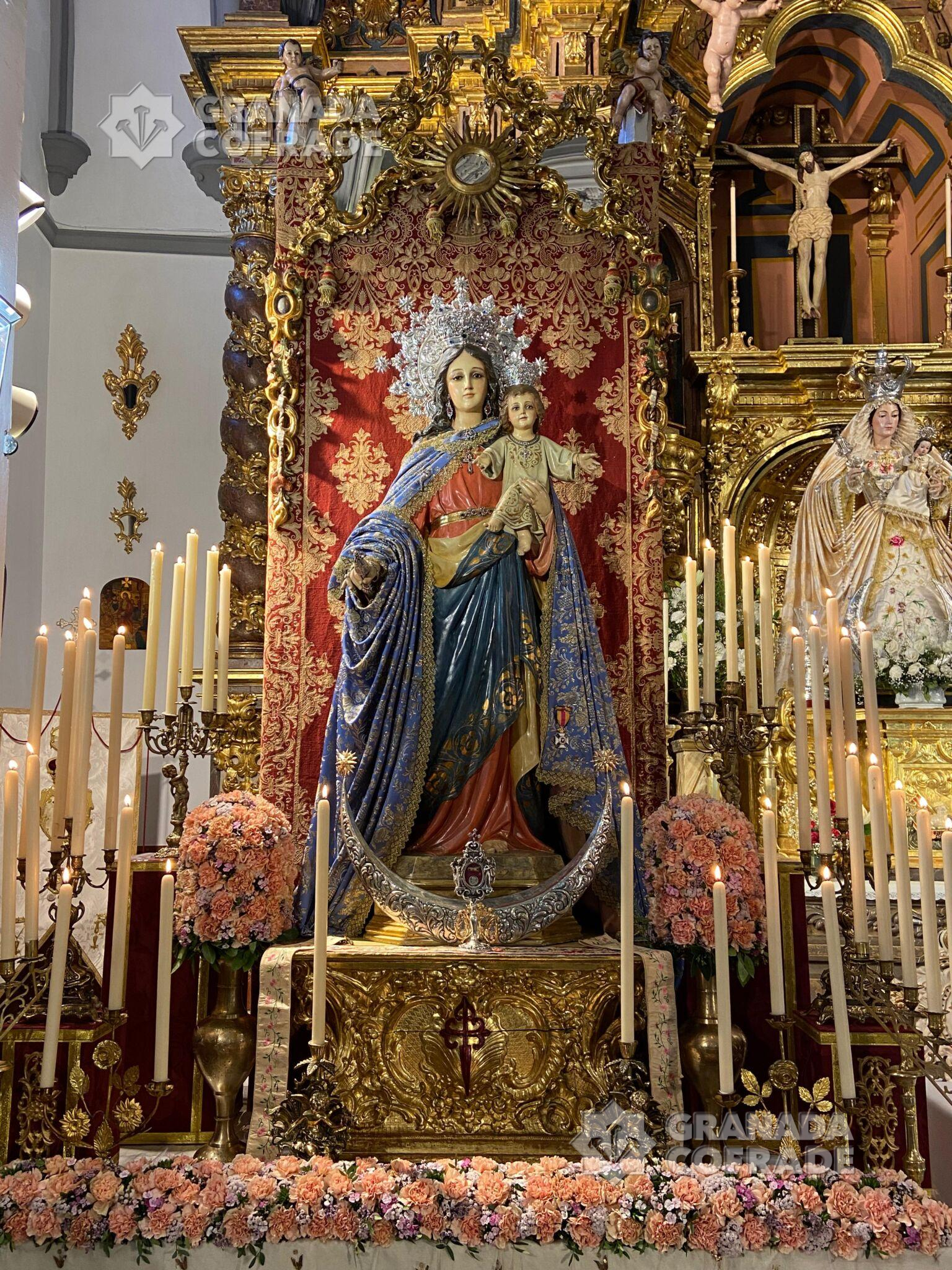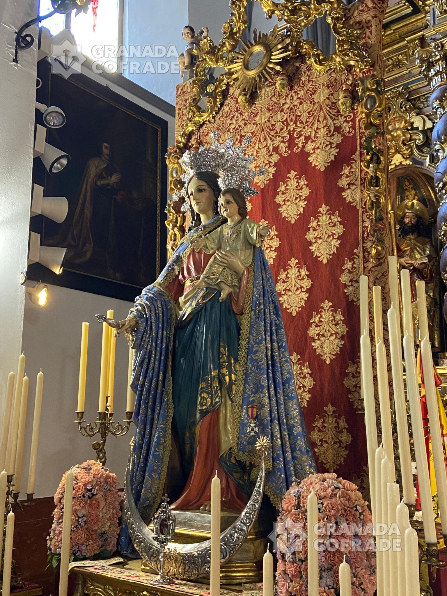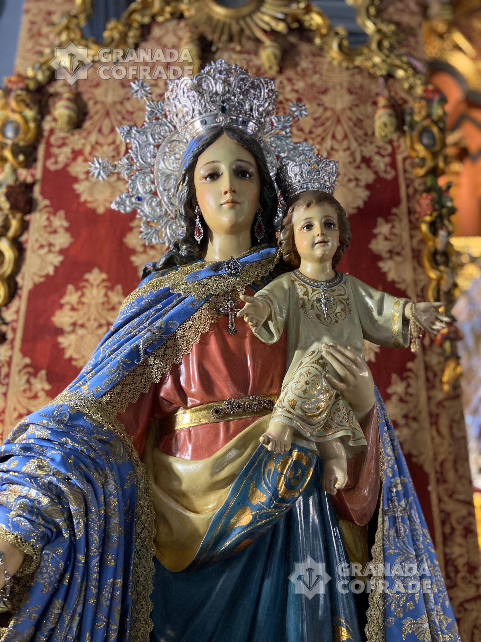 Finalizó ayer el triduo en honor de María Auxiliadora de la Alhambra en el Real Monasterio de la Madre de Dios, de Comendadoras de Santiago, del Realejo. La imagen de la Titular de la Adma-Alhambra se había situado en un altar situado a la derecha del presbiterio, adelantada a un dosel brocado y estrenando un broche de una cruz, donado por unas hermanas de la corporación letífica y la cruz de la Orden de Santiago que lucía el Niño Dios en su pecho, como muestra de cariño a las Madres Comendadoras que acogen a la archicofradía en su monasterio para el triduo y salida procesional.