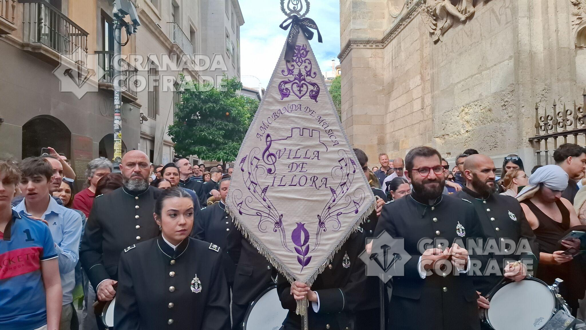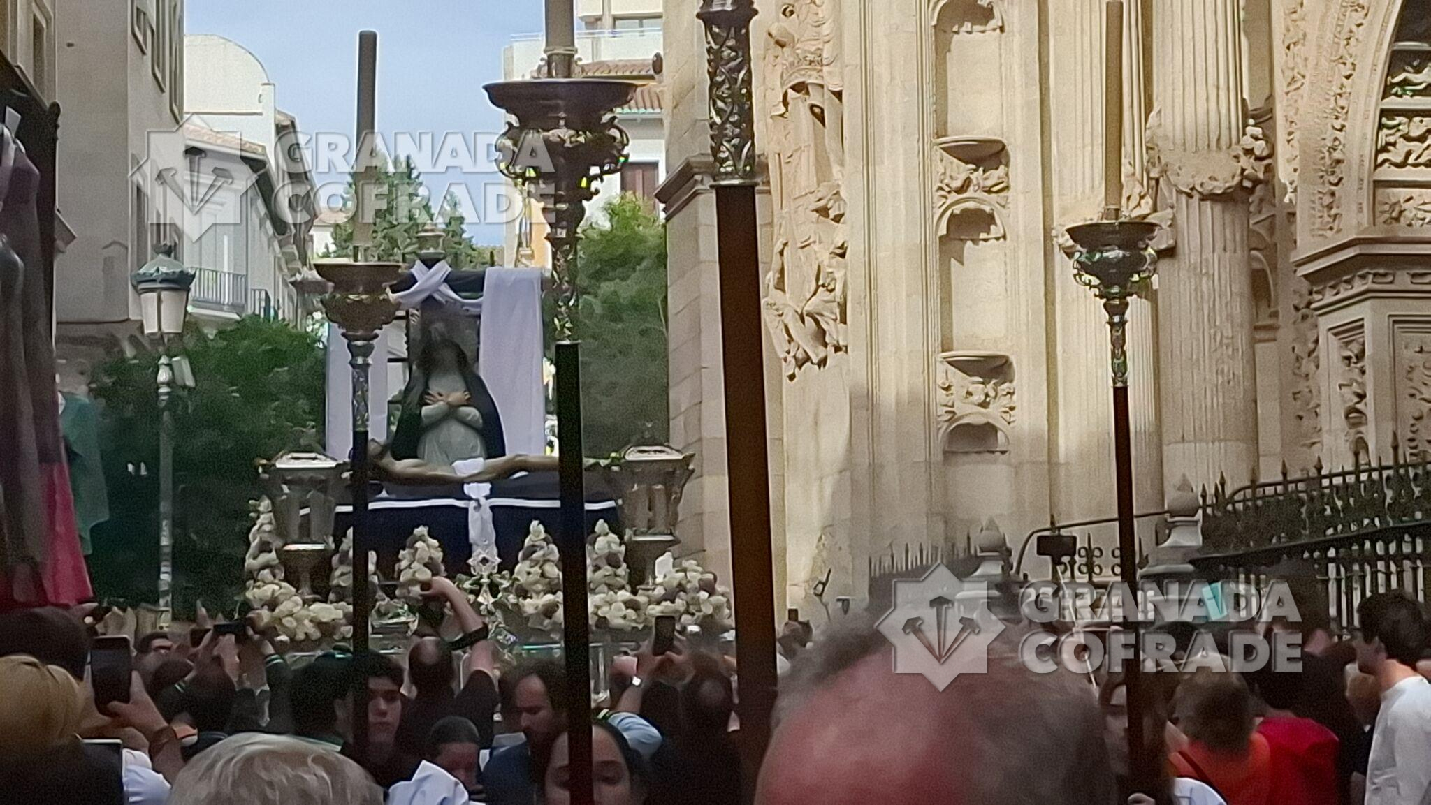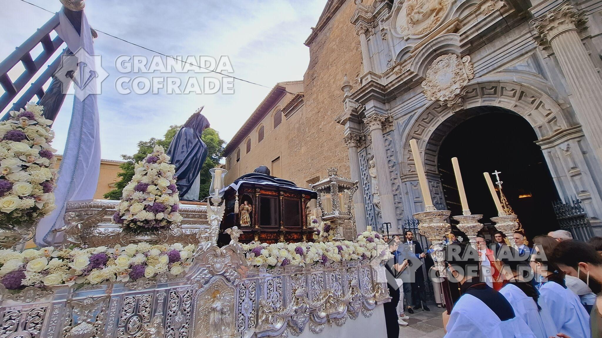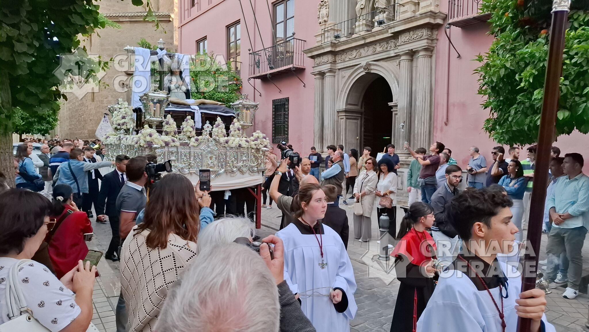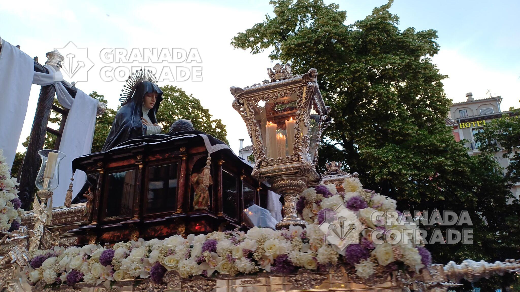 El paso se encontraba exornado con flores blancas y detalles en tonos malvas, rosas y orquídeas entre otras, alumbrado por cuatro faroles de orfebrería y contó la escolta de los Caballeros del Santo Sepulcro y el acompañamiento de la Banda de Música de Illora que interpreto un repertorio de marchas de corte fúnebre y solemne acorde con el rictus de la Hermandad. «Soledad de Santa Ana», de Jaime Moreno, director de la banda, «Soledad de San Jerónimo» «Mater Mea» o «Soledad Franciscana», fueron las primeras ofrendas de música al paso procesional.