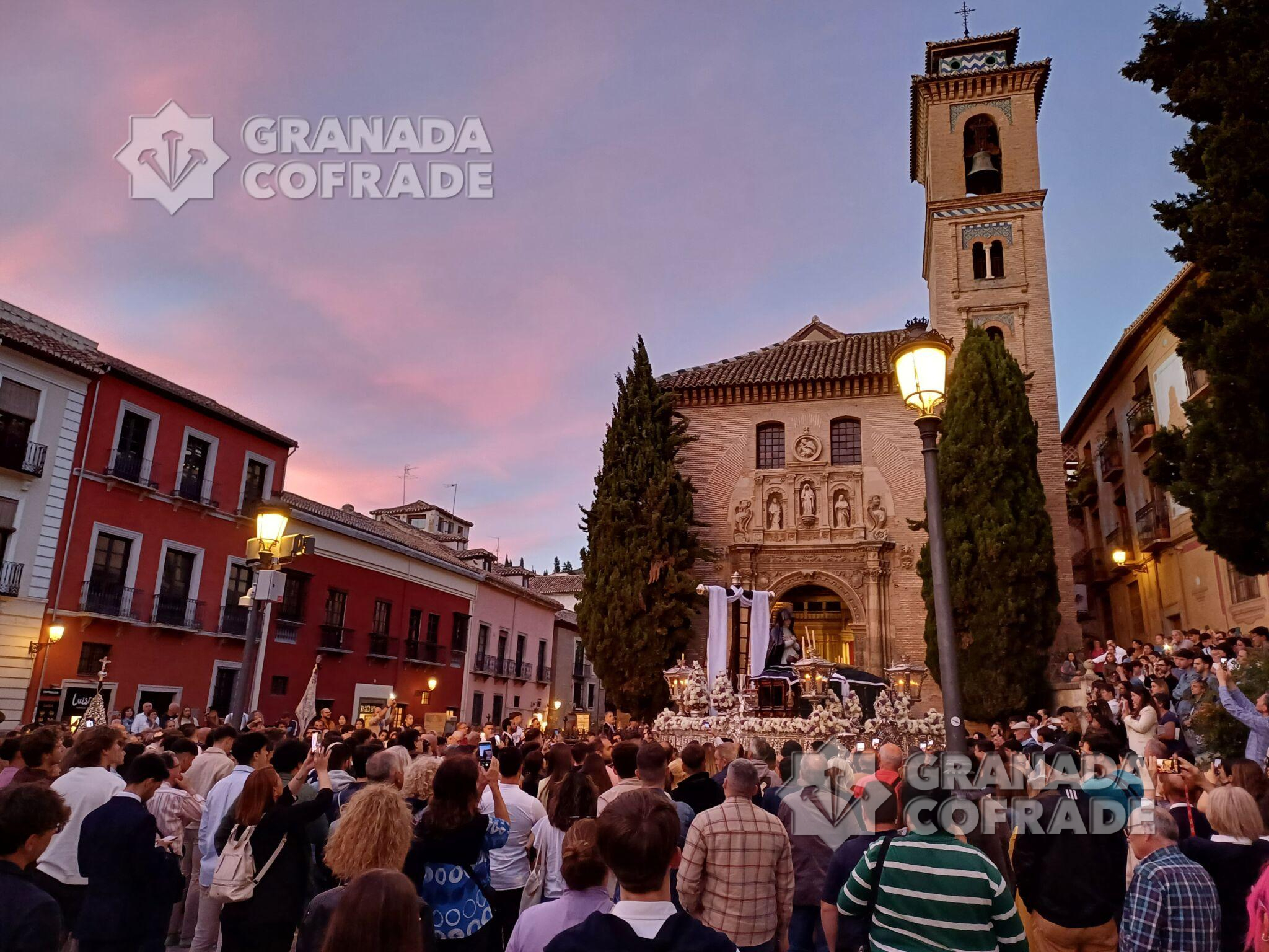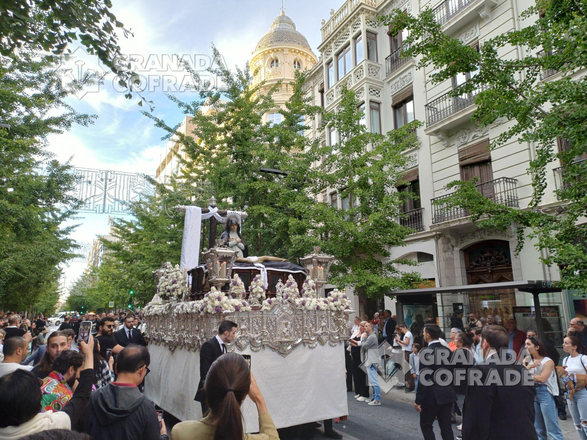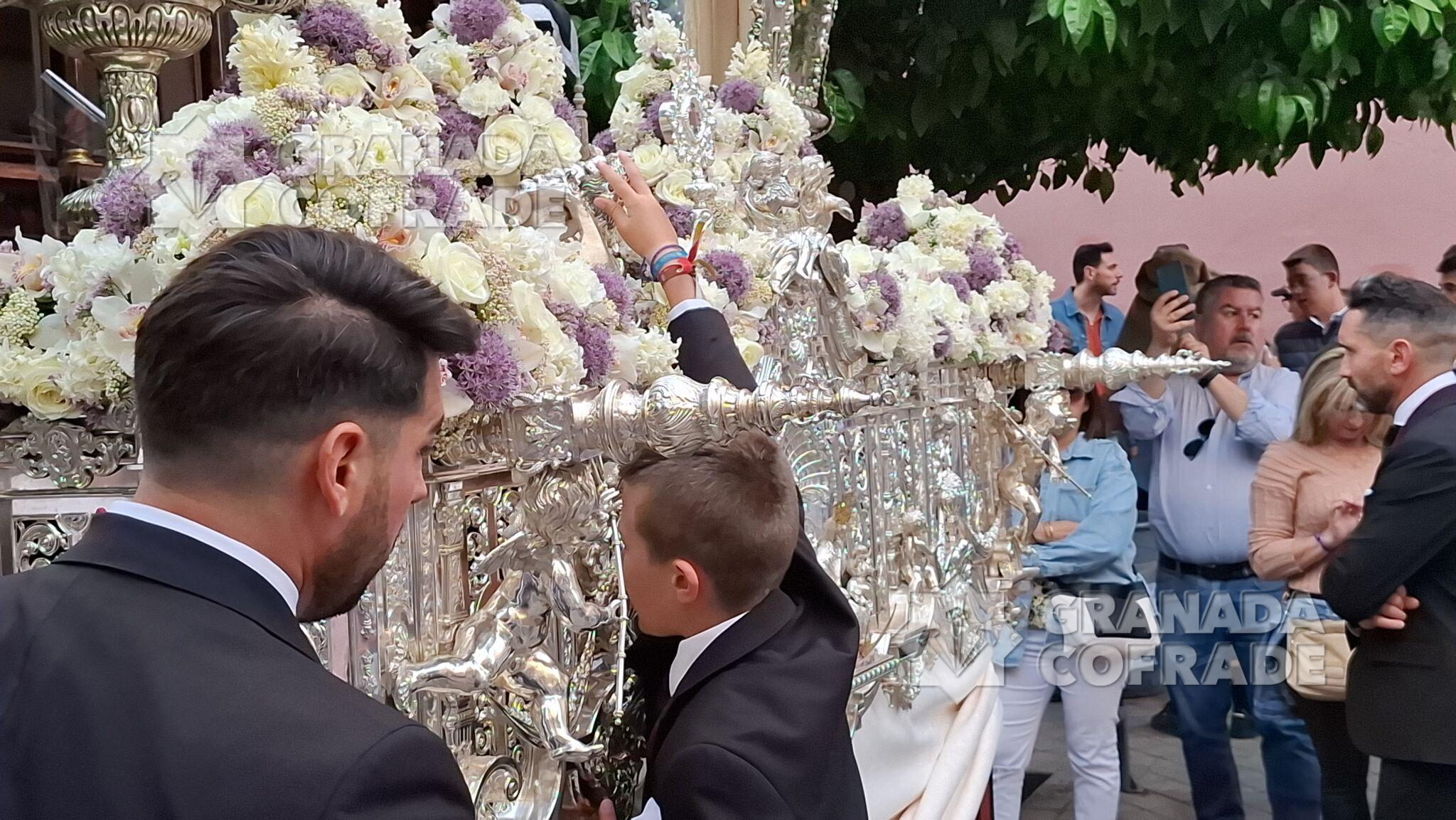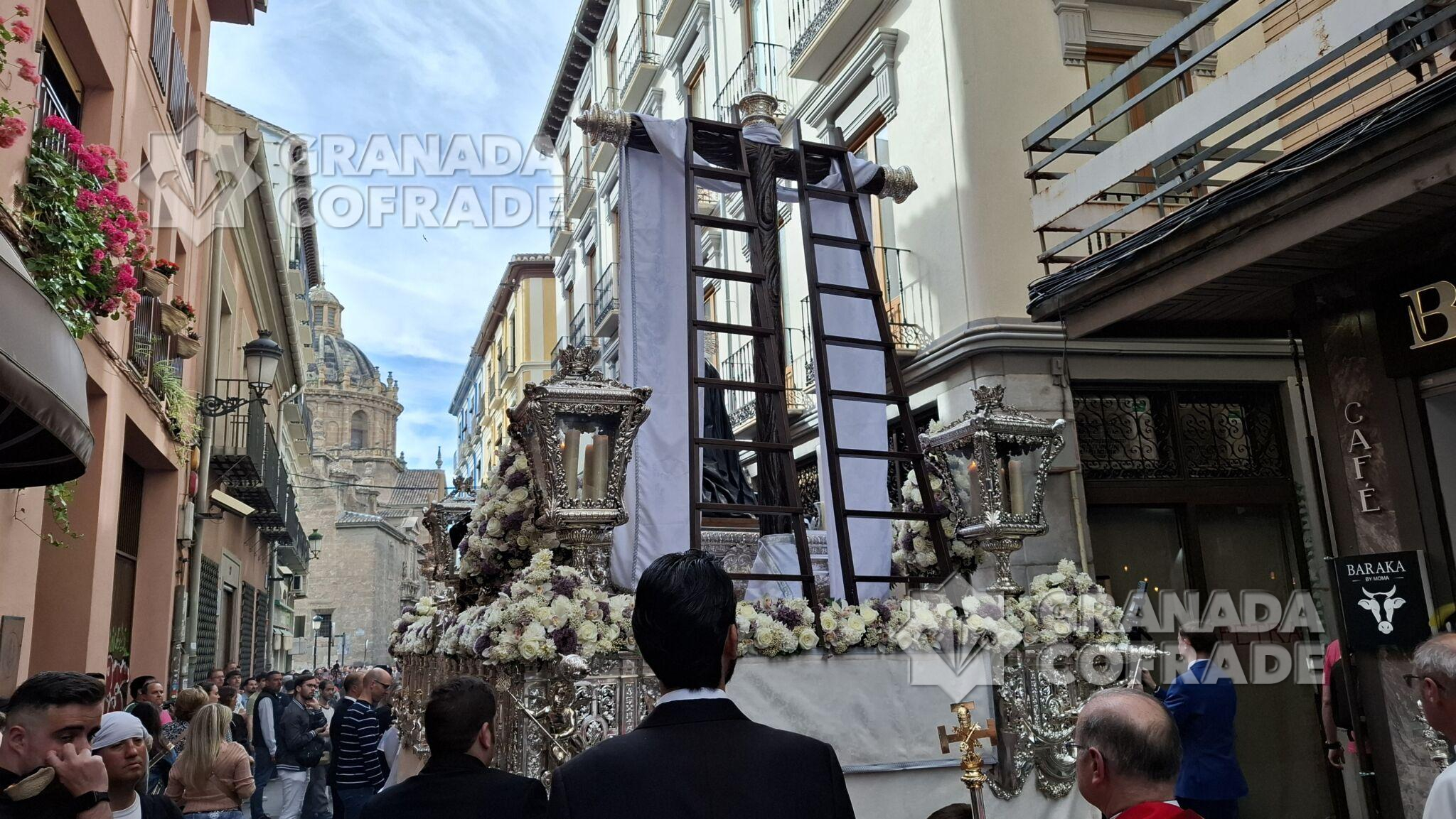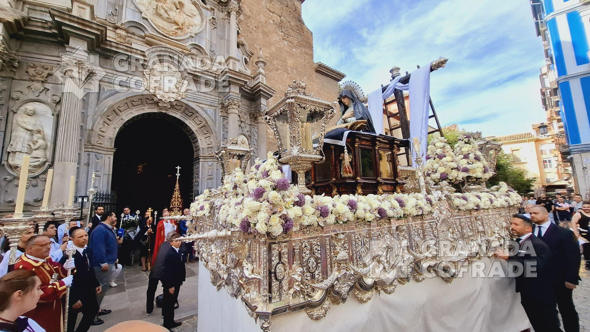 El paso se encontraba exornado con flores blancas y detalles en tonos malvas, rosas y orquídeas entre otras, alumbrado por cuatro faroles de orfebrería y contó la escolta de los Caballeros del Santo Sepulcro y el acompañamiento de la Banda de Música de Illora que interpreto un repertorio de marchas de corte fúnebre y solemne acorde con el rictus de la Hermandad. «Soledad de Santa Ana», de Jaime Moreno, director de la banda, «Soledad de San Jerónimo» «Mater Mea» o «Soledad Franciscana», fueron las primeras ofrendas de música al paso procesional.