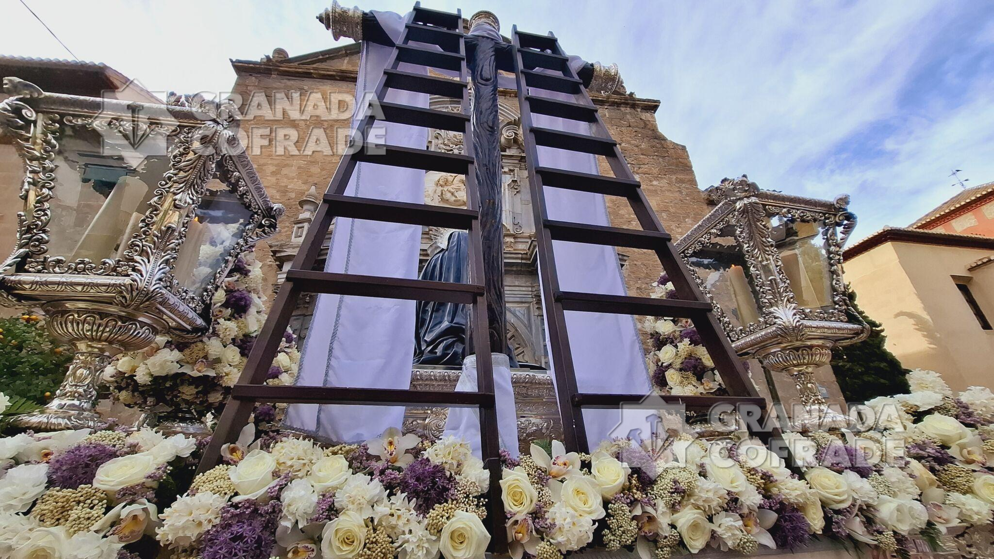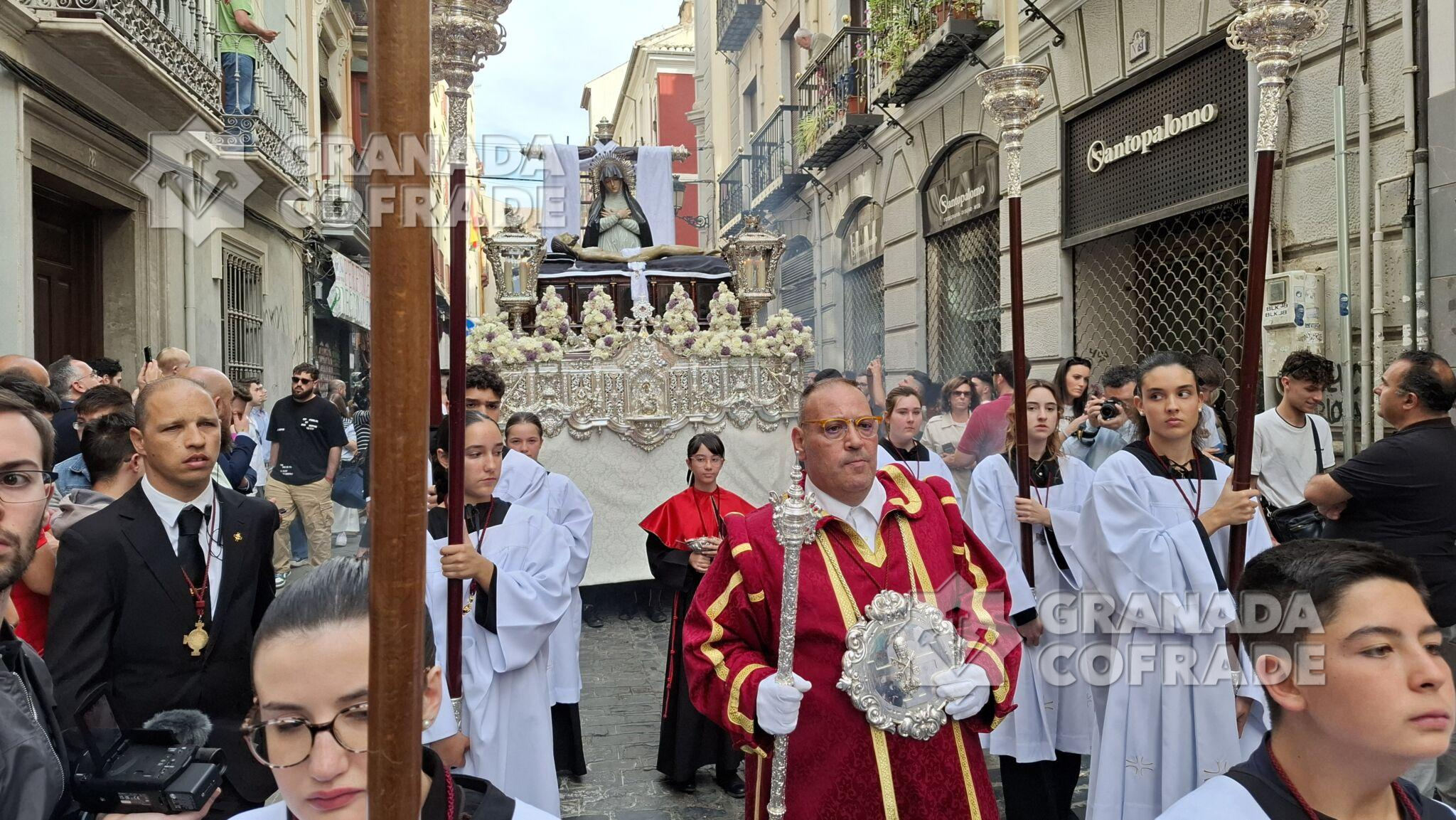 La Virgen de la Soledad y el Señor Yacente compartieron paso procesional. Para esta ocasión tan señalada, el equipo de priostía de la hermandad ideó una una novedosa composición; la Virgen de la Soledad y el Señor del Santo Sepulcro juntos en el mismo paso, el de nuestra Señora de la Merced.
