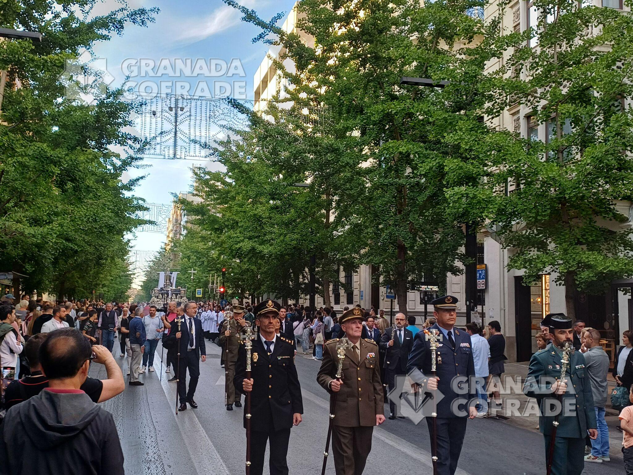 En el tramo de autoridades destacó la presencia del Jefe del MADOC, el teniente general De la Esperanza: la concejal de Fiestas Mayores y Protocolo, Carolina Amate, y el delegado de Justicia, Administración Local y Función Pública en Granada, Luis Recuerda.