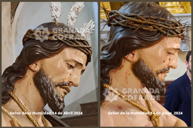 Lo que más sorprendió ayer a los hermanos y cofrades que en gran números visitaron el templo de Santo Domingo fue encontrar la talla con pestañas, cosa que antes no tenía y que ha repuesto Pablo Fernández Hurtado, escultor y artista granadino. También llama la atención de manera positiva la existencia de espinas en la corona. «Es una corona original de la época de la realización de la imagen, de cordel, que se ve que en su día tuvo espinas añadidas pero que debieron ir perdiéndose y tan sólo se conservaban algunas pocas. Hemos podido conseguir de Cádiz» recuerda el restaurador. La imagen se encontraba en buen estado en líneas generales, no tenía repintes ni ataque de xilófagos por lo que la tranquilidad era máxima. En tan sólo dos meses y un día se ha conseguido afrontar la limpieza pormenorizada, eliminar algunas grietas y reponer la policromía sin afectar a la imagen en nada más. «Estamos muy satisfechos por el resultado del trabajo desarrollado y la mayoría de los hermanos así nos lo trasladan», indicó el hermano mayor, Germán Bolivar, a nuestra web. «Ha sido un trabajo muy agradecido que ha afrontado Óscar Martín, sigue siendo el mismo y hemos descubierto gracias a la limpieza determinados detalles de la policromía que estaban perdidos y ahora parece que tiene una mirada más dulce. Ahora resalta más la presencia humana del sufrimiento de Jesús». Bolivar manifestó su preocupación por la reposición de las pestañas «ya que actualmente no hay ningún hermano que recuerde al Señor con pestañas y teníamos reparo para resolverlo, pero afortunadamente ha quedado muy bien y resalta más su semblante y su mirada», asegura el máximo responsable de la cofradía.