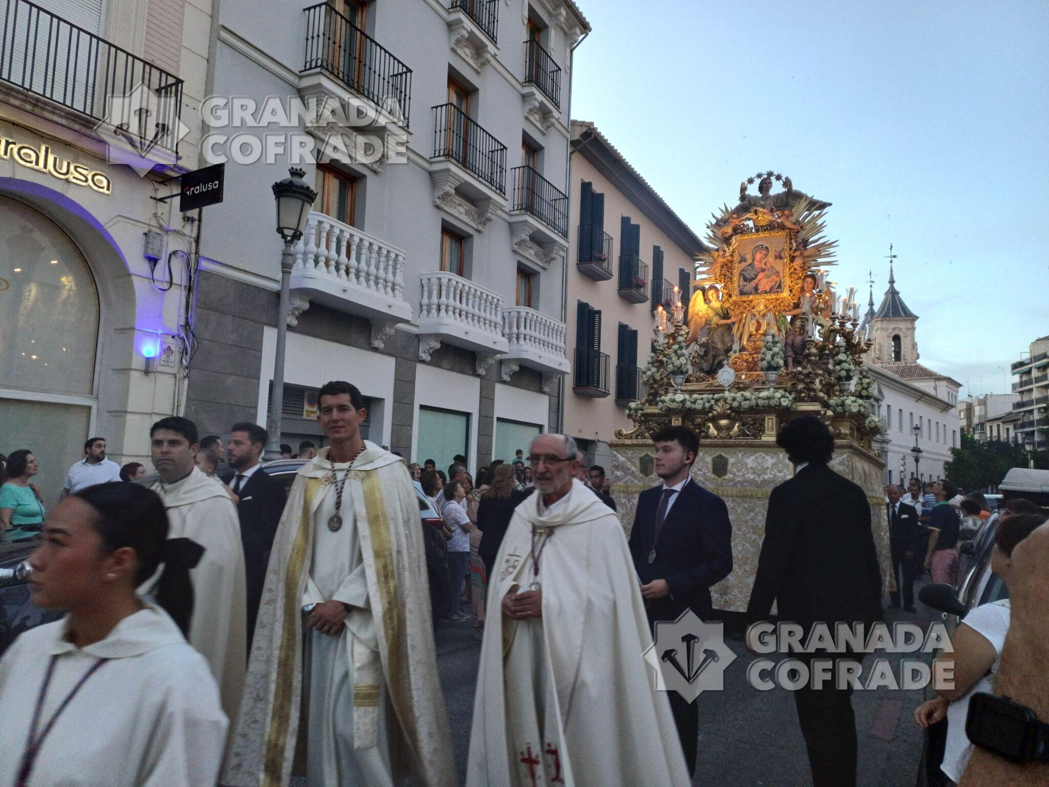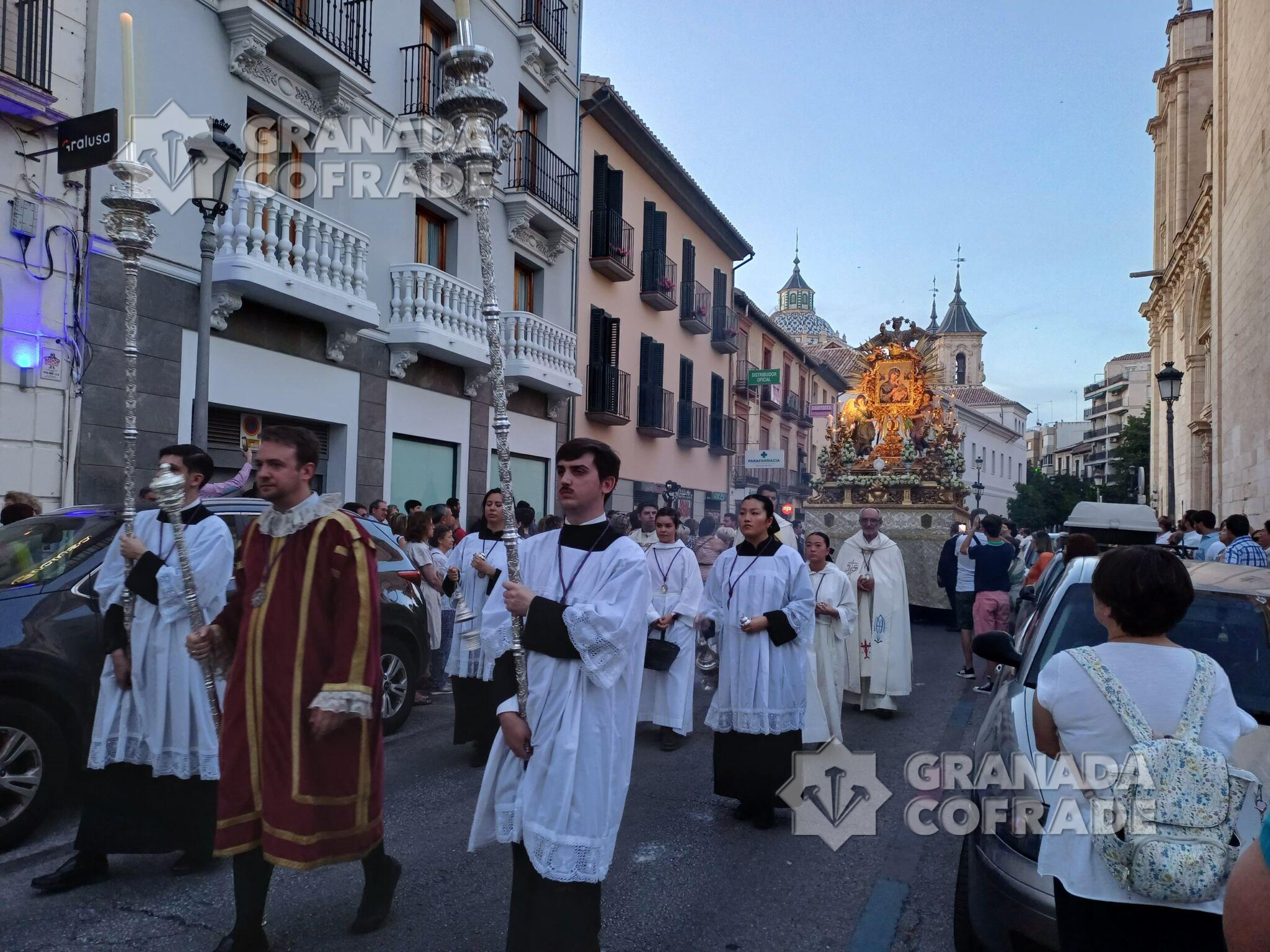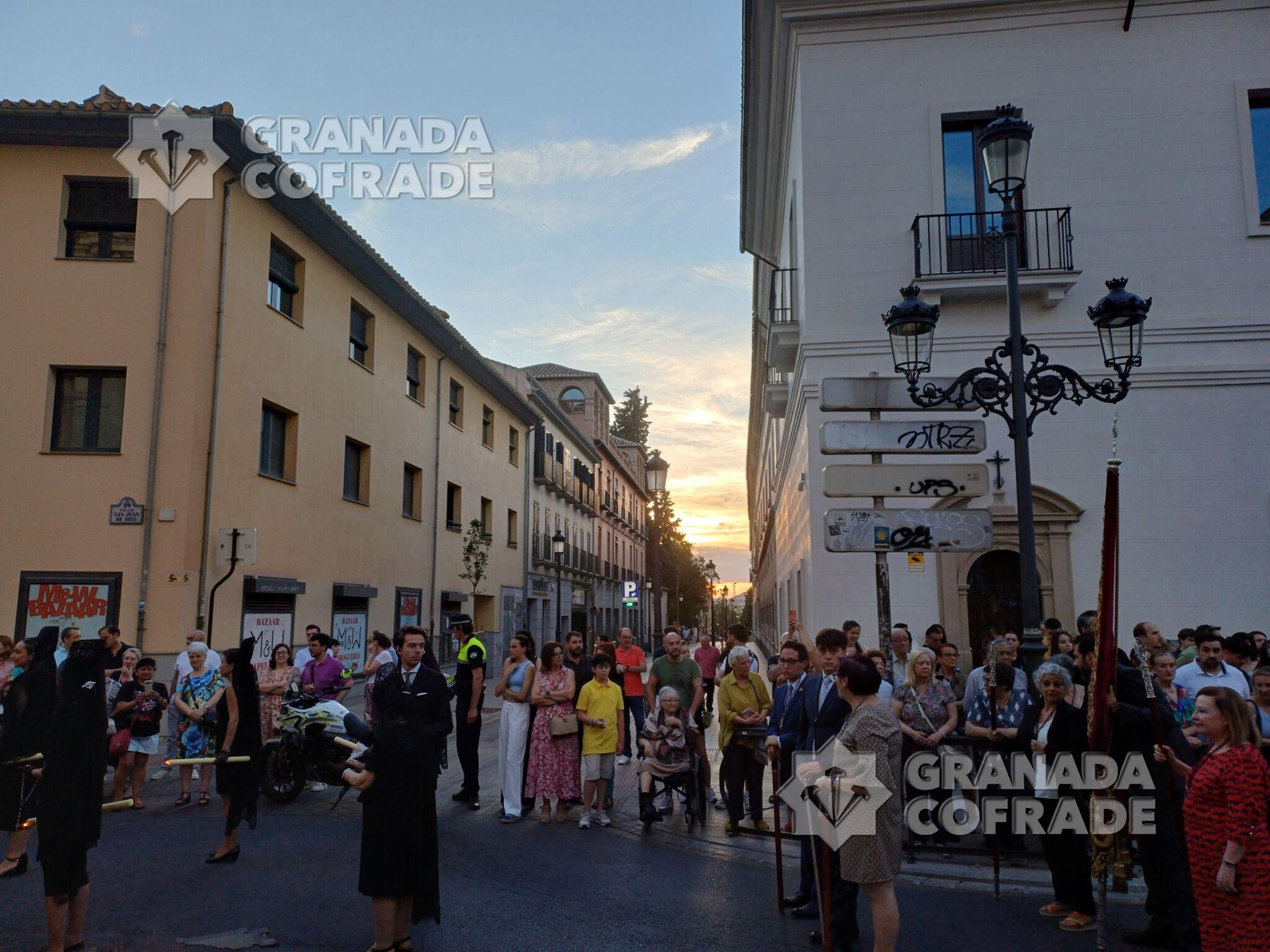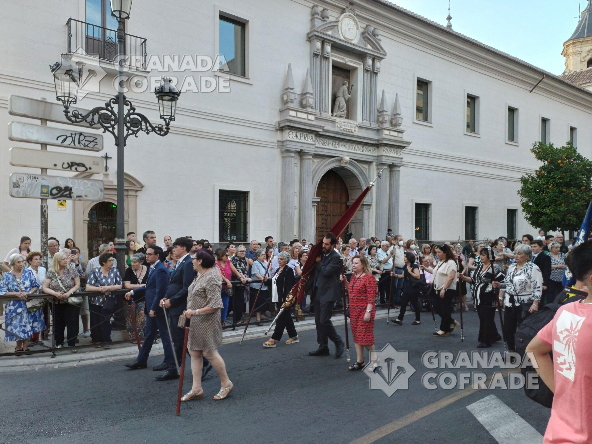 Tres horas duró el recorrido de la procesión de Nuestra Señora del Perpetuo Socorro que resultó muy arropada de público y fieles que permanecieron junto al venerado Icono de la Virgen en su paso de 1924, obra de Navas Parejo. Tras la celebración del octavo día de Novena en el interior del Santuario Redentorista, partió el cortejo abierto por la cruz alzada del Santuario Mariano. Le seguían devotos del Icono y de la devocion mariana al Perpetuo Socorro, seguido de niños vistiendo sus trajes de Primera Comunión. El cortejo se veía acompañado por diez hermanas de la corporación vestidas con mantilla negra y la participación de las representaciones de la hermandad de Jesús Atado a la columna, de Santa Fe; la hermandad del Cristo del Trabajo, del Zaidín, y la de la Entrada de Jesús en Jerusalén. Cerraba la comitiva que precedía al paso procesional la presidencia con su máximo responsable, Jesús Pulido Chacón, y el superior de la comunidad Redentorista en Granada, Laurentino Pineda y miembros de la misma. Estaba presente tambièn una representación de los colegiales del Perpetuo Socorro.