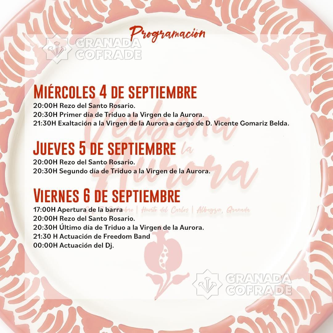 Las actividades comenzarán el miércoles 4 de septiembre, con el inicio del Triduo en honor a la Virgen de la Aurora, que continuará durante el jueves 5 y el viernes 6, dando inicio cada día a las 20h con el rezo del santo rosario y la celebración de la santa misa a las 20:30h. Al término del primer día de triduo será la exaltación a la Virgen de la Aurora, que en el presente año correrá a cargo de Vicente Gomariz Belda.
