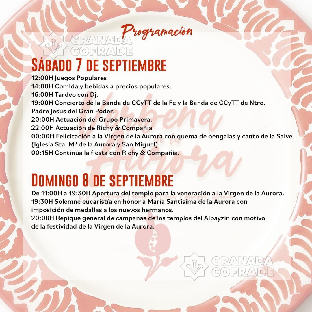 Los juegos populares y el cuentacuentos para los niños y niñas la mañana del sábado, las actuaciones de las bandas de CCyTT de la Fe y el Gran Poder la tarde del sábado y la felicitación a la Virgen de la Aurora con la quema de bengalas y el canto de la salve en la medianoche del sábado completan la programación de esta edición, que finalizará el domingo 8 de septiembre, festividad de la Virgen de la Aurora, con el repique de campanas de los templos de barrio y la solemne Eucaristía en su honor a las 19:30h.