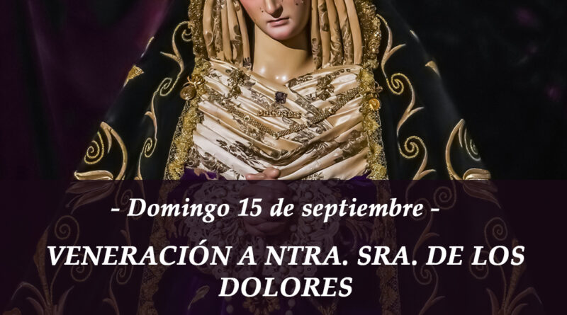 Mañana domingo 15 de septiembre, conmemoración de  la festividad de los Dolores Gloriosos de la Santísima Virgen María,  la Patrona de Maracena, Nuestra Señora de los Dolores, será expuesta en Solemne Veneración tras el rezo del Santo Rosario, que dará inicio a las 19:30h, seguido de la celebración de la Eucaristía a las 20:00h.