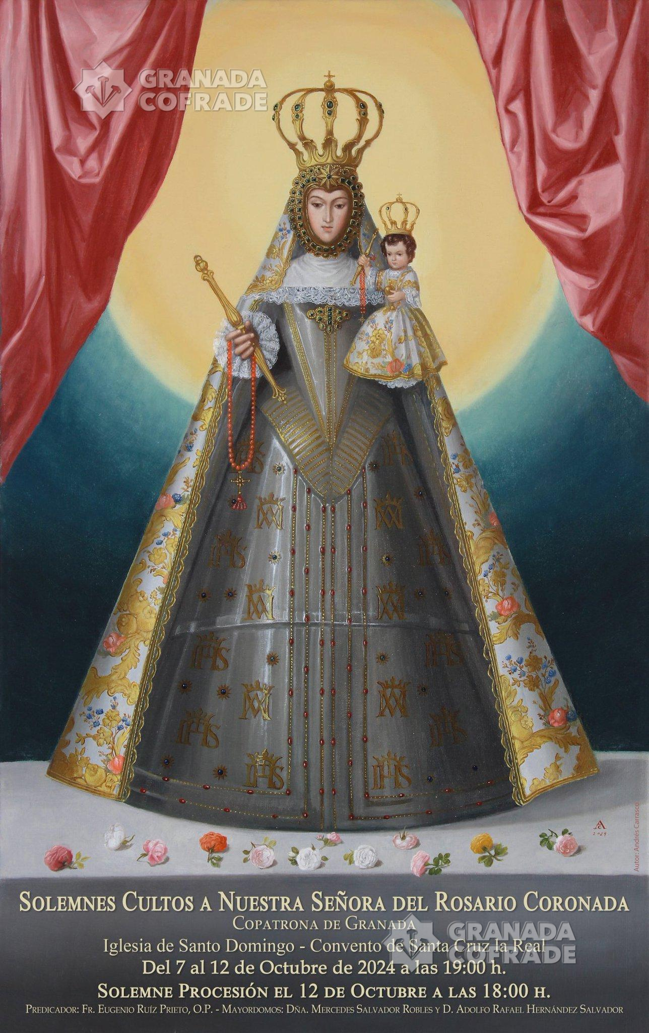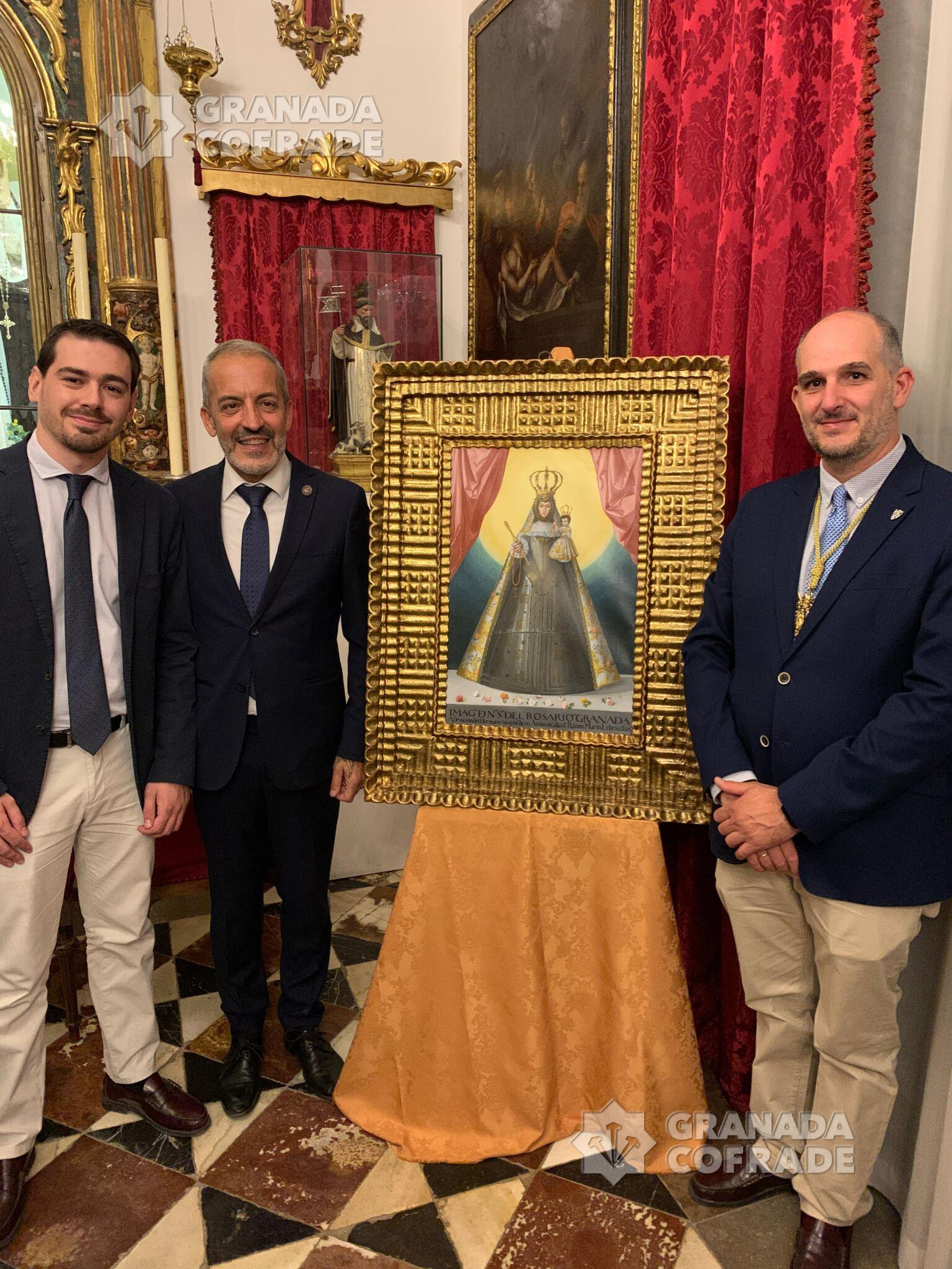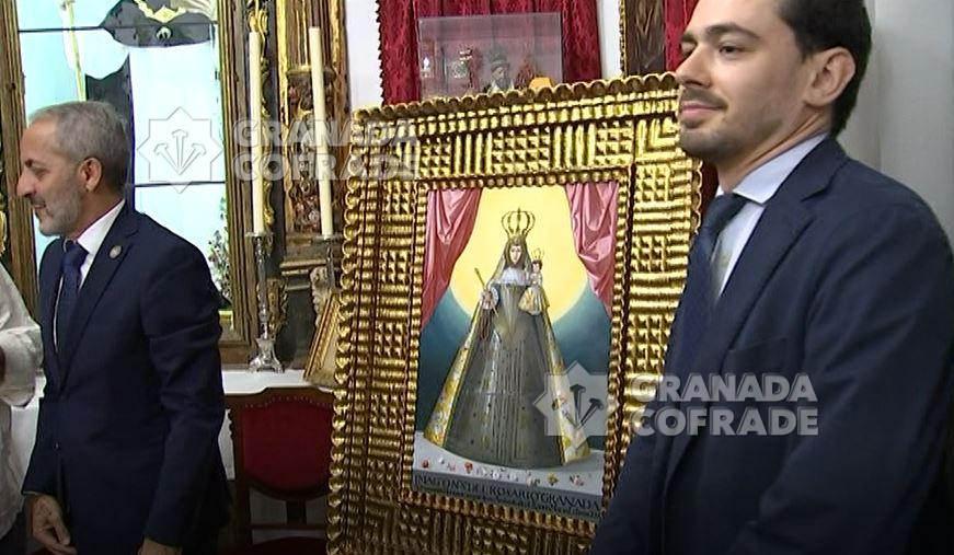 Se trata de una pintura devocional a modo de “verdadero retrato”, presidido por la imagen de la Copatrona de Granada, ataviada con su característico vestido de plata y piedras preciosas, así como un manto de brocado blanco. La estética que presenta está basada en las fuentes gráficas y documentales del siglo XVIII que existen sobre la Virgen del Rosario. El sagrado simulacro está sobre un altar, en el que hay rosas esparcidas que reprendan las ofrendas y plegarias de los granadinos a los pies de la Santísima Virgen. Destacan dos cortinajes de color carmesí que enmarcan la imagen, al igual que el esplendor que ocupa buena parte del fondo.