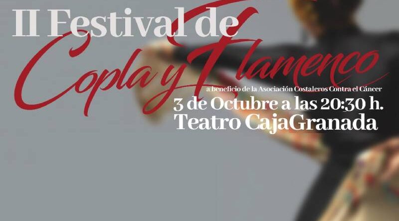 La Asociación granadina «Costaleros contra el Cáncer» organiza una gala benéfica bajo el epígrafe «II Festival Copla y Flamenco». Tendrá lugar el día 3 de octubre, jueves, a las 20.30 horas en el Teatro CajaGranada del Centro Cultural CajaGranada, en Avenida de la Ciencia 2 de nuestra capital y el precio de la localidad es de diez euros. La Gala benéfica de Copla y flamenco en la que participan artistas Granadinos tiene el objetivo de recaudar fondos para Asociación Costaleros contra el cáncer. Esta iniciativa se lleva a efecto gracias al apoyo del programa «Ayudamos a los que ayudan. Cesión de espacios» de CajaGranada Fundación y Caixabank  y se puede usar para ello el Bono Cultural Joven.