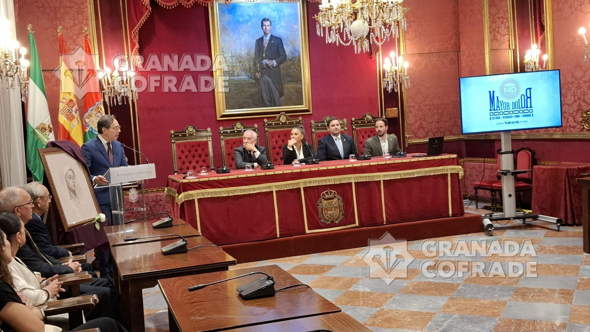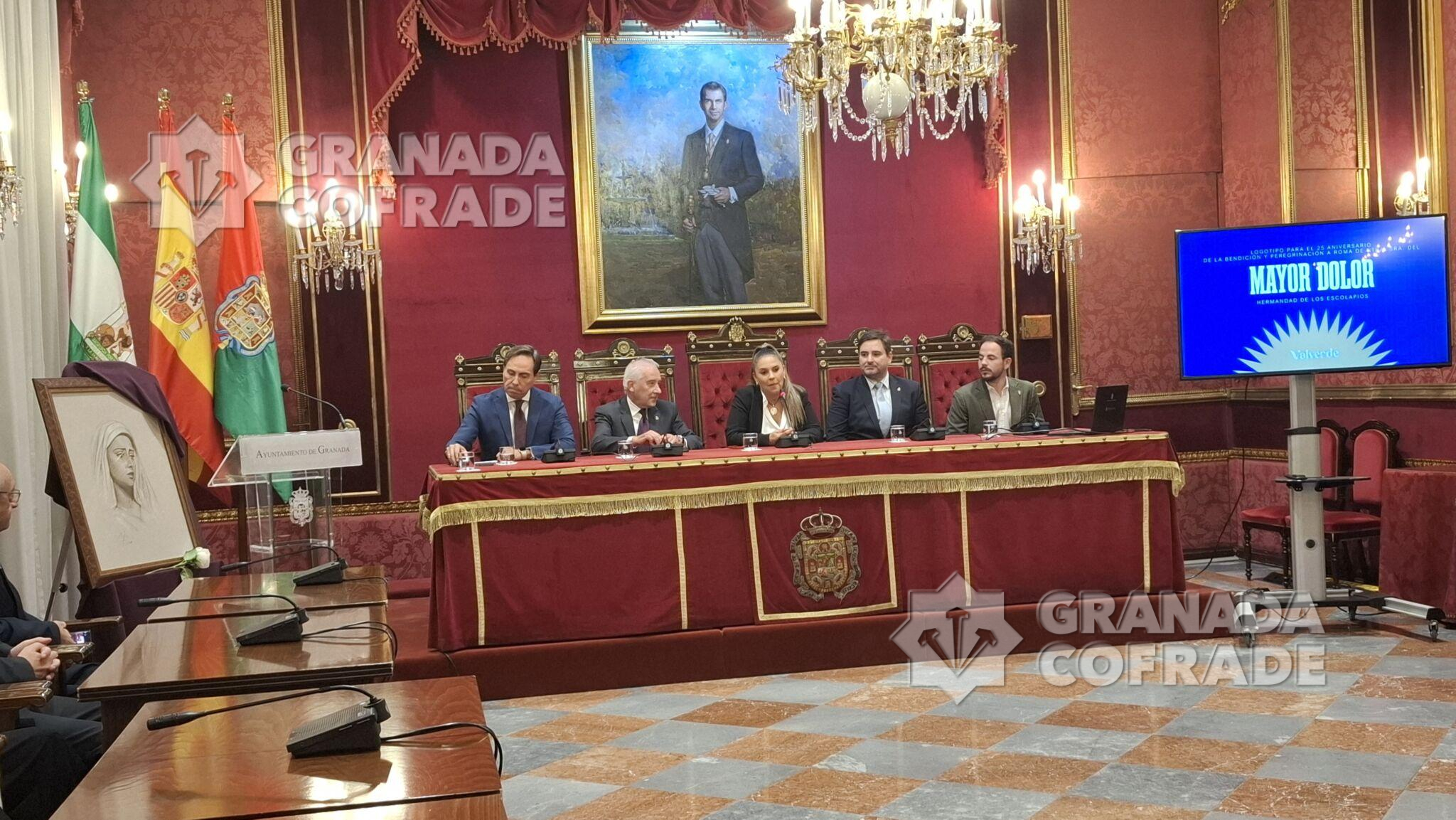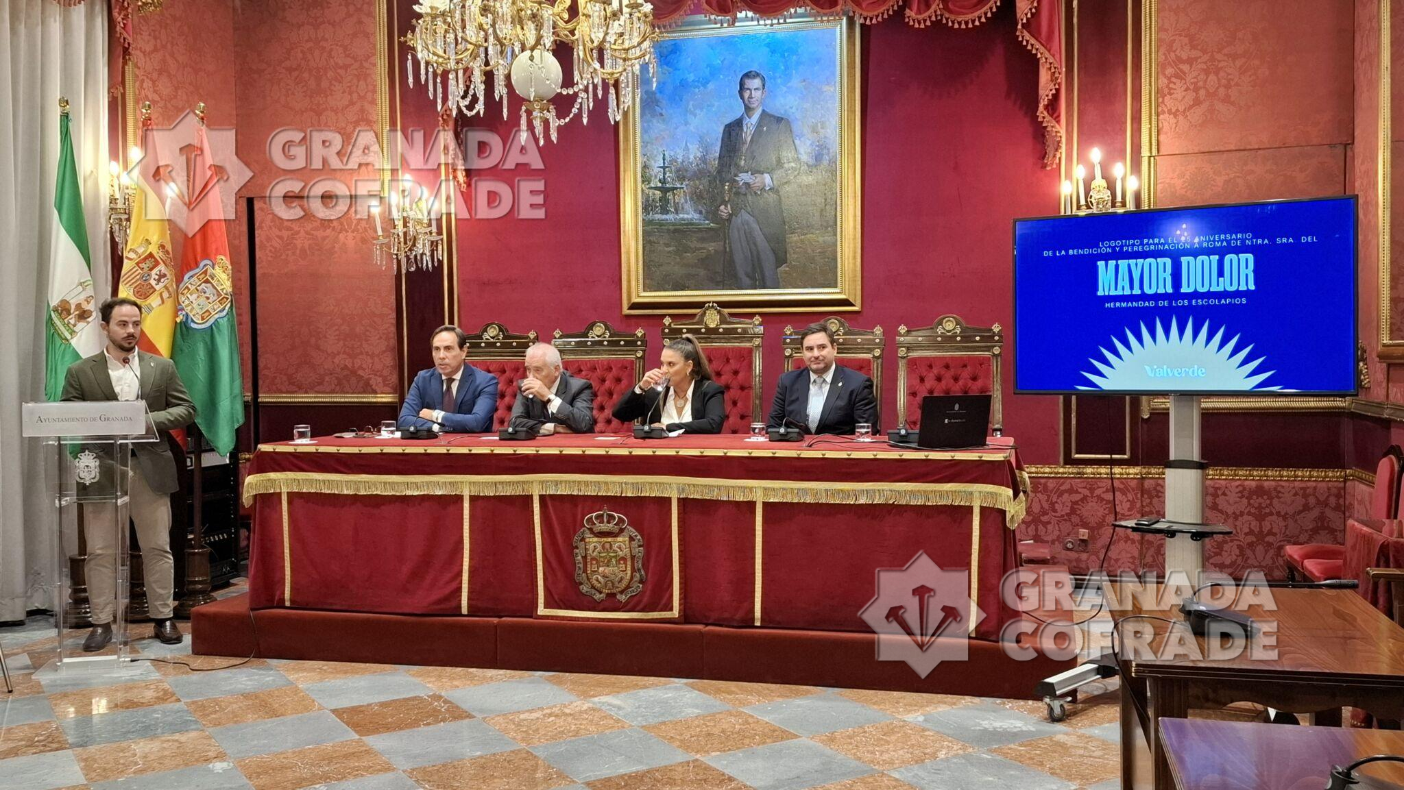 La hermandad de los Escolapios inicia en unos días los actos del vigésimo quinto aniversario «de una celebración doble, la bendición de la Virgen del Mayor Dolor y la peregrinación a Roma con el paso de palio de nuestra Titular. Dos fechas, el 20 de febrero y el 18 de junio que permanecen unidas a la memoria de la cofradía, como indicó el comisario de los acto del aniversario, José Luis Carmona. Fue la hermana mayor, Fátima Sánchez, la encargada de presidir el acto en el Salón de Plenos del Ayuntamiento, lleno de público y hermanos de la corporación. Le acompañó en la presidencia José Valverde Ruiz, autor del logotipo del aniversario que se centra en las palabras «Mayor Dolor» cuyas dos letras iniciales y finales marcan el nombre de Roma, ciudad protagonista de aquella efeméride, como indicó en la presentación. El dibujo de la solería de San Juan de los Florentinos, de Roma, «se convierte en una cenefa que nos recuerda el templo del que partió y al que regresó el cortejo de la peregrinación».