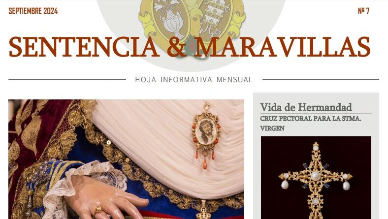 «Diez semanas nos separan de la última convocatoria de la Hermandad en el mes de junio, un tiempo para el descanso y la reparación de fuerzas que deseamos haya sido realmente provechoso espiritual y físicamente para nuestros hermanos. Septiembre llega con fuerza» dice el boletín informativo «Sentencia y Maravillas» en su portada. Una publicación que alcanza su número 7 y que se distribuye vía on line a sus hermanos, elaborada por la Vocalía de Comunicación de la cofradía de la parroquia de San Pedro y San Pablo.