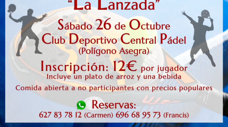 La hermandad Sacramental de la Sagrada Lanzada convoca el IX Torneo de Pádel «La Lanzada». Así, un año más, dedican esta jornada a todas las personas aficionadas al pádel, para pasar un día de hermandad y deporte, contando con los mejores premios. Este se celebrará el próximo sábado 26 de octubre en jornada matinal en el Club Deportivo Central Pádel (Polígono Asegra).