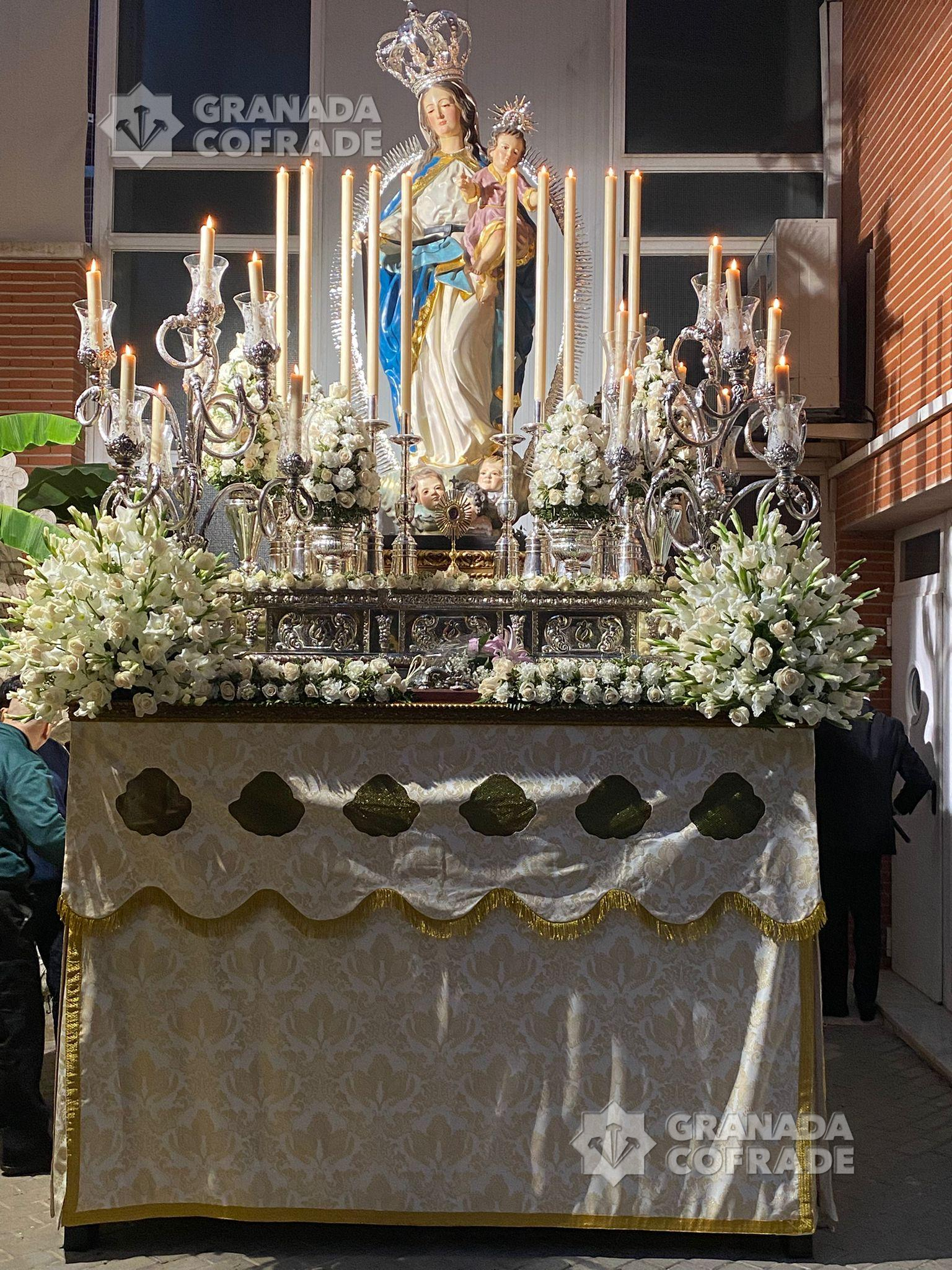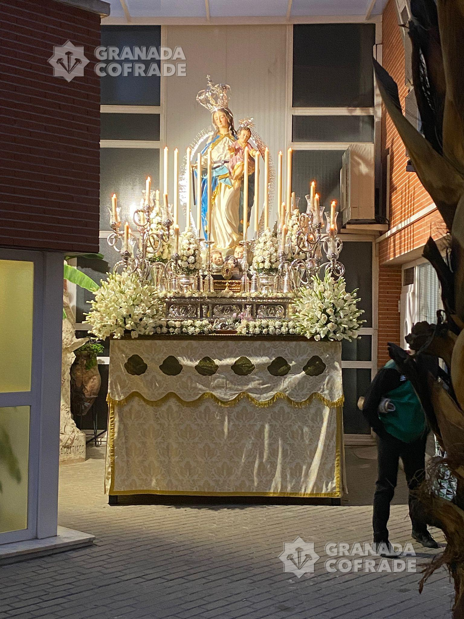La imagen de la Santísima Virgen quedó resguardada de la lluvia en la parte trasera del templo del barrio de la Rosaleda y la junta de gobierno que preside Eduardo de la Plaza adelantó a las cinco de la tarde «que las previsiones no nos permiten realizar estación de gloria tal y como estaba previsto». De esta manera la imagen en el paso, adornada con rosas blancas y gladiolos en las esquinas además de otras especies en jarras y friso.