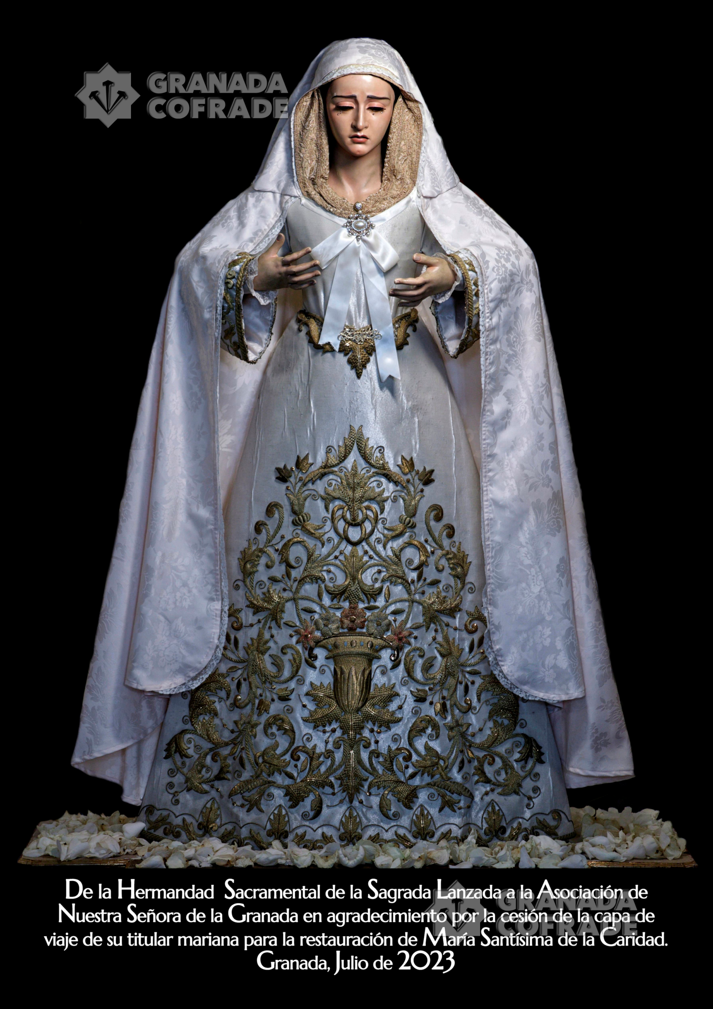 En el primer día del Triduo a Nuestra Señora de la Granada , celebrado en la Parroquia de San Isidro el hermano mayor de la Hermandad Sacramental de la Sagrada Lanzada, Enrique Manuel Trujillo, hizo entrega de un cuadro de María Santísima de la Caridad al presidente de la Asociación de la Granada, Ernesto Gómez. Este gesto se realizó en agradecimiento por la capa de viaje que fue utilizada en la restauración de María Santísima de la Caridad, llevada a cabo el año pasado en el taller de Óscar Martín y Ana López .