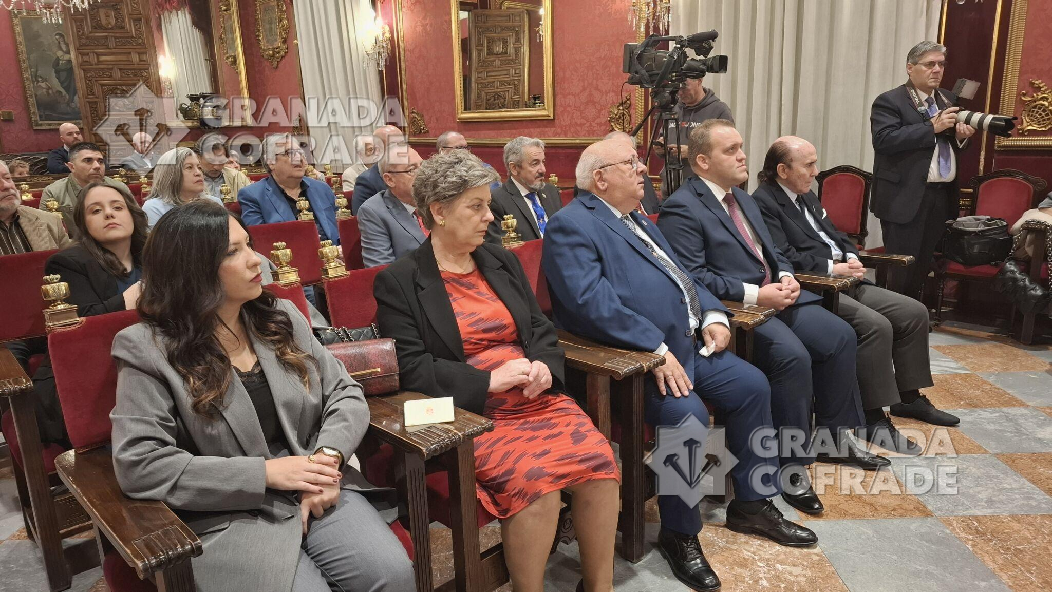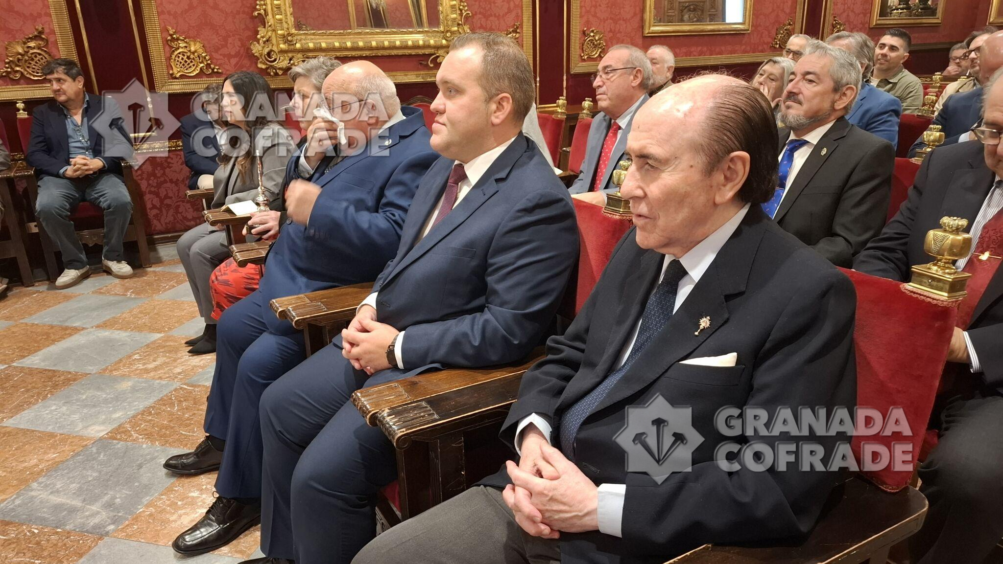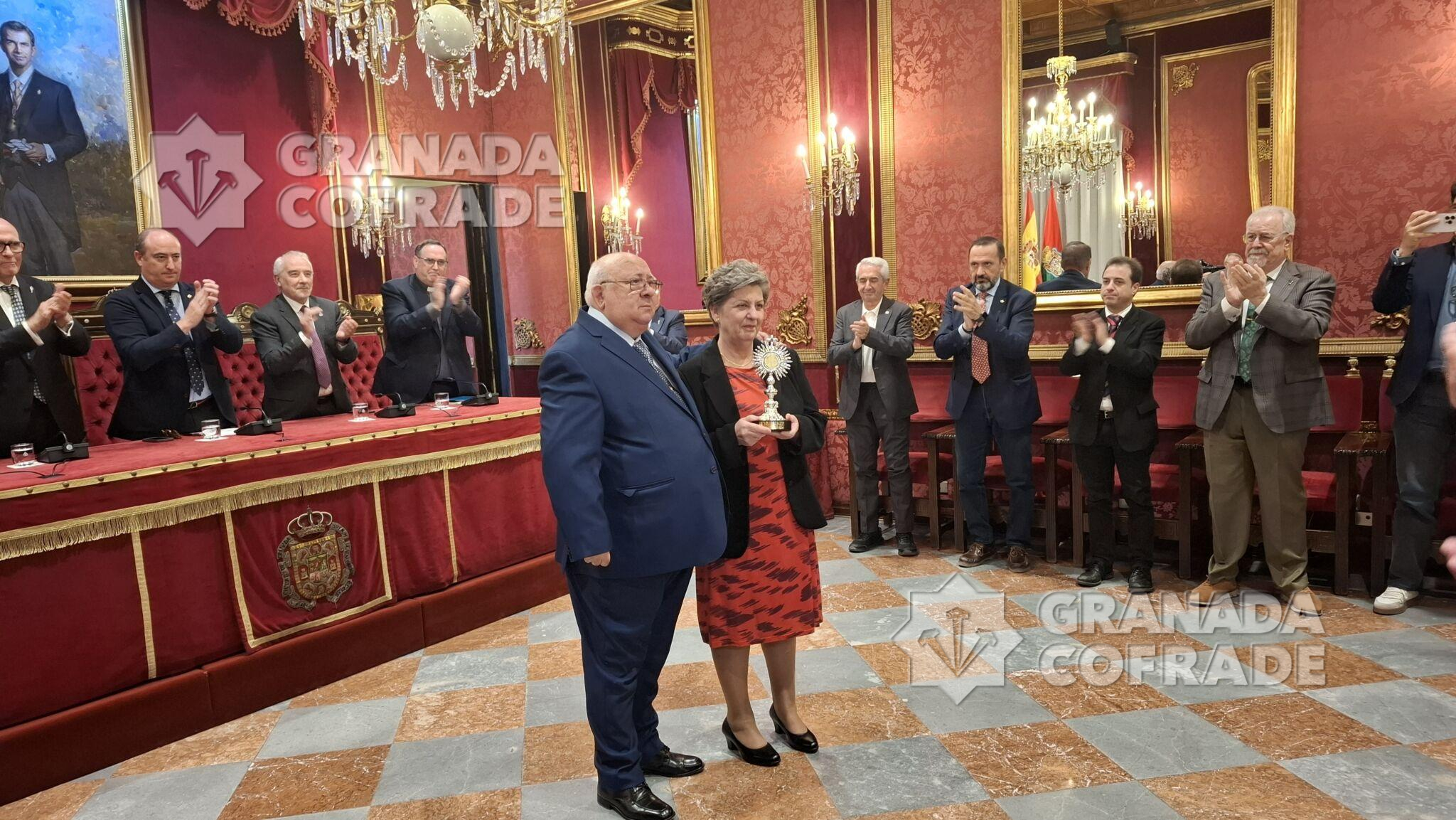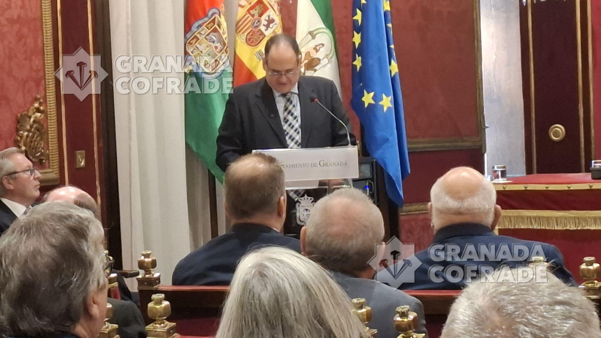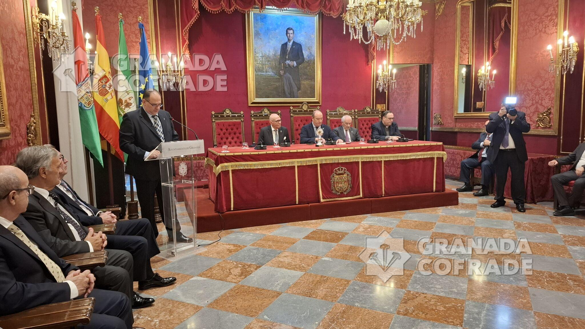 El Salón de Plenos municipal fue el lugar donde se desarrolló el acto de reconocimiento al “capataz más prolífico de la historia granadina y al que tanto le debemos”, señaló el presidente de la Asociación, Enrique González Gamero después de ponerlo en sus manos. Capataz de la hermandad de los Favores, de la cofradía de la Aurora, de la del Santo Cristo de San Agustín y, por supuesto, de la “Legión Blanca de Dios” que pasea cada Jueves de Corpus al Santísimo Sacramento. Estuvo en la presidencia el Coordinador General de Cultura, Juan García Montero, acompañado por el presidente de la Asociación, Enrique González; el de la Federación de Cofradías, Armando Ortiz y el delegado episcopal, José Gabriel Martín. Todos ellos tuvieron palabras de gratitud y reconocimiento hacia Pepe Carvajal.