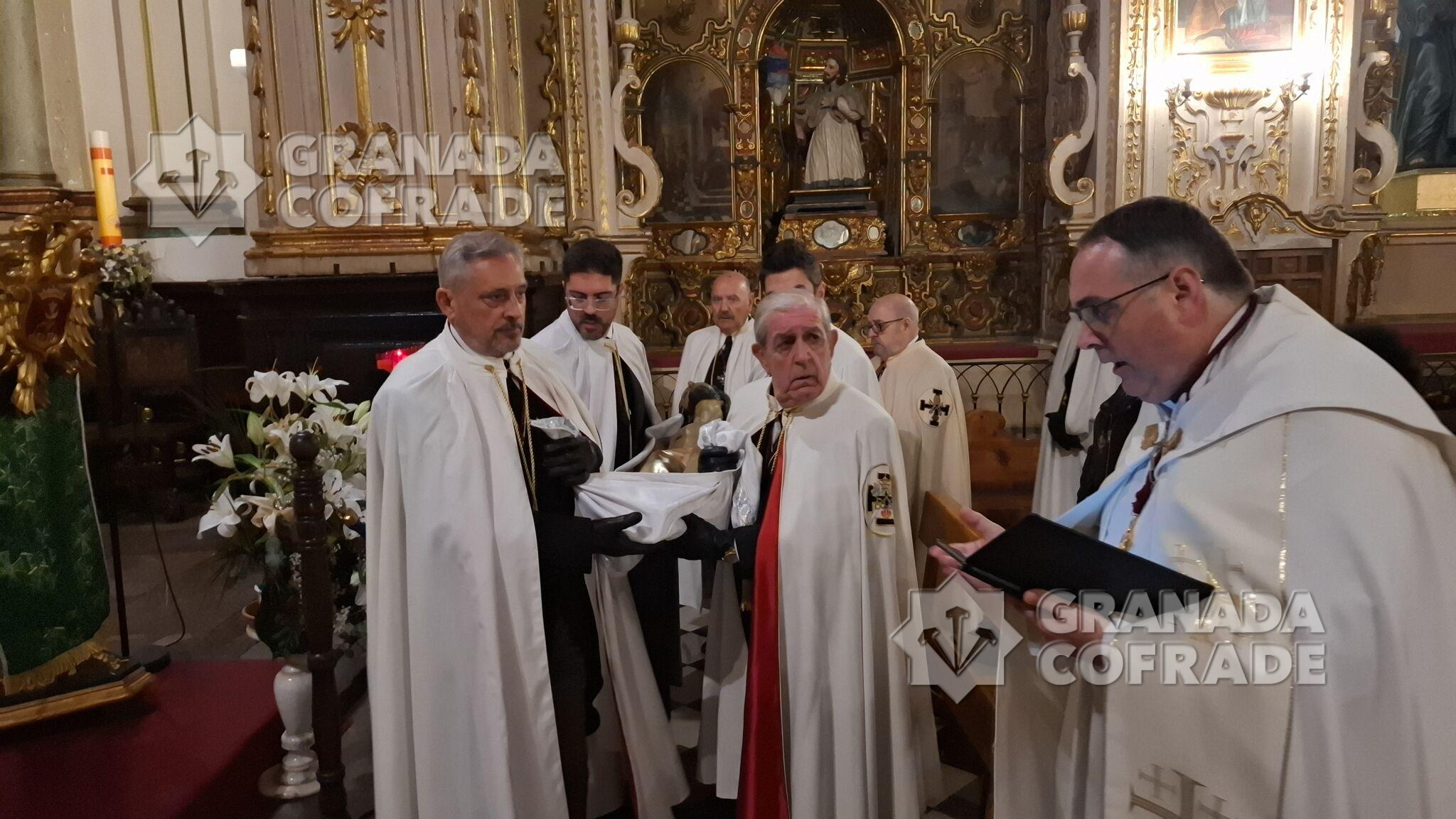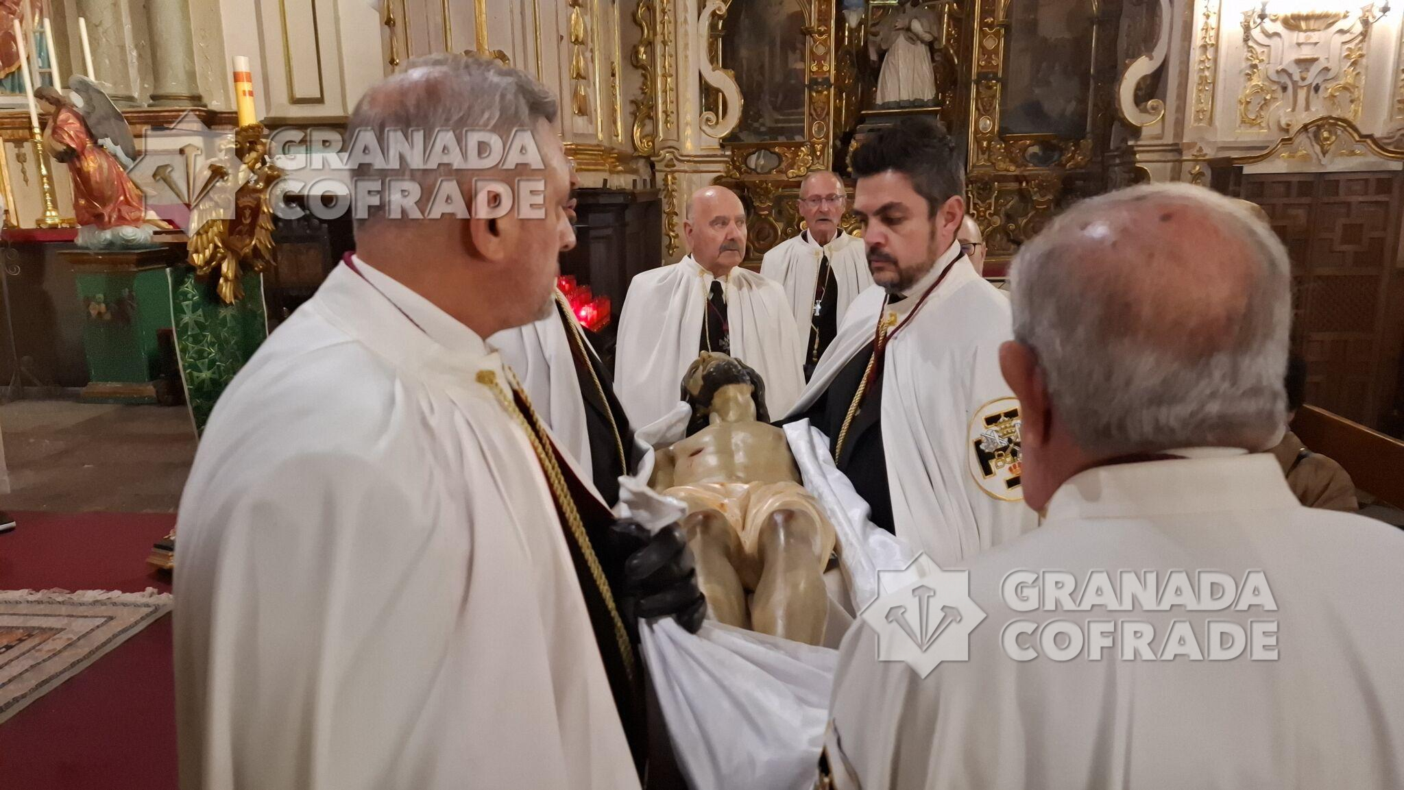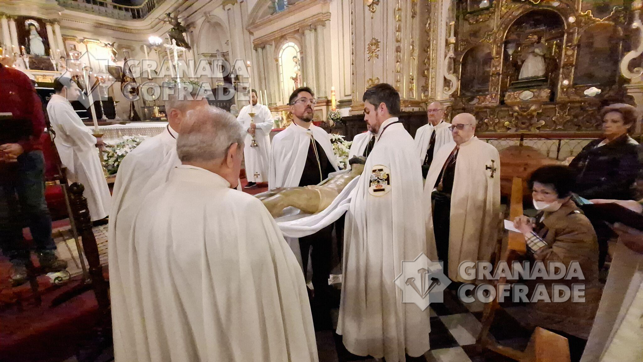 La imagen de Nuestro Señor Yacente del Santo Sepulcro presidió ayer el primer día de triduo en el templo de San Gil y Santa Ana siguiendo las directrices estatutarias de la convocatoria para este mes de noviembre de los cultos al Señor Yacente. Esta primera jornada tuvo lugar la Eucaristía presidida por el párroco y consiliario, José Gabriel Martín Rodríguez para a su finalización realizar el rezo de la Oración de las Cinco Llagas por el interior del templo. Un acto sencillo de la hermandad y de profundo recogimiento en el que la imagen es portada por el templo por los Caballeros del Santo Sepulcro realizándose en el pequeño cortejo rezo del ofrecimiento de las llagas de Cristo en su Muerte.