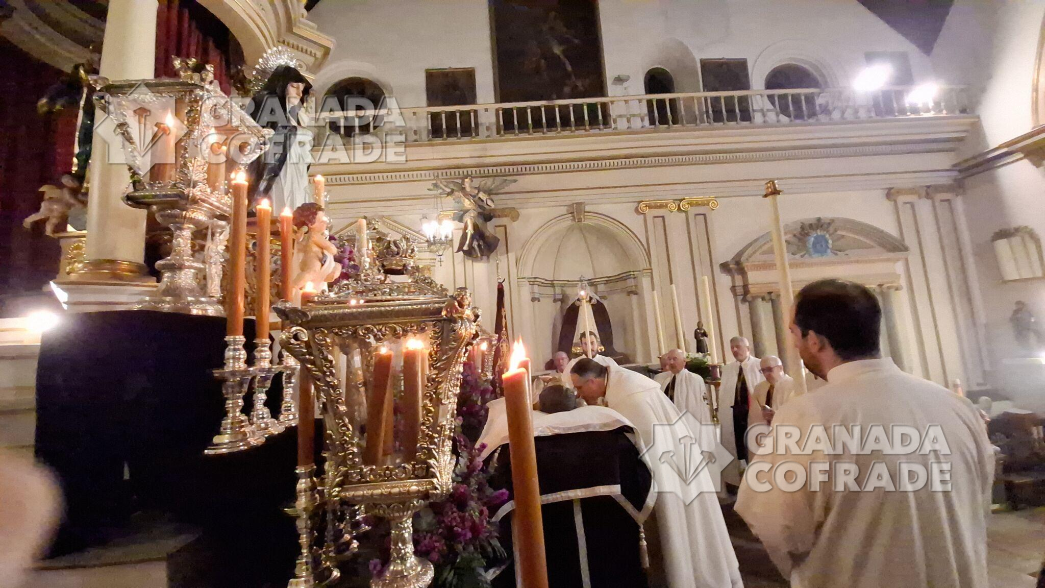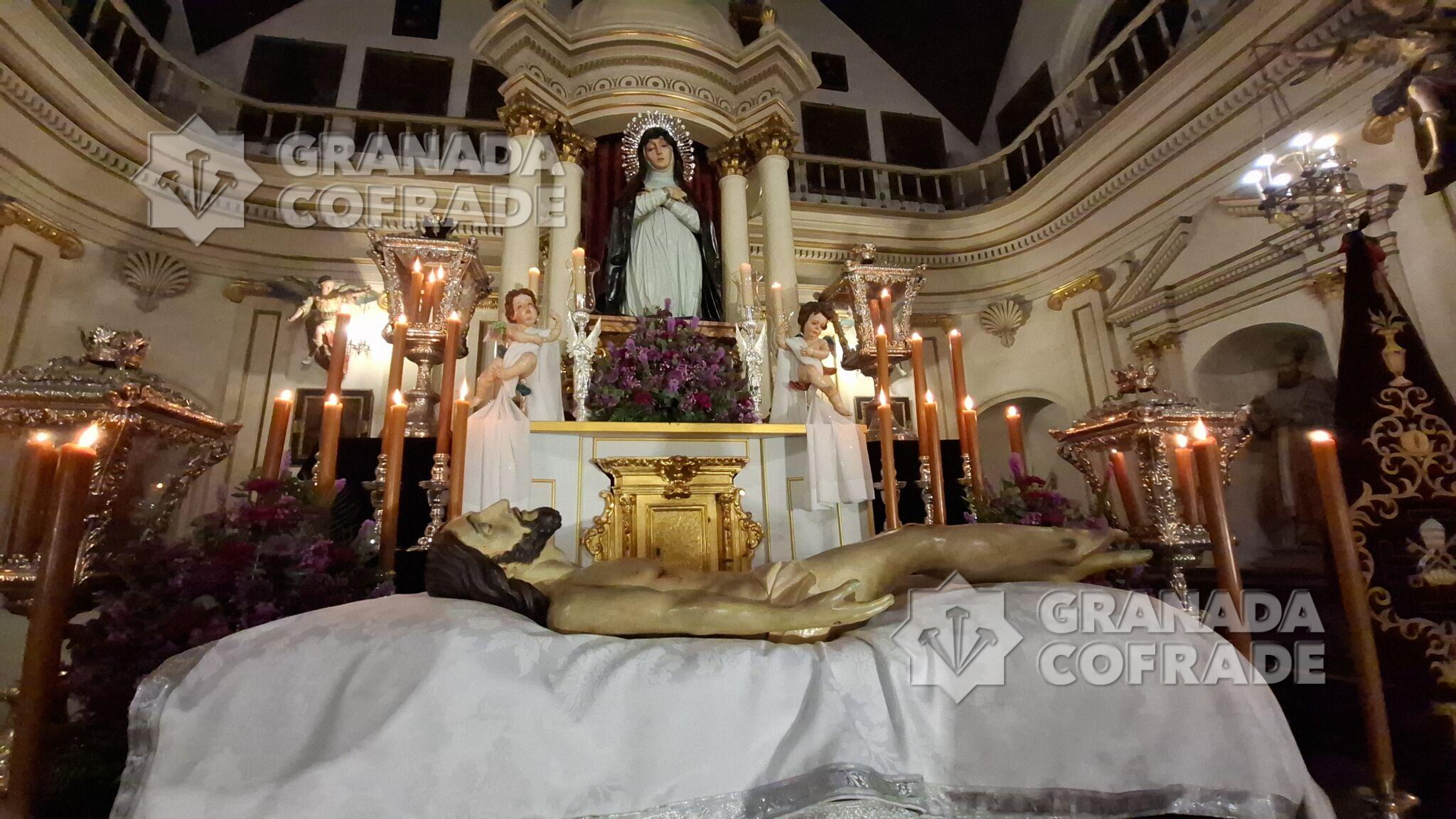 Finalizó el acto religioso con el rezo de la Salve Regina ante la imagen de Nuestra Señora de la Soledad en el Calvario que preside el presbiterio en este Año Jubilar del I Centenario de la fundación de la cofradía del Santo Sepulcro.