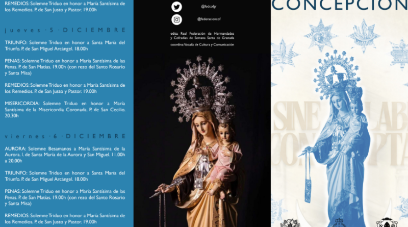 Un año más la Real Federación de Hermandades y Cofradías edita la guía de actos y besamanos de la Solemnidad de la Inmaculada Concepción. Estará disponible en formato físico desde mañana, jueves 28 de Noviembre, en las siguientes oficinas de Turismo en Cárcel Baja, 3; en plaza de San Ana, 4 y en plaza del Carmen, correspondientes a la Diputación Provincial, Junta de Andalucía y Ayuntamiento de Granada. También en la sede de la Federación de Cofradías de plaza de los Lobos, de 18.15 horas a 20.00 horas.