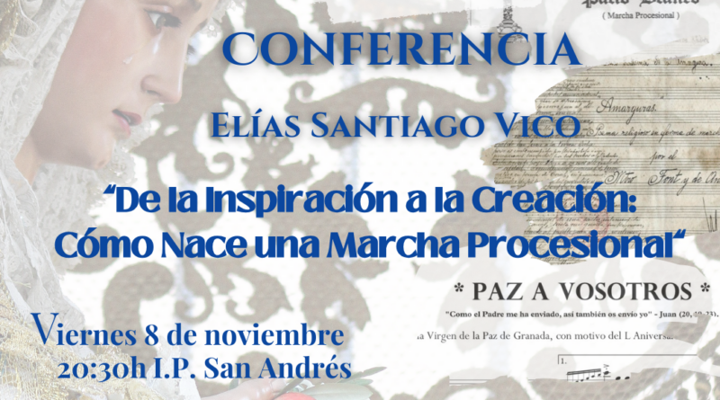 Dentro de los actos del 50 Aniversario de Ntra. Sra. de la Paz, la Ilustre Cofradía de la Entrada de Jesús en Jerusalén y Ntra. Sra. de la Paz invita a todos sus hermanos y hermanas, Hermandades y Cofradías de Granada, músicos, amigos y familiares a la conferencia “De la Inspiración a la creación: Cómo nace una marcha procesional» a cargo del compositor y músico Elías Santiago Vico. Será el próximo viernes 8 de noviembre del 2024, a las 20:30h en la Iglesia Parroquial San Andrés Apóstol.