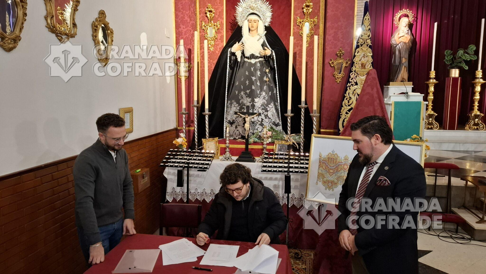Ante la presencia del consiliario, Cristóbal Sánchez, y del secretario de la corporación, Sergio Ortega, se procedió a la firma. El hermano mayor, Enrique Trujillo, indicó que el compromiso es llegar a 2026 con el frontal delantero terminado «puesto que después de las elecciones de ese año el equipo resultante propondrá al cabildo de hermanos la continuidad del trabajo y ciertamente no creo que haya problema sea quien sea el hermano mayor y su junta puesto que es un trabajo en el que se han involucrado muchos hermanos y tiene continuidad». Aventurándose, el trabajo podría estar terminado totalmente en el resto de fases en unos diez años. La cofradía, además mantiene la ejecución de la saya que se bendecirá el día 3 de diciembre, la firma de una nueva tanda de candelería en el taller de Ramón León y otros proyectos que se irán viendo en los próximos meses.