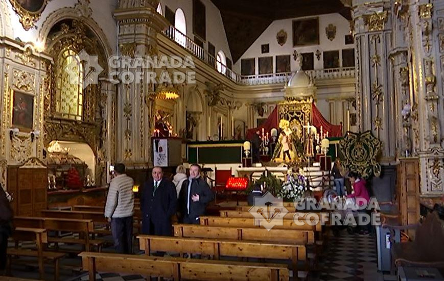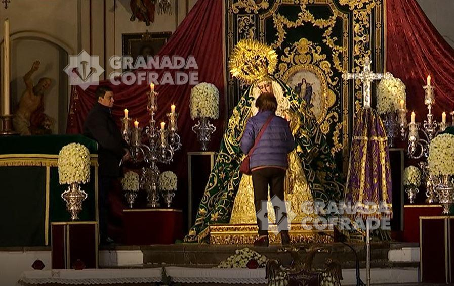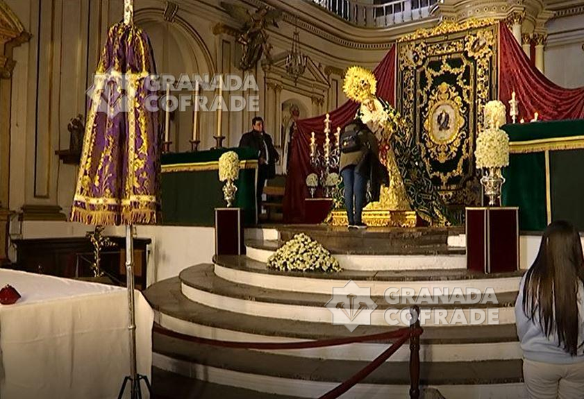 Nuestra Señora de la Esperanza estuvo ayer durante todo el día expuesta en besamanos a la veneración de los fieles y cofrades. Fue muy alta la participación de granadinos en este acto de oración y recogimiento ante la Virgen de Risueño en el presbiterio del templo de Santa Ana, enmarcada en el techo de palio y sobre dosel color granate. Cera y flor completaron este altar que fue muy visitado y a determinadas horas de la noche con una impresionante cola que pasaba del Pilar del Toro, en plaza de Santa Ana.