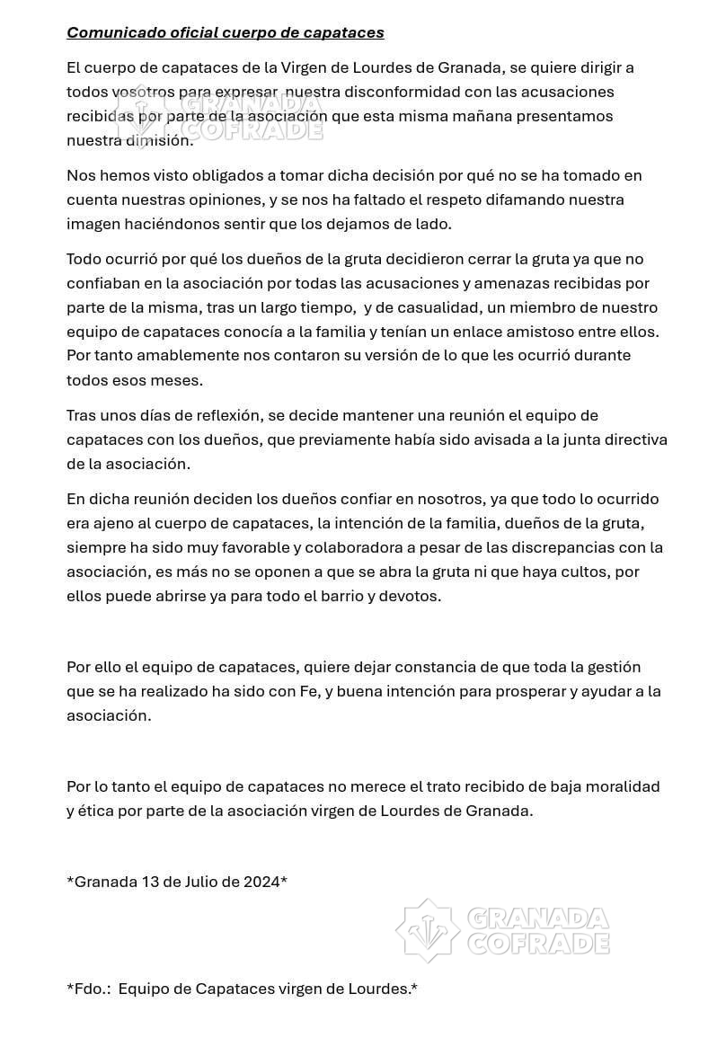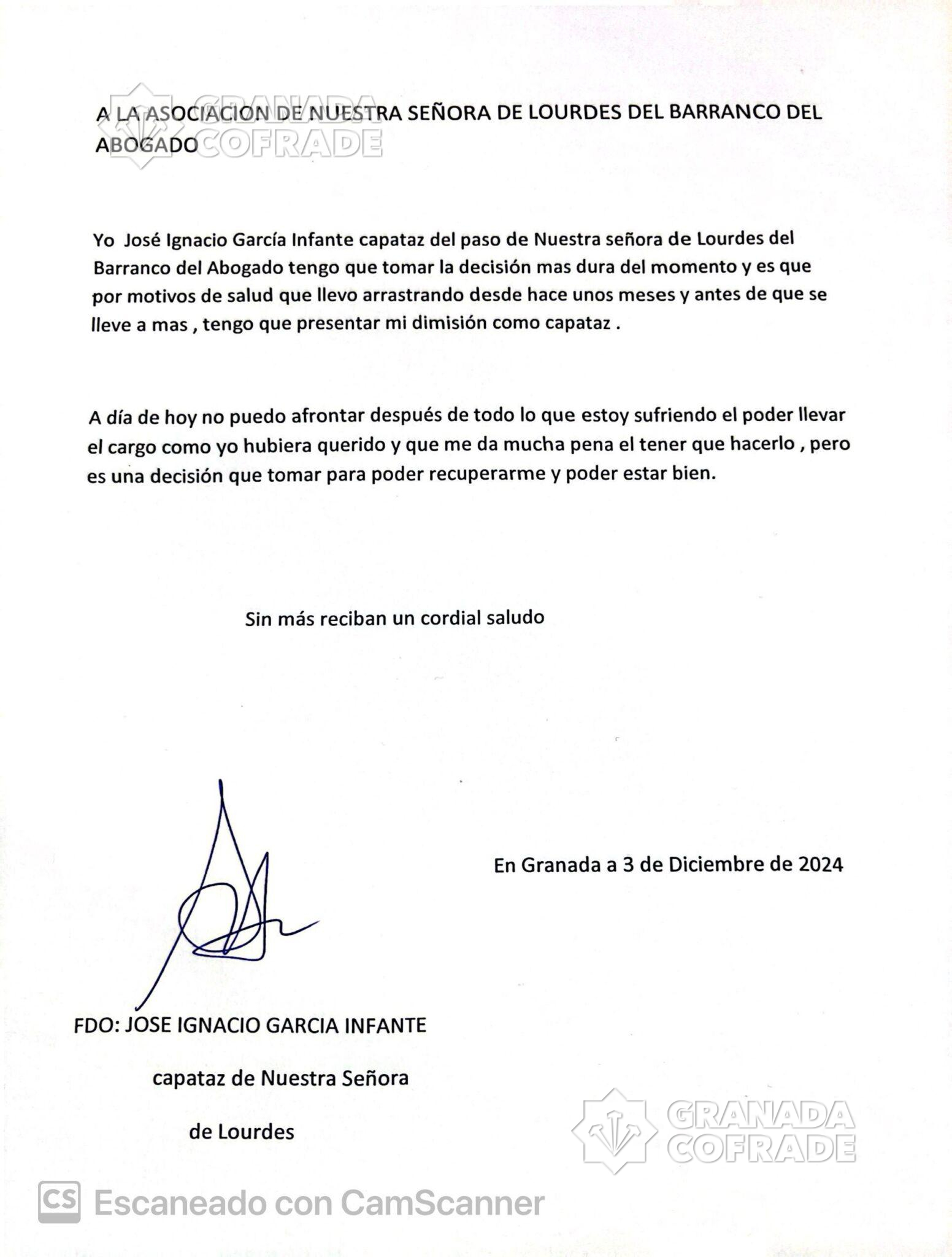 José Ignacio García y el anterior capataz de la Virgen de Lourdes, Alejandro Moreno, han remitido a nuestra redacción sus cartas de dimisión que presentaron a la Asociación que coordina la salida procesional de la Patrona del Barranco del Abogado. Al anterior capataz no le tomaron la carta de dimisión y a García si que lo han hecho. Una situación anómala que pone en peligro las actividades más próximas a celebrar en este popular barrio granadino.