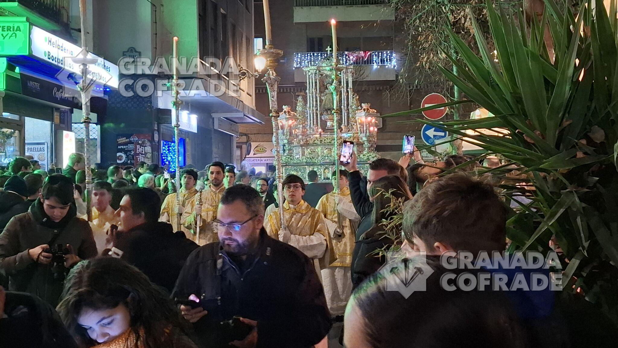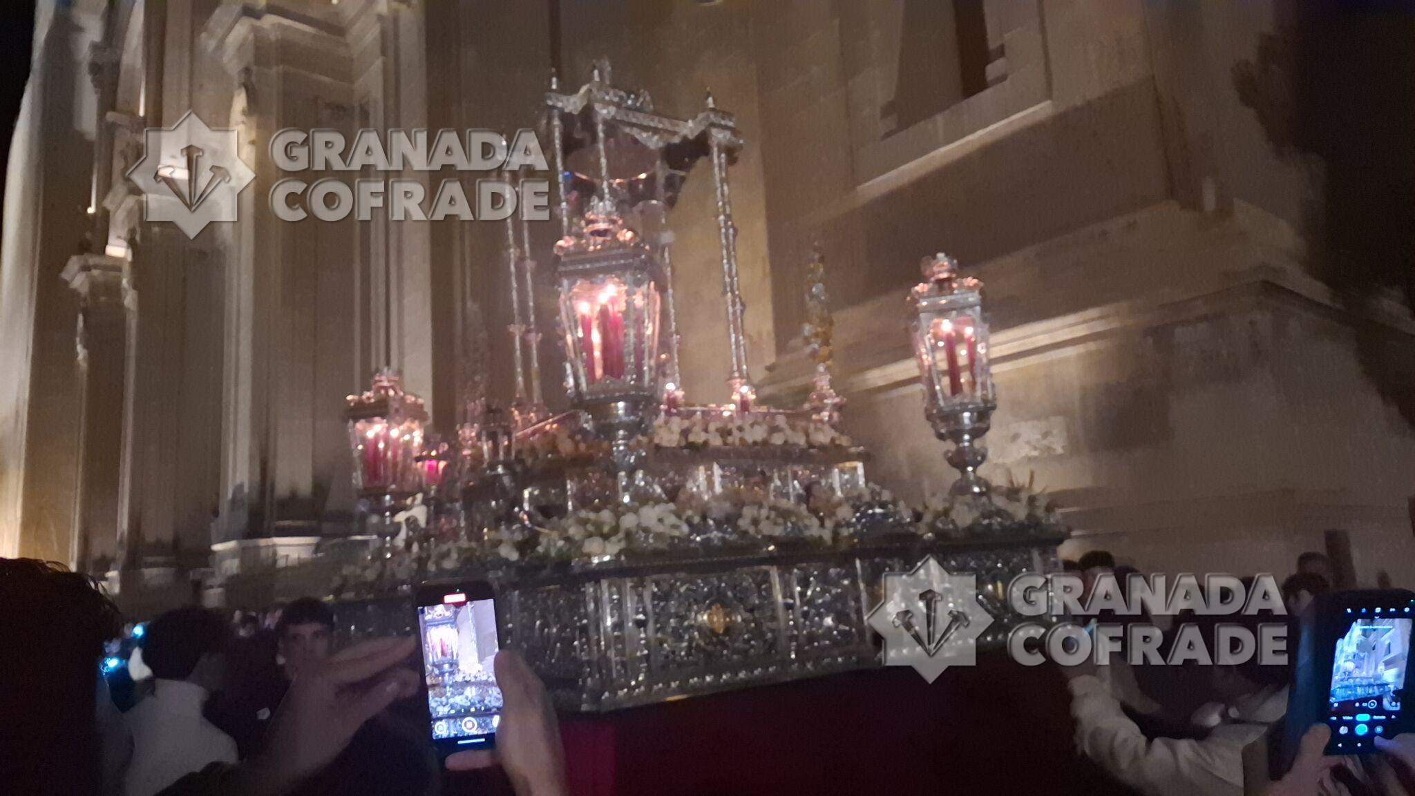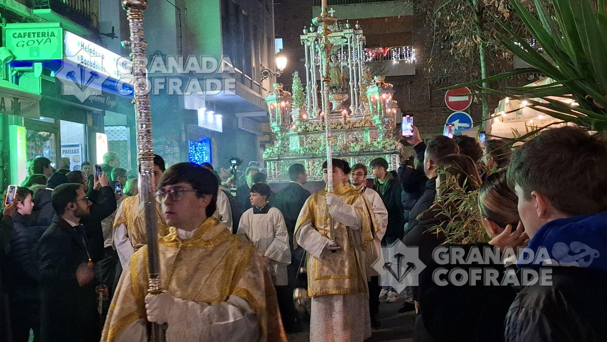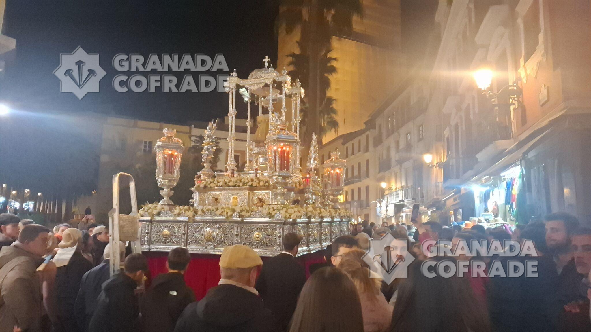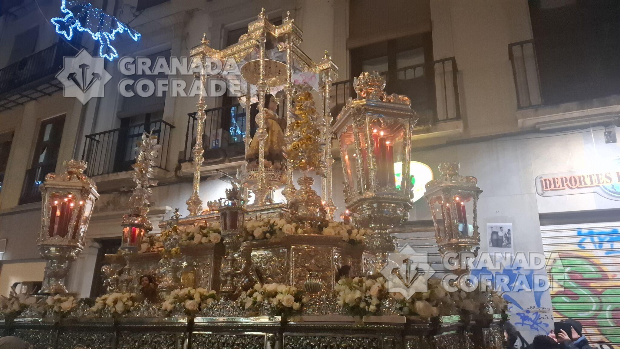 La talla del Niño Jesús esta atribuida a Diego de Mora o a José de Risueño y se presentaba vestida con una de las doce túnicas que posee, bordada en oro y plata sobre tisú de oro y cobijado bajo templete de orfebrería cedido por la parroquia del Santo Ángel Custodio. Se había usado el paso procesional de María Auxiliadora de la Alhambra, con faroles en las esquinas de la hermandad del Señor de la Humildad, correspondientes al paso de la Soledad de Nuestra Señora y pequeños ángeles en los costeros, de la hermandad de Jesús del Rescate. Ricardo Mora era el capataz de las dos cuadrillas que igualaron bajo las trabajaderas del Niño Jesús del Sagrario.