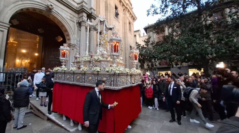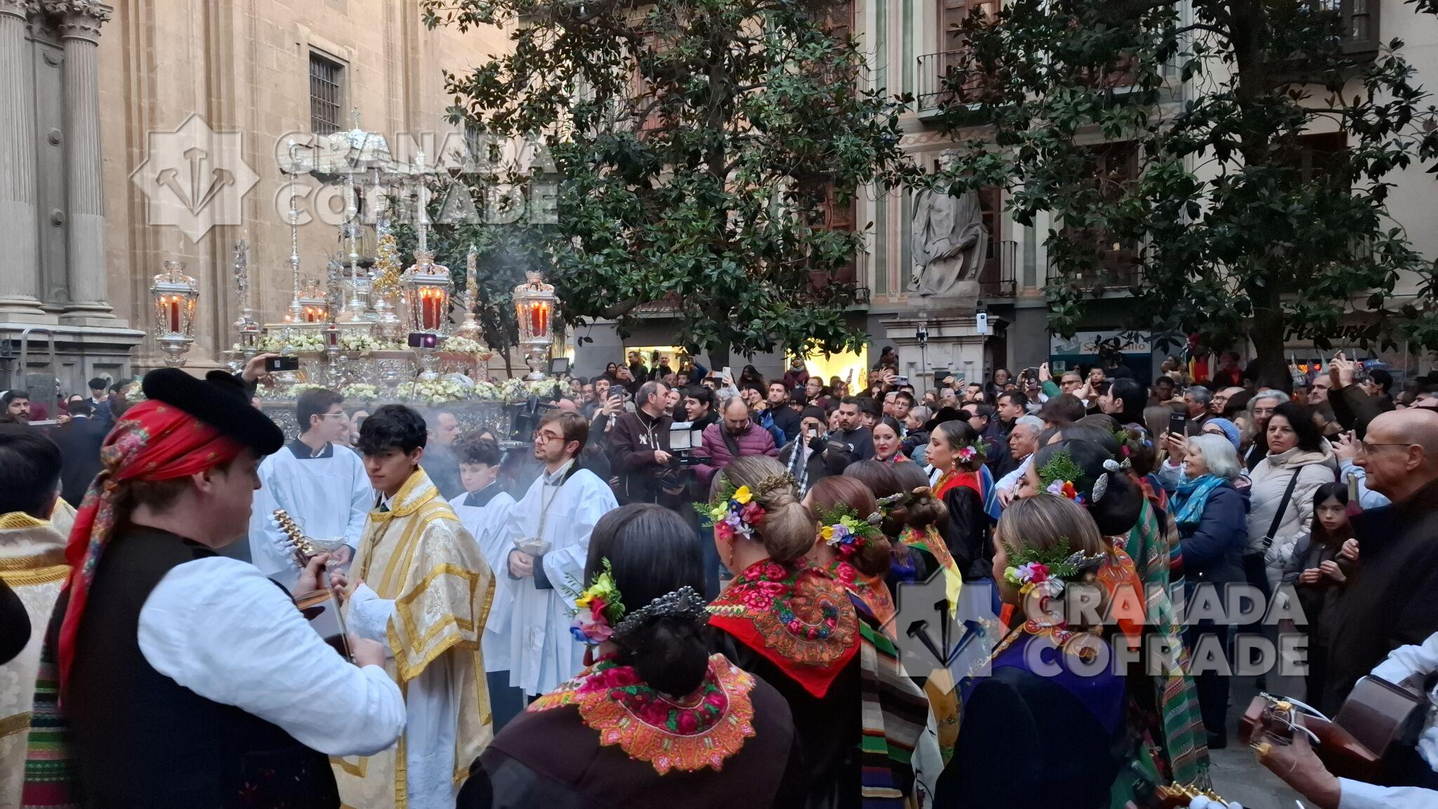 La imagen del Dulcísimo Nombre de Jesús recorrió ayer las calles del centro de la ciudad acompañado por la banda de música de Atarfe. Una cita que se vio muy arropada por los granadinos y visitantes que llenaron el itinerario desde la iglesia parroquial del Sagrario-Catedral hasta la parroquial de Santa María Magdalena y que contó también con Coros y Danzas de Granada que interpretaron varios villancicos al paso del Niño Dios en lugares tan significativos como la plaza de Alonso Cano, la plaza de la Trinidad y la plaza de Jesús del Rescate y en el regreso a su sede. Se celebraba, como se hará aún hasta finales de junio, el V Centenario de la fundación de la hermandad.
