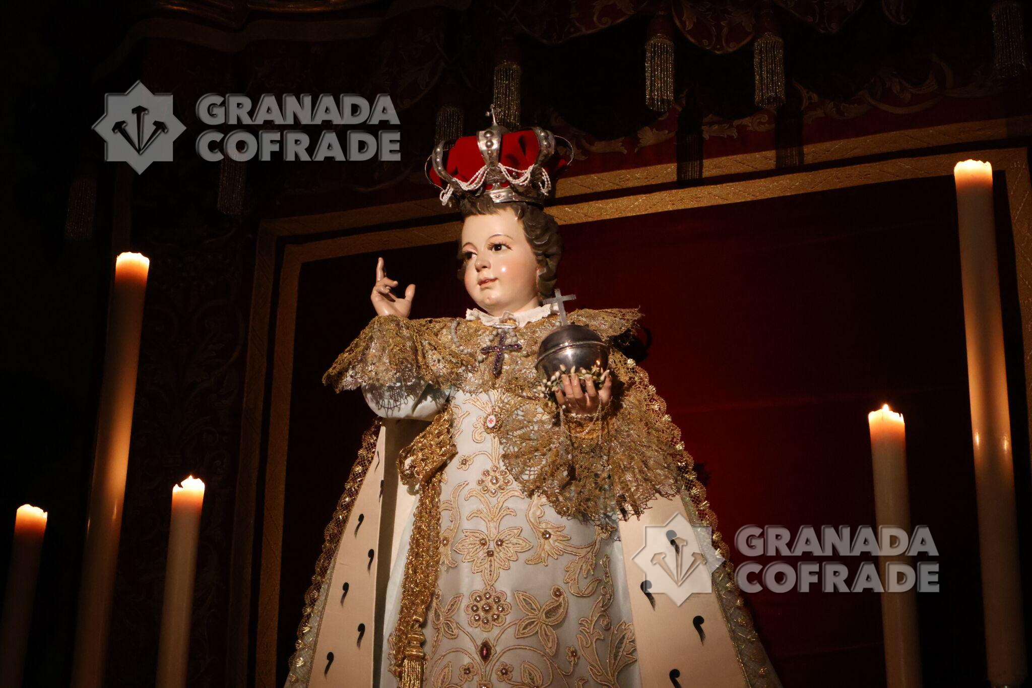 La hermandad de Nuestro Padre Jesús Nazareno celebró Eucaristía mensual en honor de sus Titulares pero en esta ocasión, además, los ofreció al Niño Jesús de Praga, Divino Infante del Carmelo. Estuvo presidida la celebración religiosa por el director espiritual, el sacerdote Javier Sabio. En un lateral del presbiterio se había dispuesto un altar de veneración al Niño Dios, bajo dosel rojo y acompañado de dos paños de cera y sendas jarras de flores de talco.