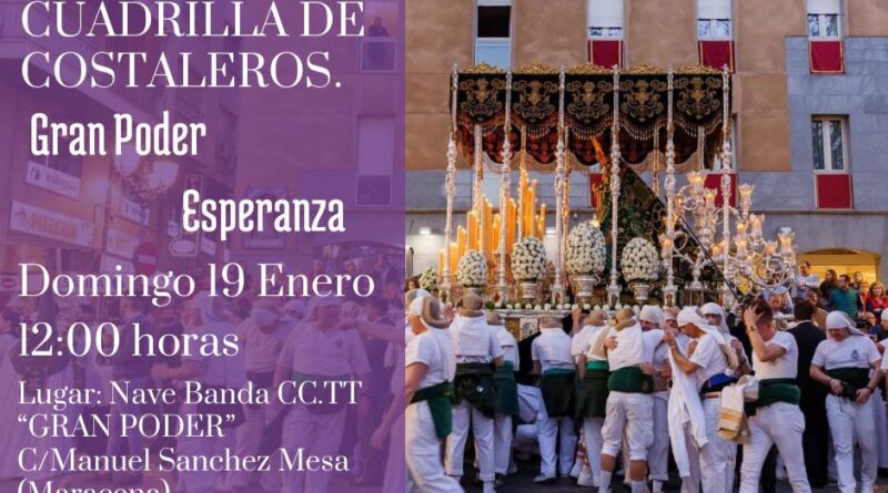El próximo domingo 19 de enero, tendrá lugar la «igualá» general de costaleros de la hermandad de Nuestro Padre Jesús del Gran Poder y Nuestra Señora de la Esperanza. La cita será a las 12:00 horas en la nave de la Banda de Cornetas y Tambores de Nuestro Padre Jesús del Gran Poder. (Polígono Industrial La Paz. C/ Manuel Sánchez Mesa, nave 8, Maracena). Es obligatoria la asistencia para aquellos hermanos que pertenezcan o quieran pertenecer a las cuadrillas de costaleros, debiendo acudir con el calzado de la Estación de Penitencia, zapatillas de color blanco. Al finalizar la Igualá, se celebrará un almuerzo de hermandad allí mismo, estando abierta a hermanos, familiares y amigos que lo deseen.