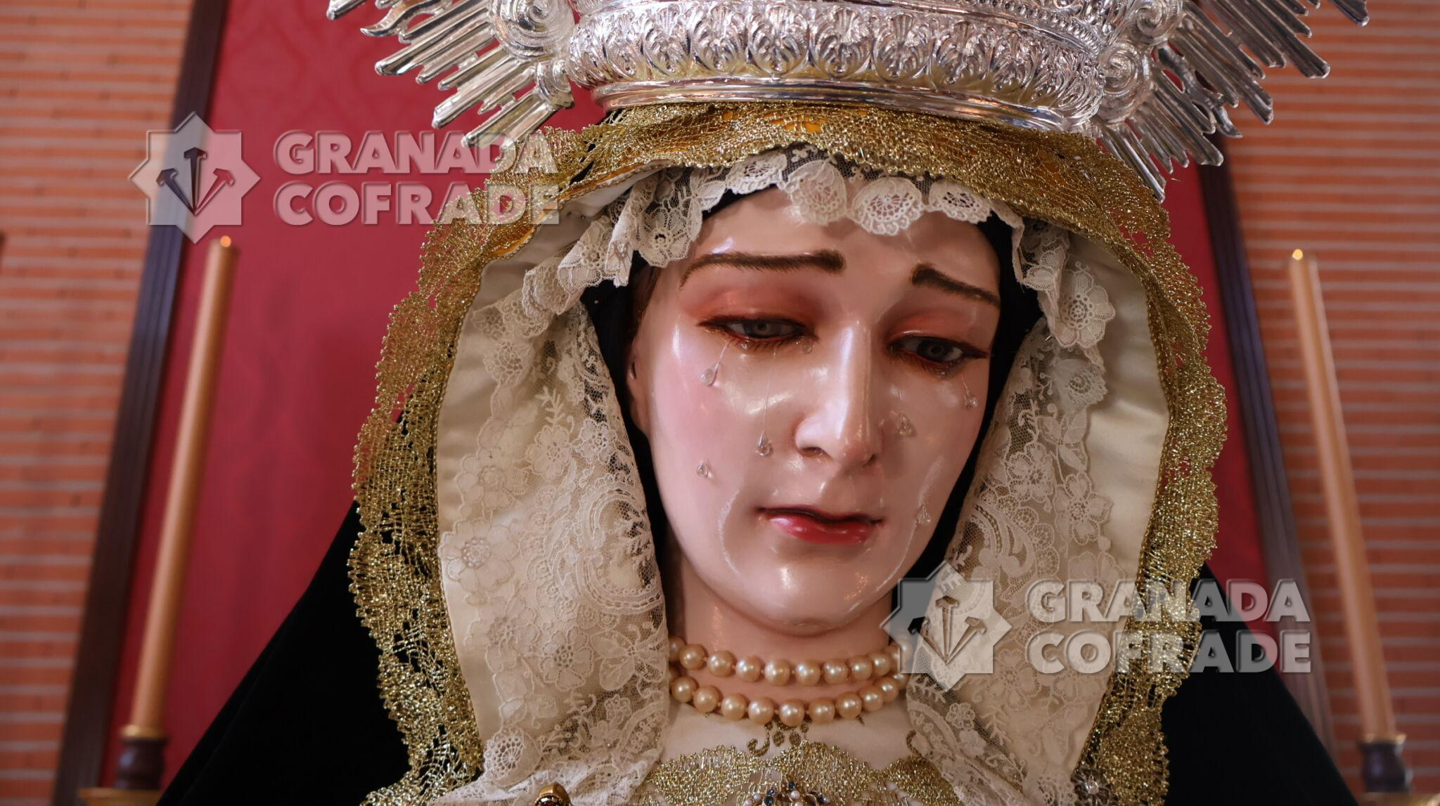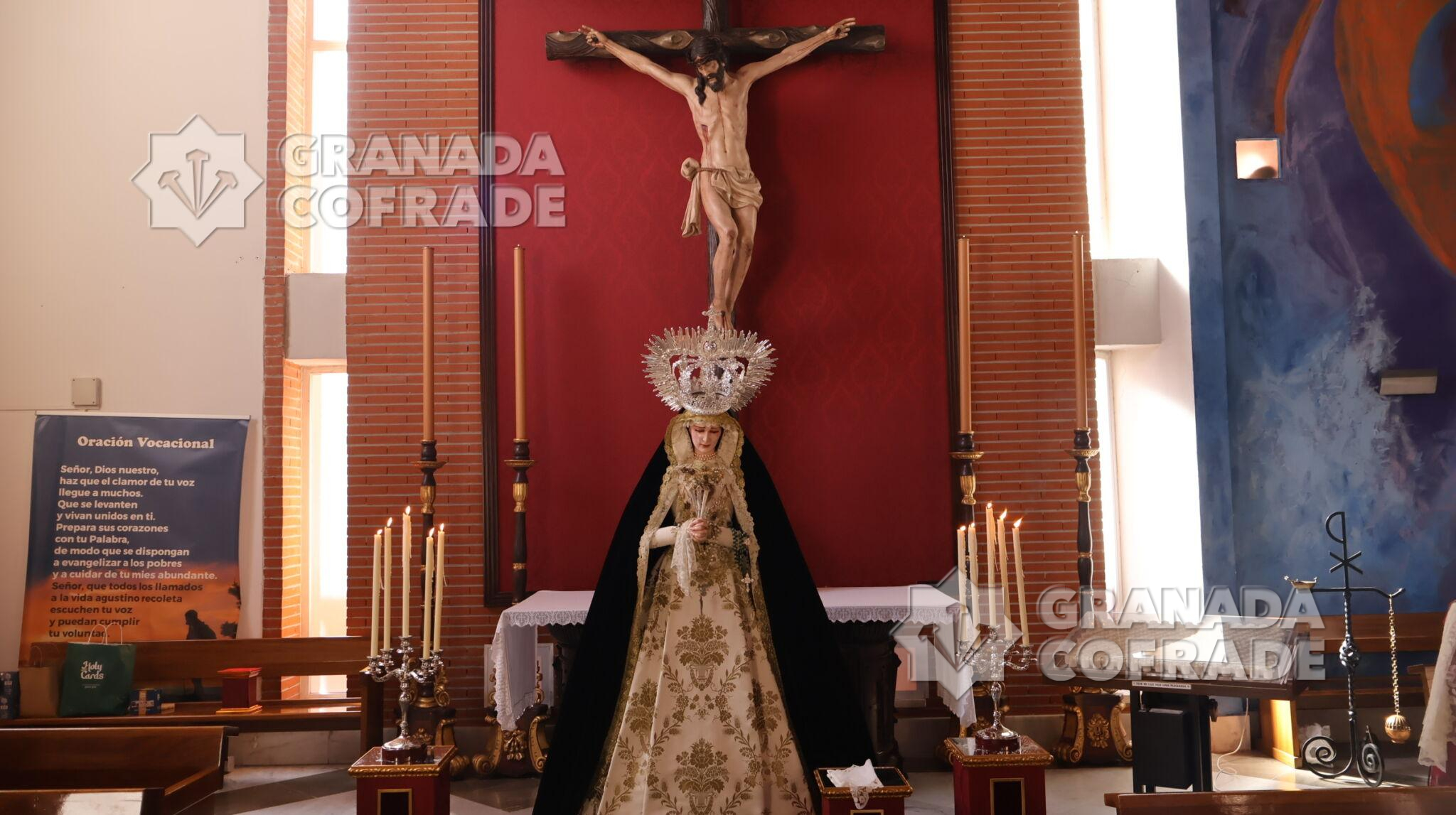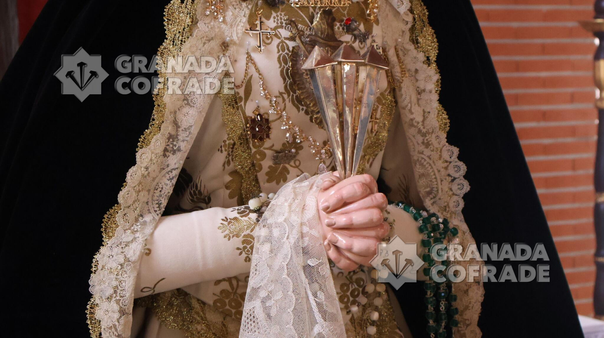 La imagen de la Virgen, obra de Angel Asenjo, presidía el altar de besamanos a los pies del Cristo de la Paz y flanqueada por dos candelabros de cera y vestida con saya donada que fue bendecida junto a otras piezas y tejidos fruto de la devoción que va asesorando esta imagen mariana y granadina.