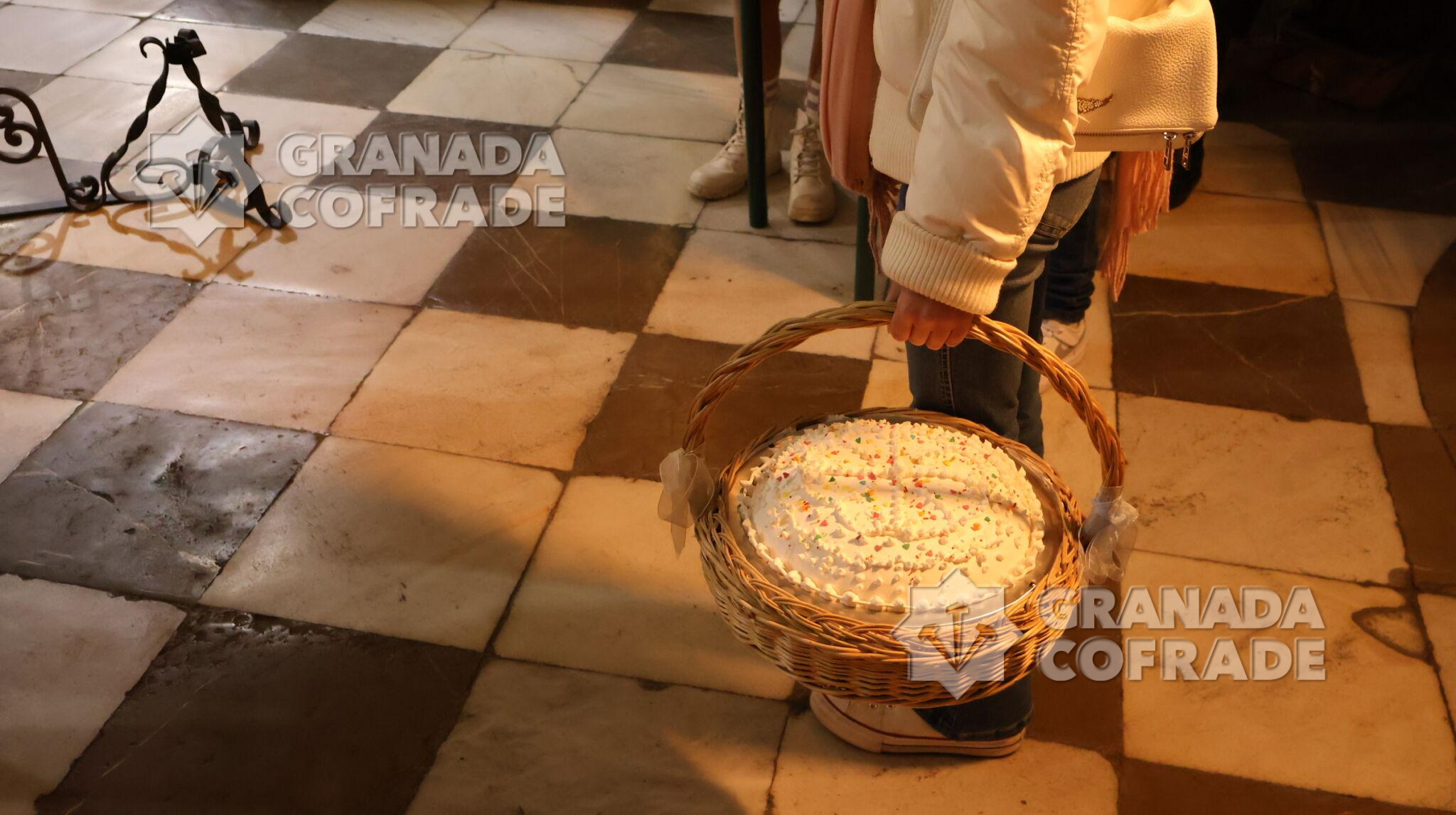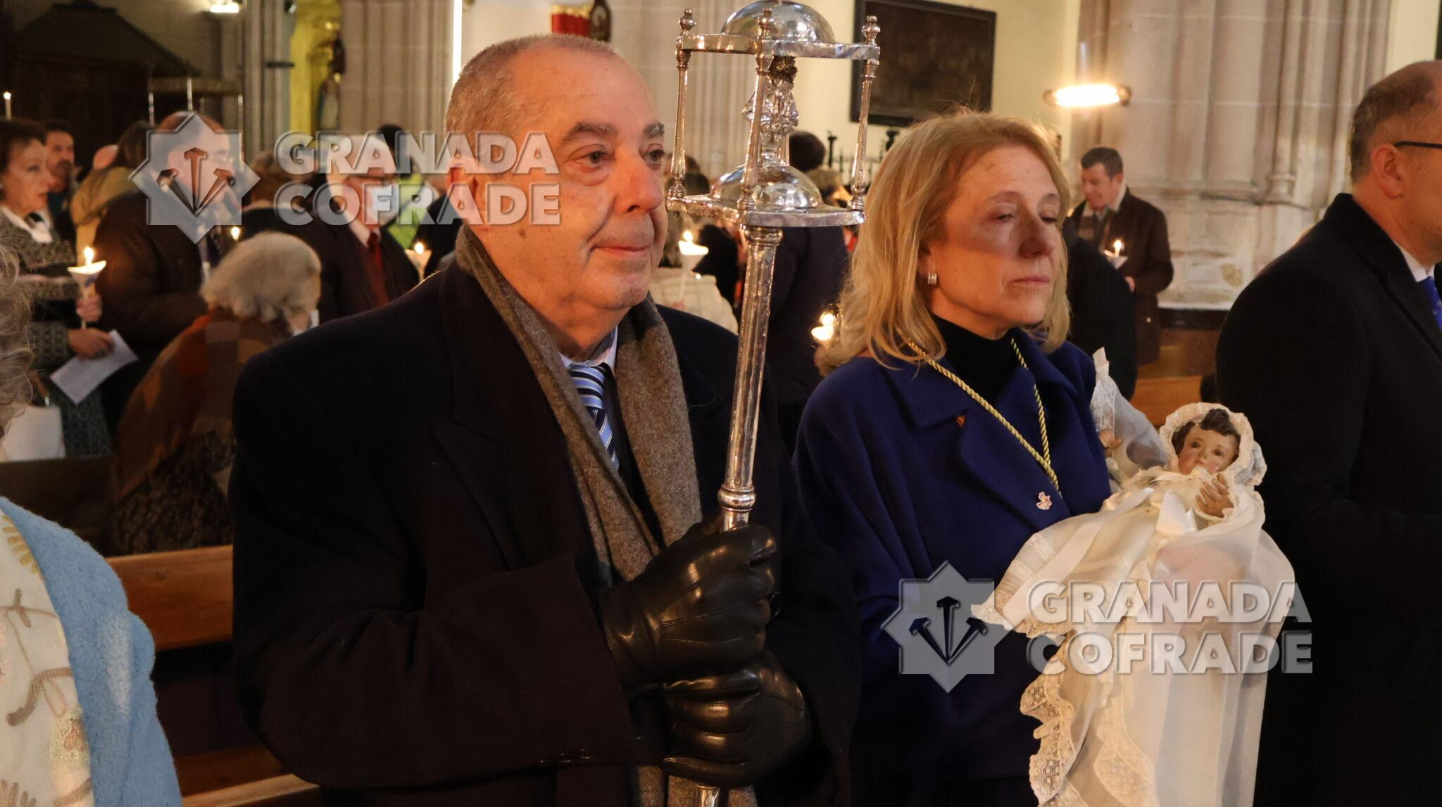 Se había procedido a la bendición de las candelas, o velas, primeramente tras el rezo del rosario. Ya en uno de los bancos estaban los mayordomos de este año con los atributos tradicionales, el báculo o cetro que portaba Ramón Burgos y una emocionada Encarna Ximénez que llevaba en sus manos la imagen del Niño Jesús de la Virgen del Rosario, vestido primorosamente de cristianar. Participaban en el cortejo niños en gran número y unos de ellos portaban las jaula con los dos pichones en recuerdo de la ofrenda en la presentación de Jesús en el templo, y una tarta de nata que habitualmente se realiza en el convento de Zafra y que se conoce como «Tarta de Gloria» que al término de la celebración se da a degustar.