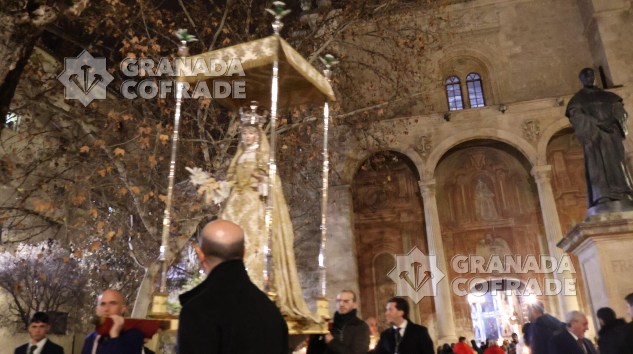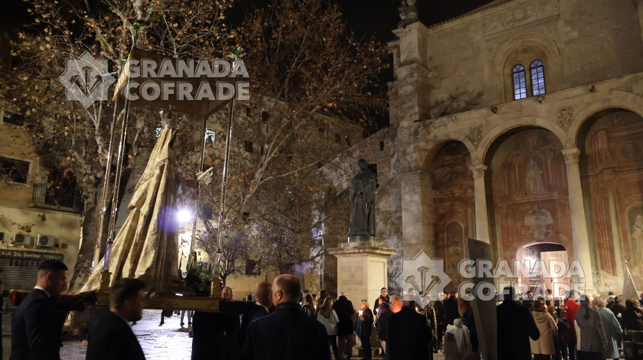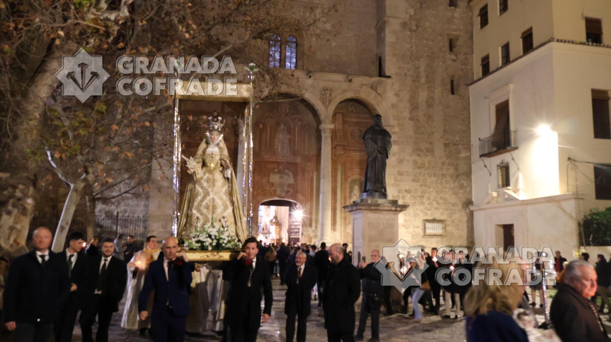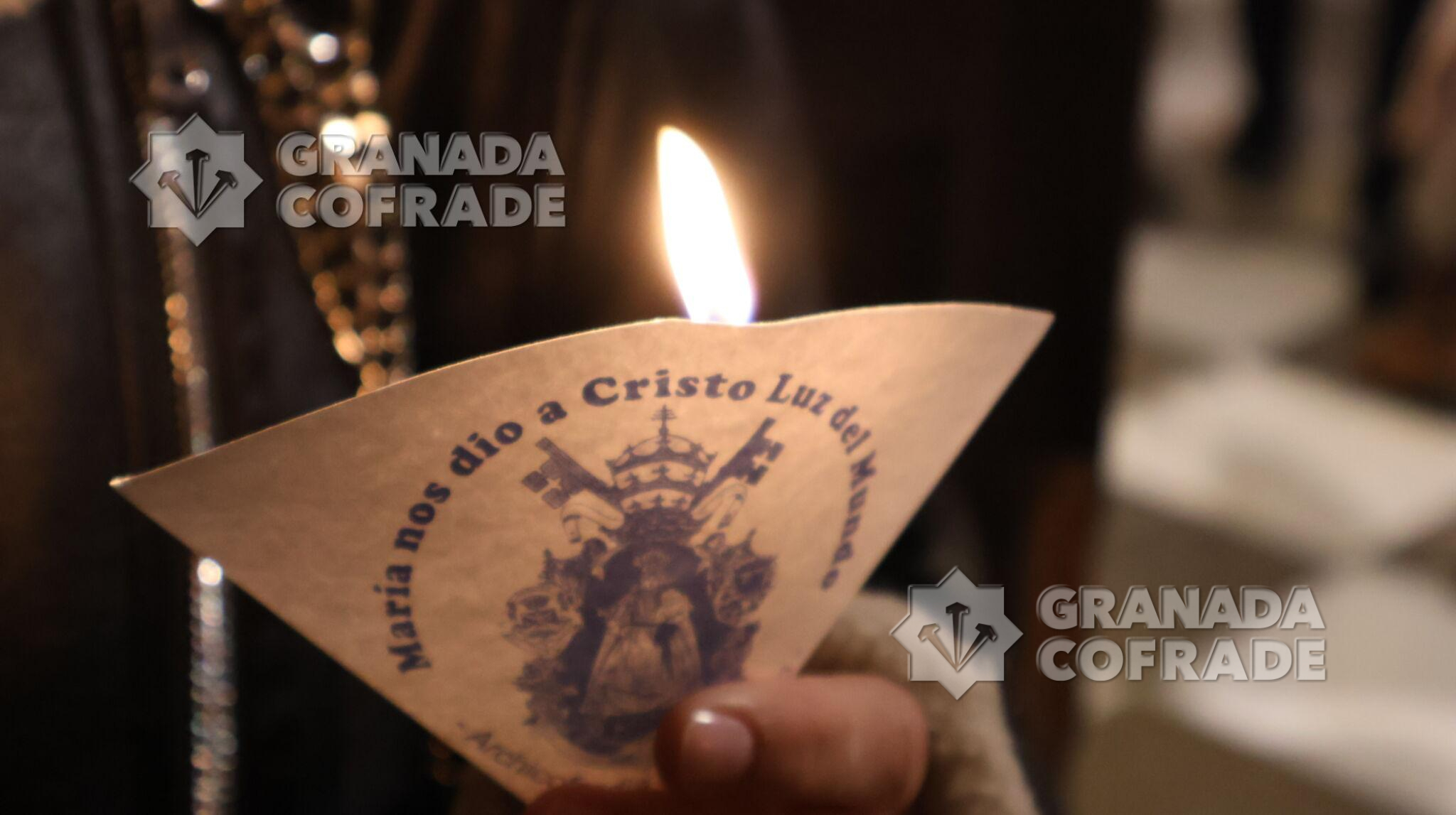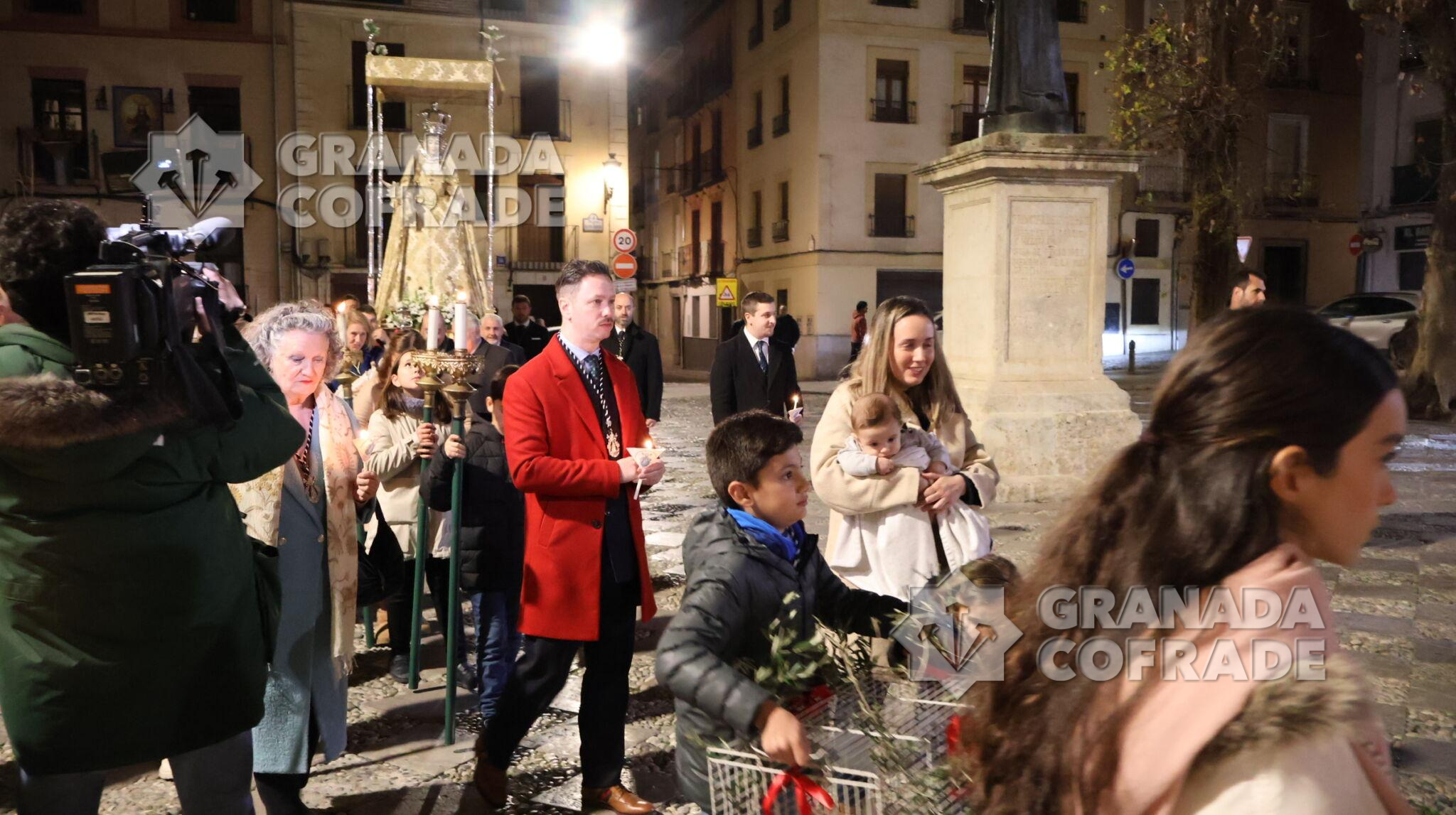 Hacía más de veinte años que la procesión de la Candelaria, de Santo Domingo, no recorría la plaza de su nombre, del barrio del Realejo. Y lo hizo a lo grande, lejanos aquellos años de comienzo de siglo en los que apenas una treintena de fieles precedían la imagen de la Santísima Virgen recorriendo este lugar alrededor de la escultura de Fray Luis de Granada. Ahora, después de la rápida recuperación de esta costumbre, la Archicofradía de Nuestra Señora del Rosario, Copatrona de Granada, se vio acompañada por más de trescientas personas que obligó a doblar la fila por la plaza de Santo Domingo de manera que al unirse la cruz alzada del comienzo del cortejo aun no había salido la imagen de la Virgen y determinaron hacer un giro en dirección a la escultura del fraile dominico, rodearla y dar tiempo a que terminara de salir al imagen, vicaria de la del Rosario, que se emplea en estos últimos años para presidir la procesión.