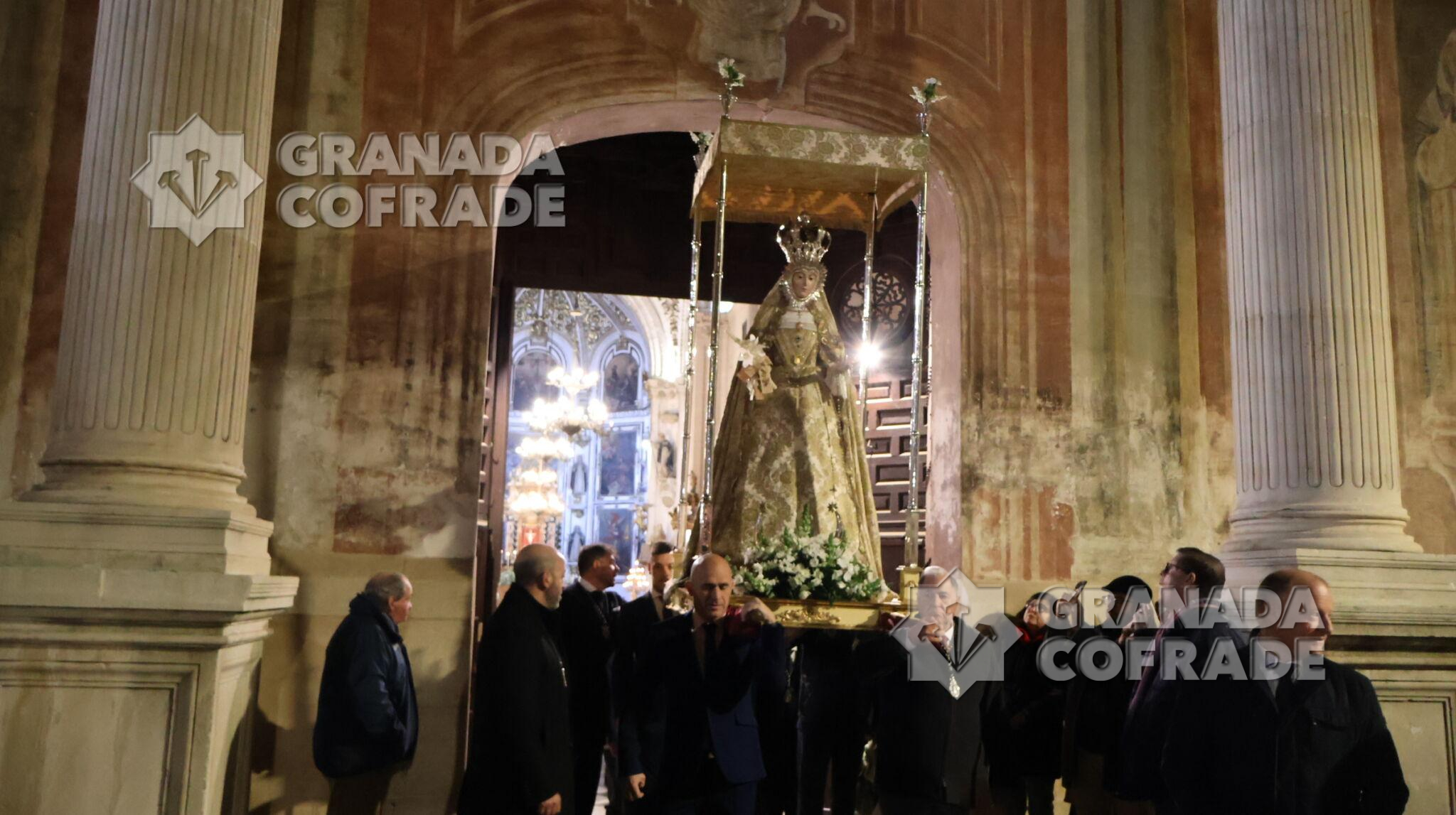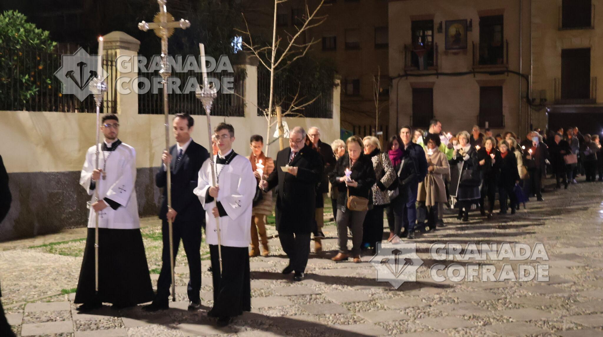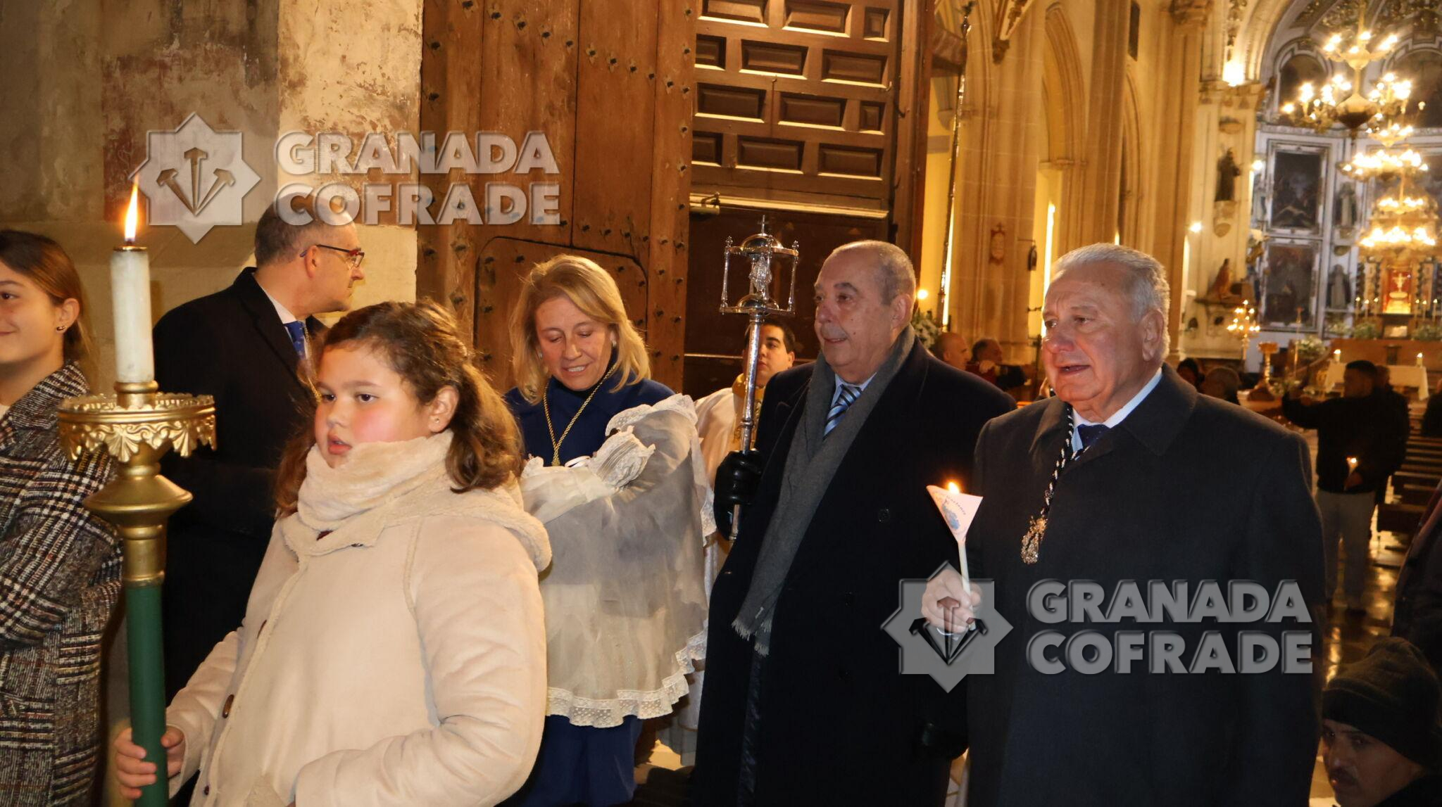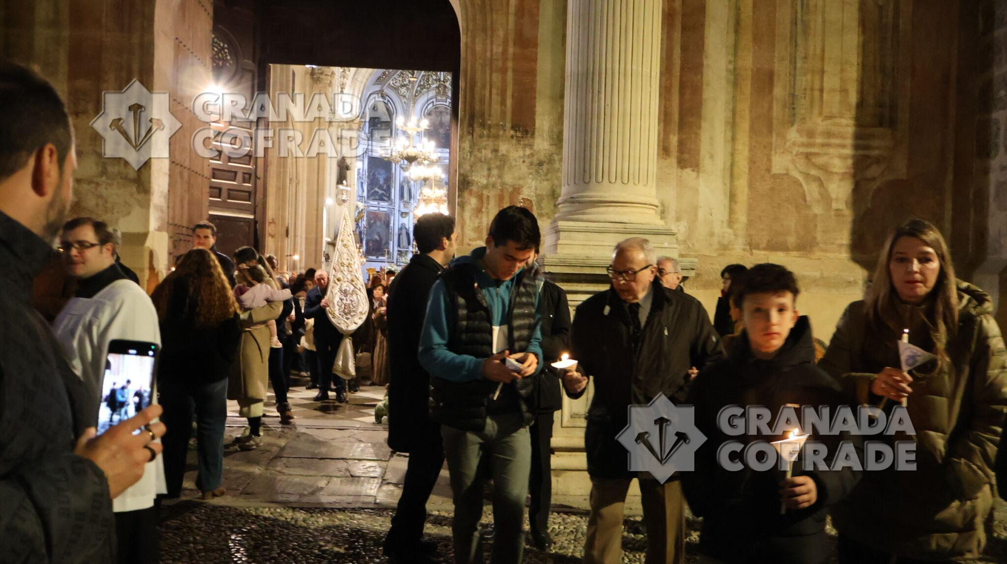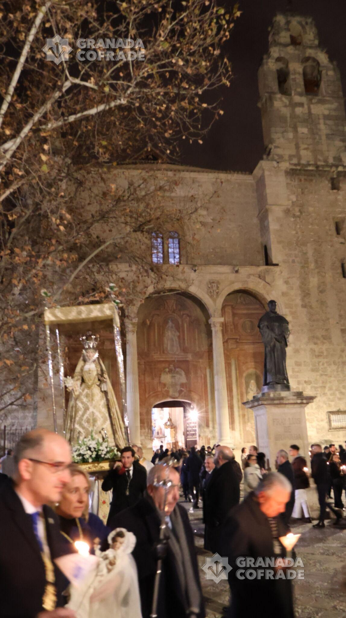 Hacía más de veinte años que la procesión de la Candelaria, de Santo Domingo, no recorría la plaza de su nombre, del barrio del Realejo. Y lo hizo a lo grande, lejanos aquellos años de comienzo de siglo en los que apenas una treintena de fieles precedían la imagen de la Santísima Virgen recorriendo este lugar alrededor de la escultura de Fray Luis de Granada. Ahora, después de la rápida recuperación de esta costumbre, la Archicofradía de Nuestra Señora del Rosario, Copatrona de Granada, se vio acompañada por más de trescientas personas que obligó a doblar la fila por la plaza de Santo Domingo de manera que al unirse la cruz alzada del comienzo del cortejo aun no había salido la imagen de la Virgen y determinaron hacer un giro en dirección a la escultura del fraile dominico, rodearla y dar tiempo a que terminara de salir al imagen, vicaria de la del Rosario, que se emplea en estos últimos años para presidir la procesión.