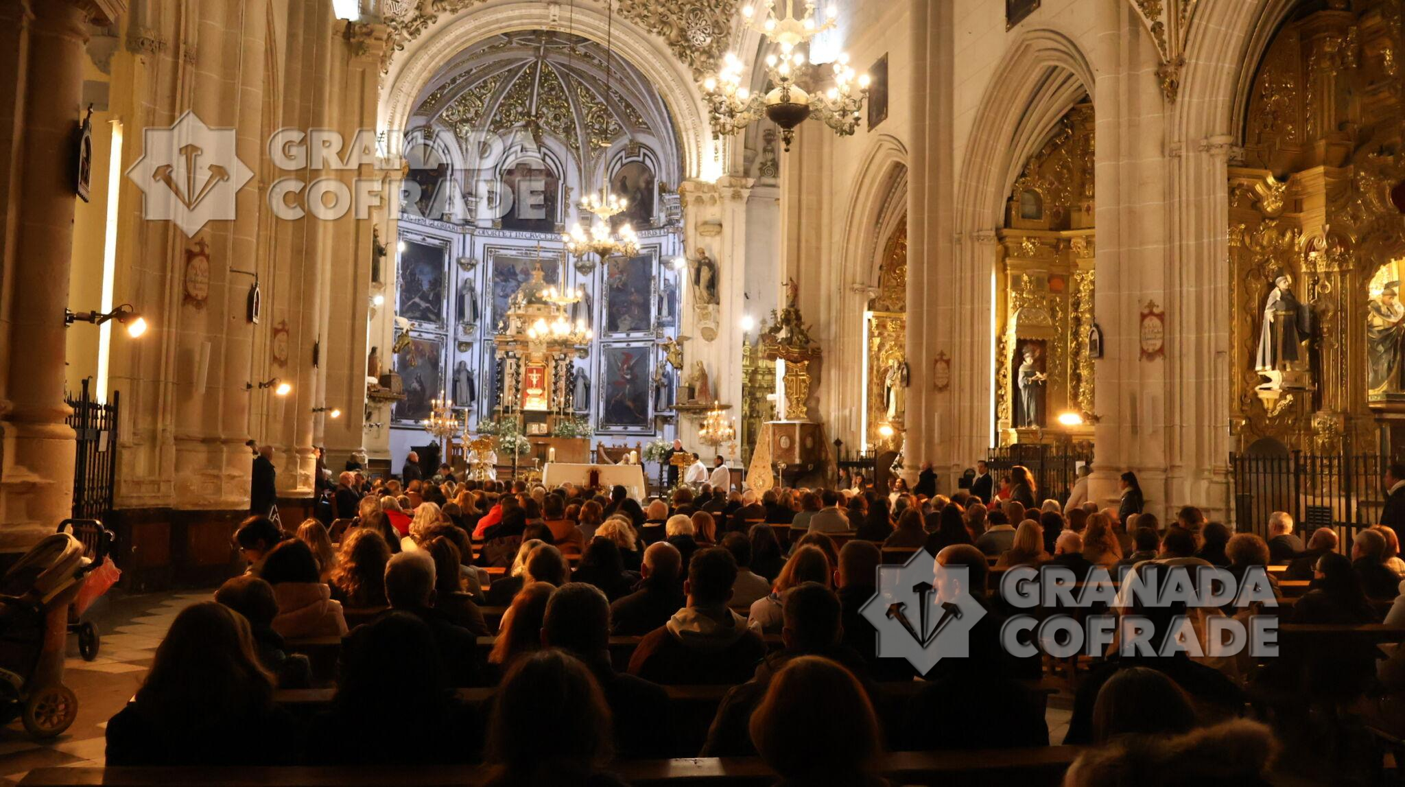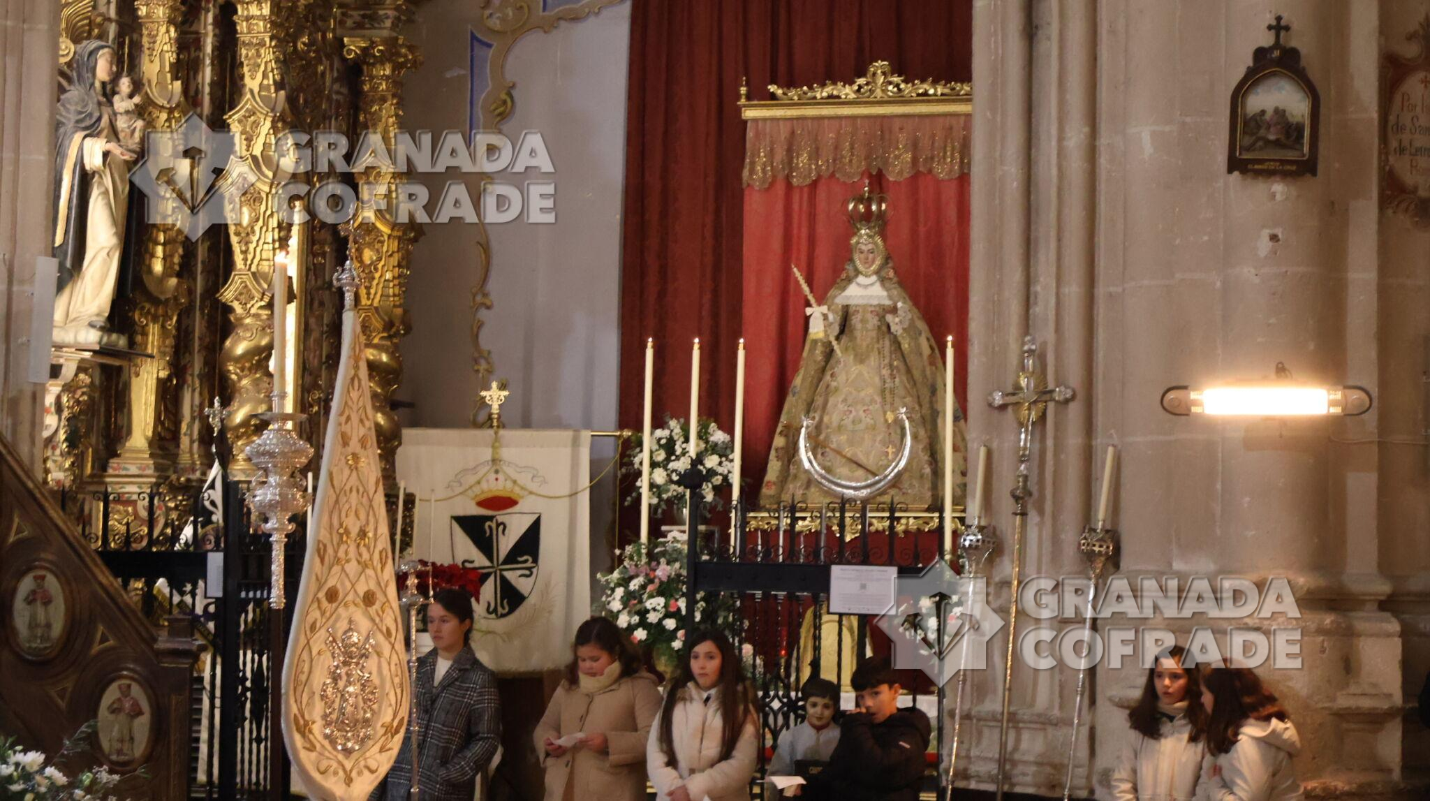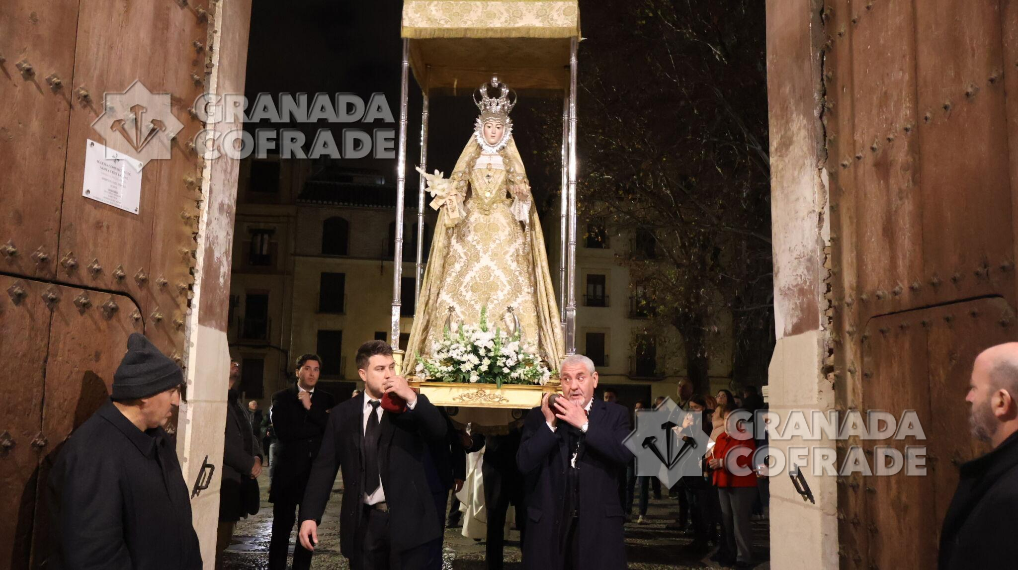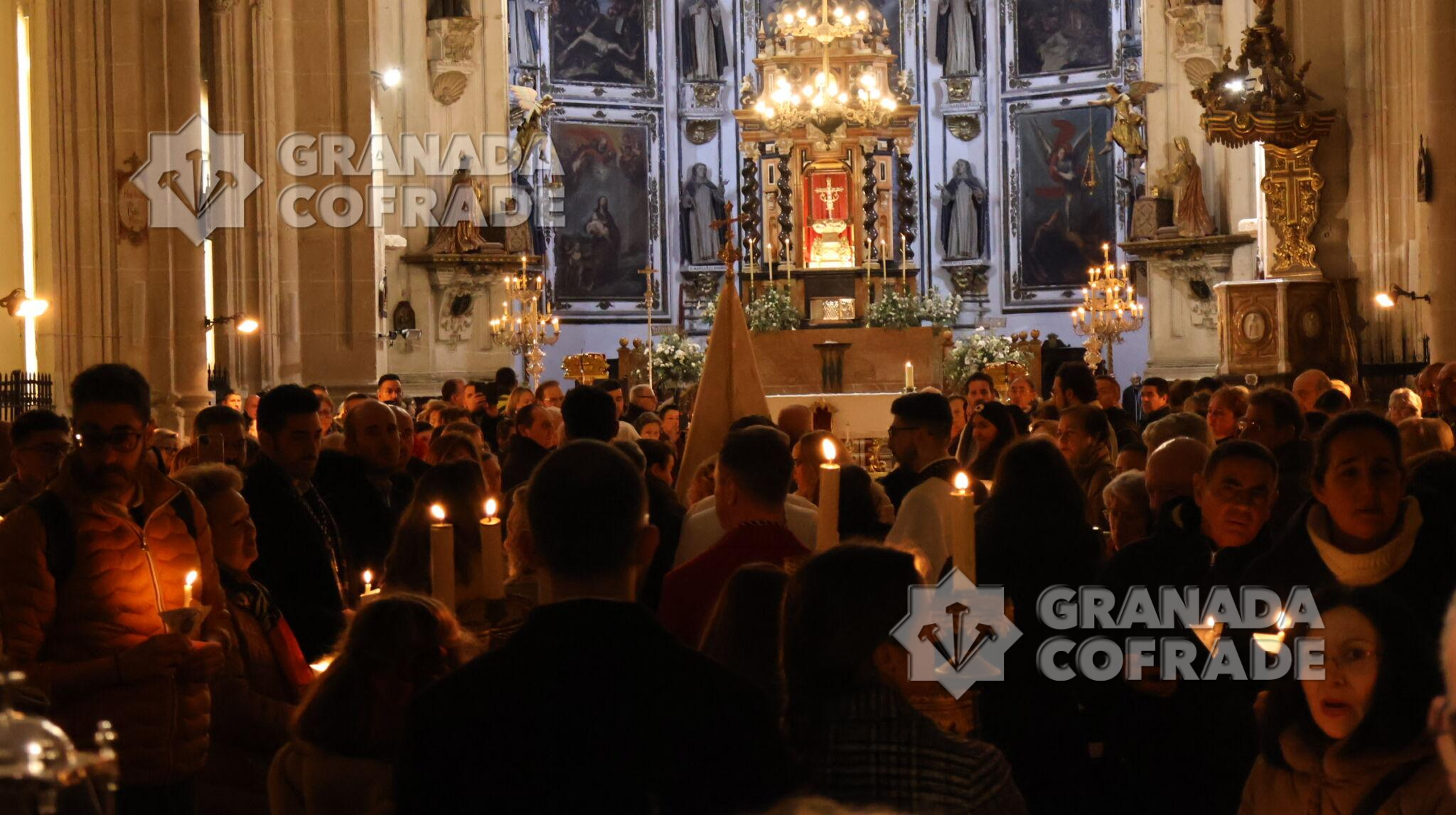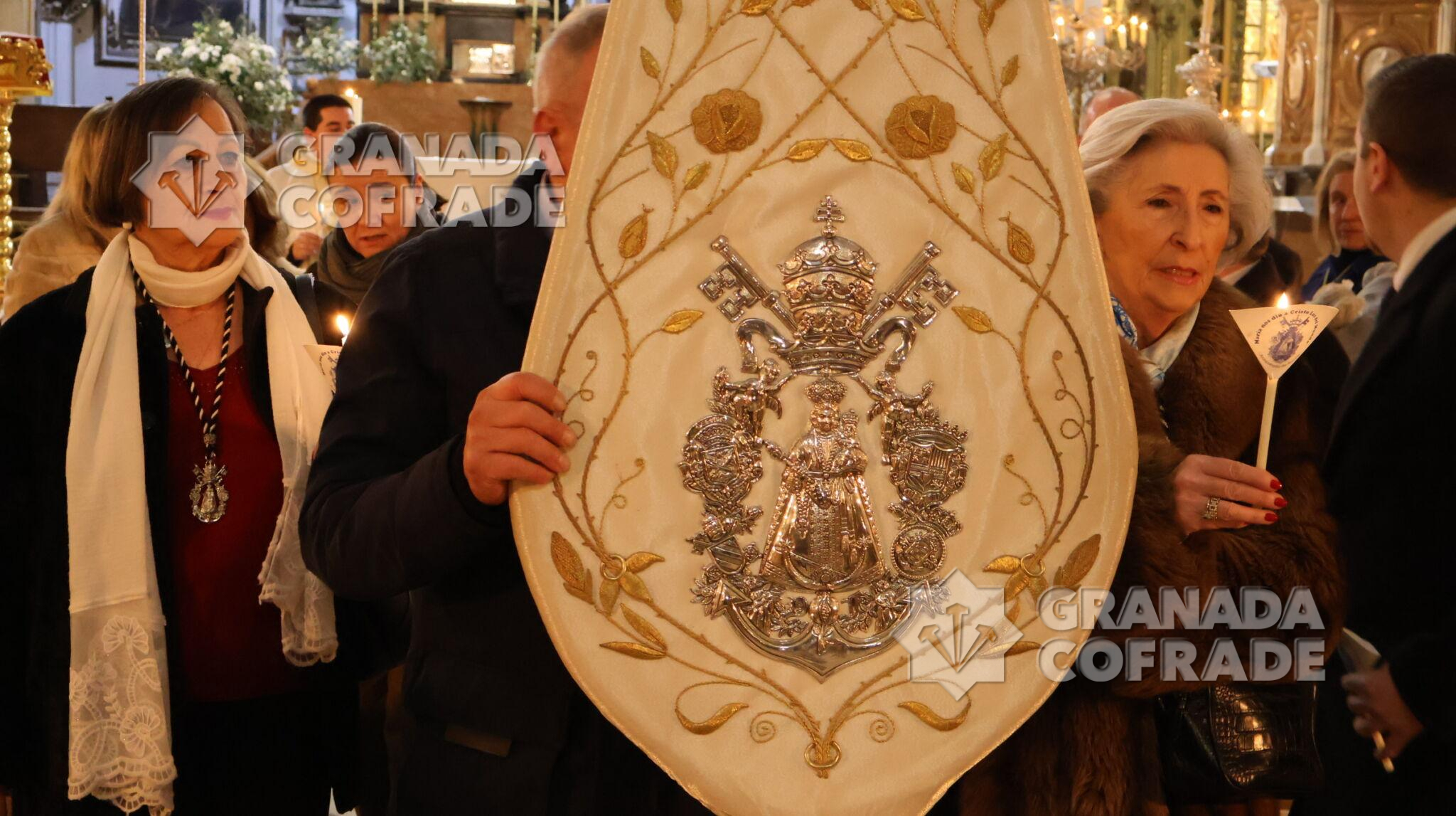 Hacía más de veinte años que la procesión de la Candelaria, de Santo Domingo, no recorría la plaza de su nombre, del barrio del Realejo. Y lo hizo a lo grande, lejanos aquellos años de comienzo de siglo en los que apenas una treintena de fieles precedían la imagen de la Santísima Virgen recorriendo este lugar alrededor de la escultura de Fray Luis de Granada. Ahora, después de la rápida recuperación de esta costumbre, la Archicofradía de Nuestra Señora del Rosario, Copatrona de Granada, se vio acompañada por más de trescientas personas que obligó a doblar la fila por la plaza de Santo Domingo de manera que al unirse la cruz alzada del comienzo del cortejo aun no había salido la imagen de la Virgen y determinaron hacer un giro en dirección a la escultura del fraile dominico, rodearla y dar tiempo a que terminara de salir al imagen, vicaria de la del Rosario, que se emplea en estos últimos años para presidir la procesión.