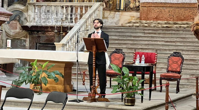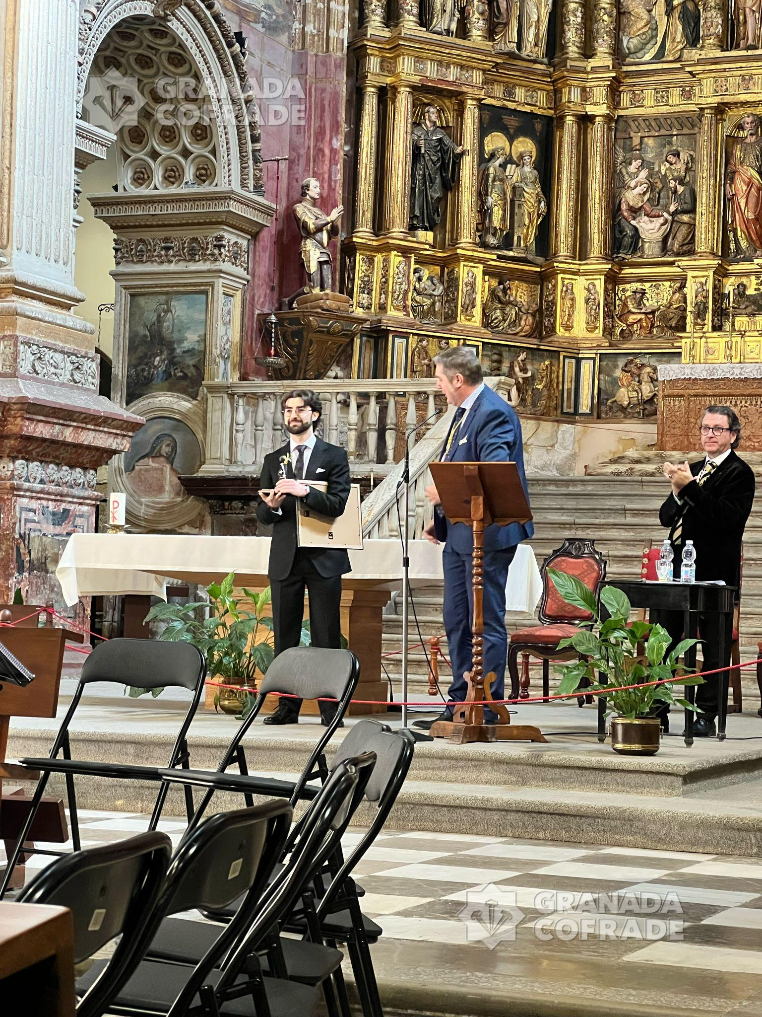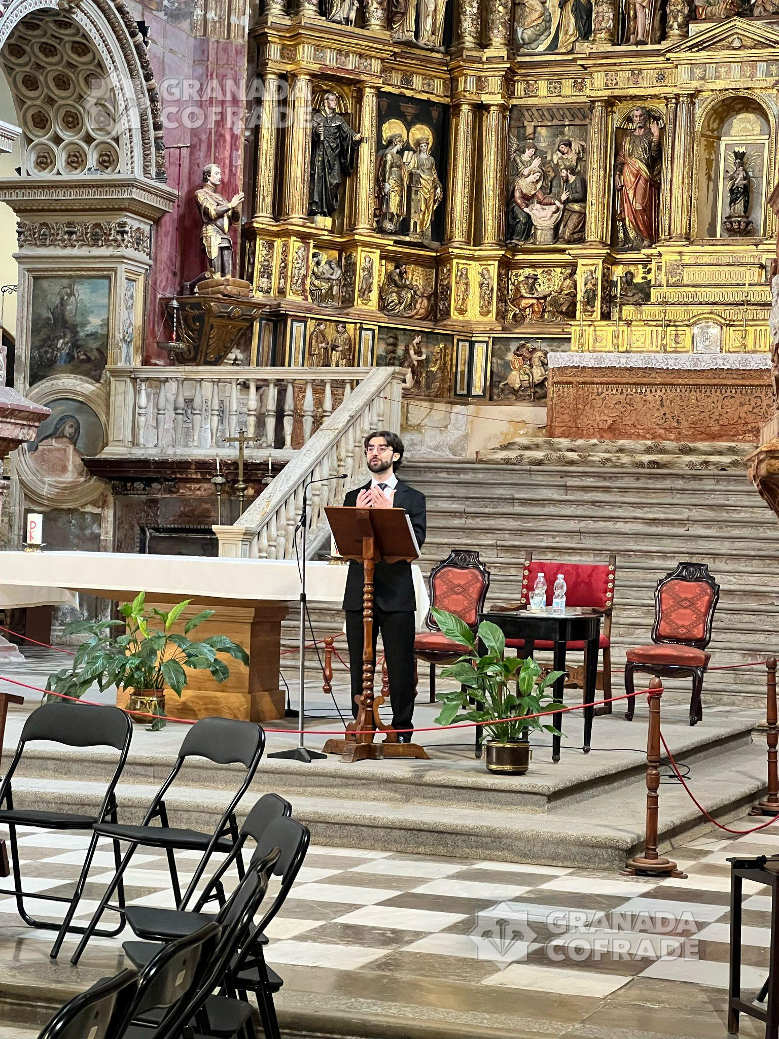 Fue un viaje literario y devocional que recorrió la historia centenaria de la cofradía de Nuestra Señora de la Soledad y Descendimiento del Señor. El responsable de pregonar a esta hermandad del monasterio de San Jerónimo fue el periodista y profesor Álvaro Ramos quien realizó un paseo por la historia de la cofradía del Viernes Santo desde sus orígenes en el siglo XVI hasta los tiempos actuales. Una hermandad que ha tenido capacidad «de adaptarse a los tiempos y las circunstancias pero manteniendo siempre intacta su esencia», dijo el pregonero en su intervención. Álvaro Ramos refirió su experiencia en la hermandad en el año 2015 y tomando como hilo conductor su cortejo procesional y los lugares emblemáticos de su itinerario, realizó un repaso por los momentos de la reorganización de la cofradía en 1925, recordó «los contratiempos que sufrió y que la llevaron a punto de la desaparición», haciendo especial referencia a las características personales de la cofradía, las chías, el color de sus túnicas penitenciales o la liberación de un preso.