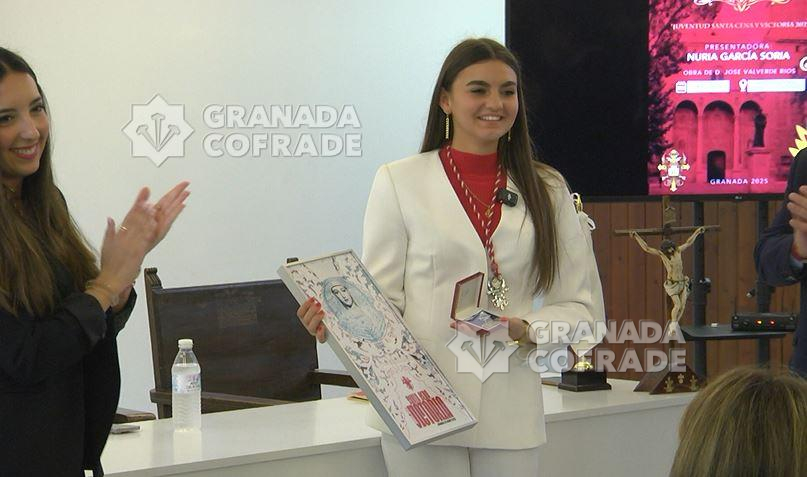 Emotivo y sentida presentación del cartel del Grupo Joven de la hermandad de la Santa Cena Sacramental. «Hoy esta niña está aquí delante del atril, presentando el cartel de su hermandad con muchisima ilusión, viviendo y cumpliendo un sueño que jamás imaginó que podría pasar», señalo la joven integrante de esta hermandad del Domingo de Ramos. Fue Nuria García Soria la encargada de dar a conocer la obra que el diseñador granadino José Valverde ha realizado para anunciar la salida penitencial de la cofradía de la Santa Cena Sacramental. Con gran desparpajo la presentadora recreó una conversación en la que una madre explica la realización del cartel señalando que «veo una pintura de una Virgen muy guapa, blanquita de piel y que no tiene lágrimas» indicando el autor de la obra y sus datos biográficos de este artista granadina que ya ha realizado numerosos carteles en la Semana Santa granadina, en Málaga y que es hermano de los Favores y de las Tres Caídas, de la hermandad del Trabajo y de Jesús Despojado.