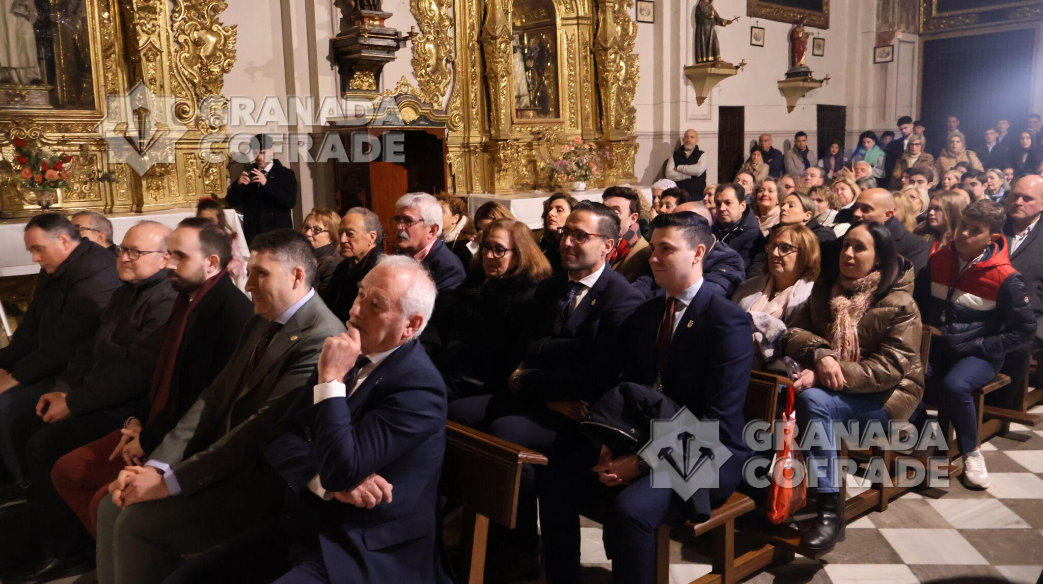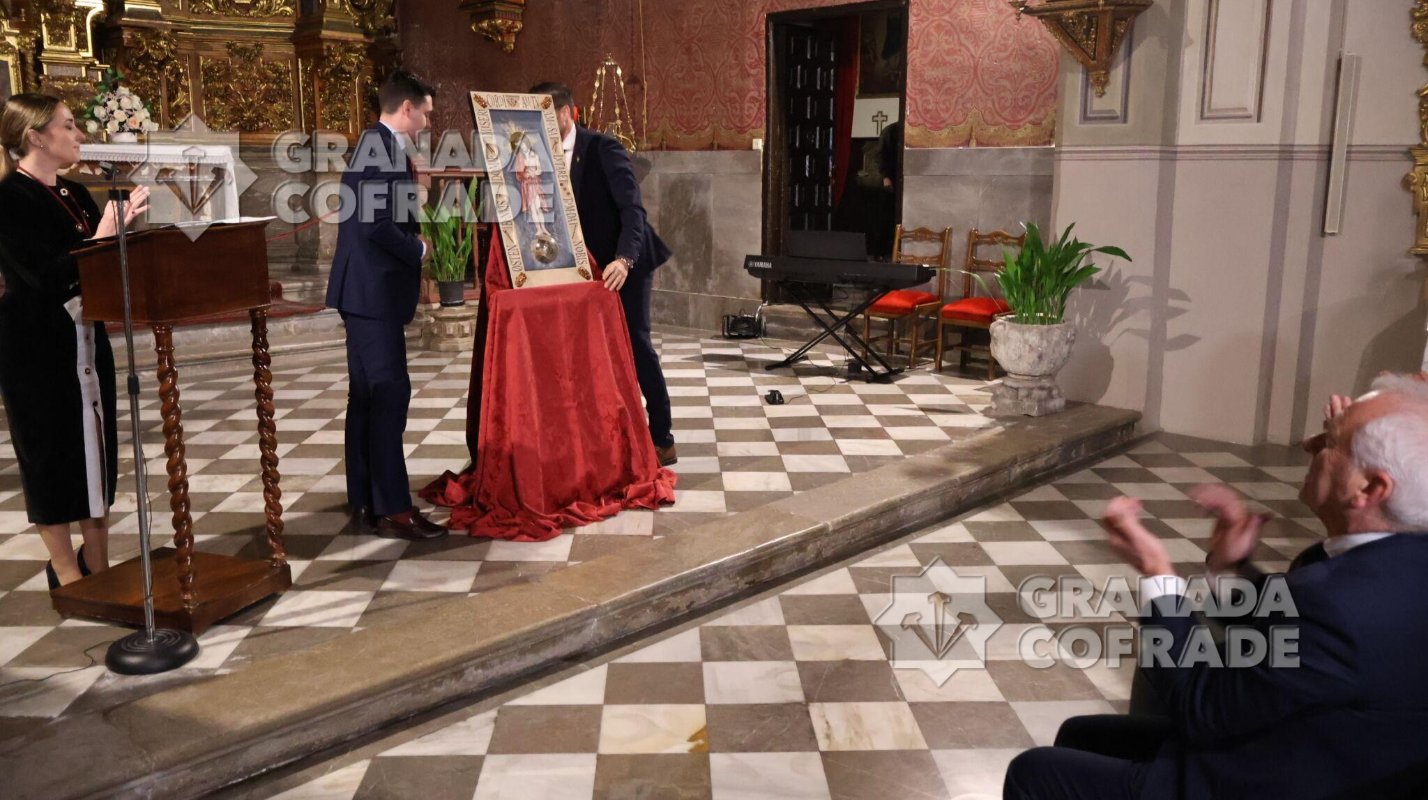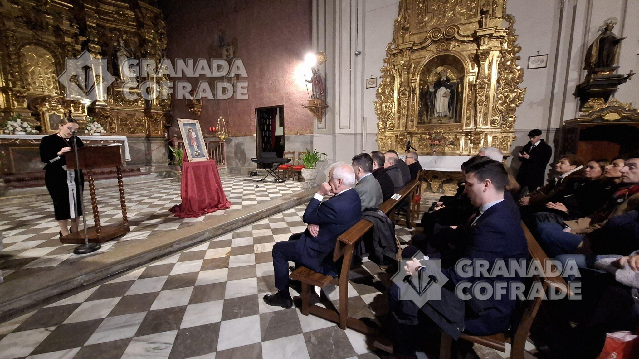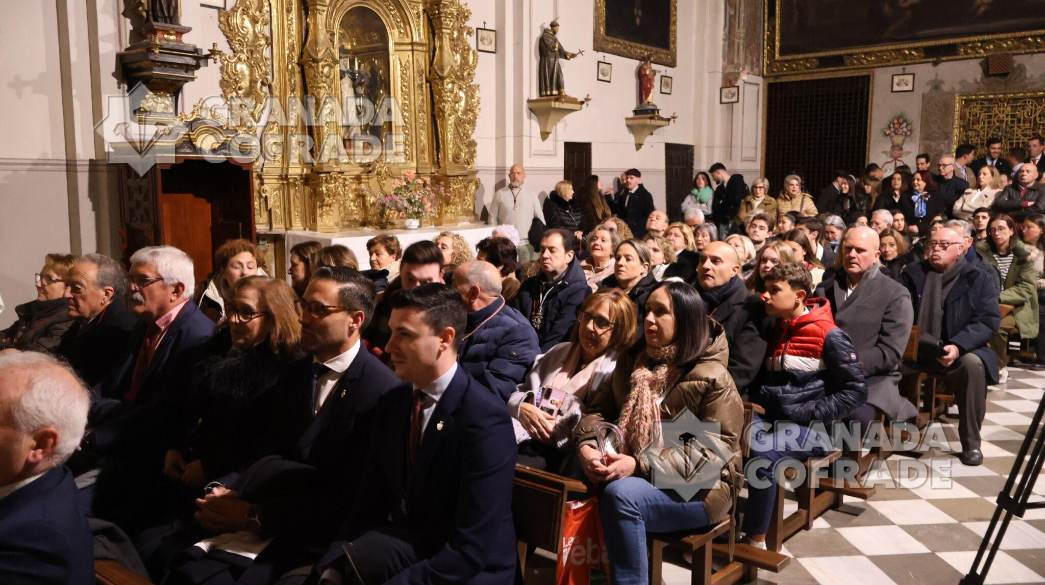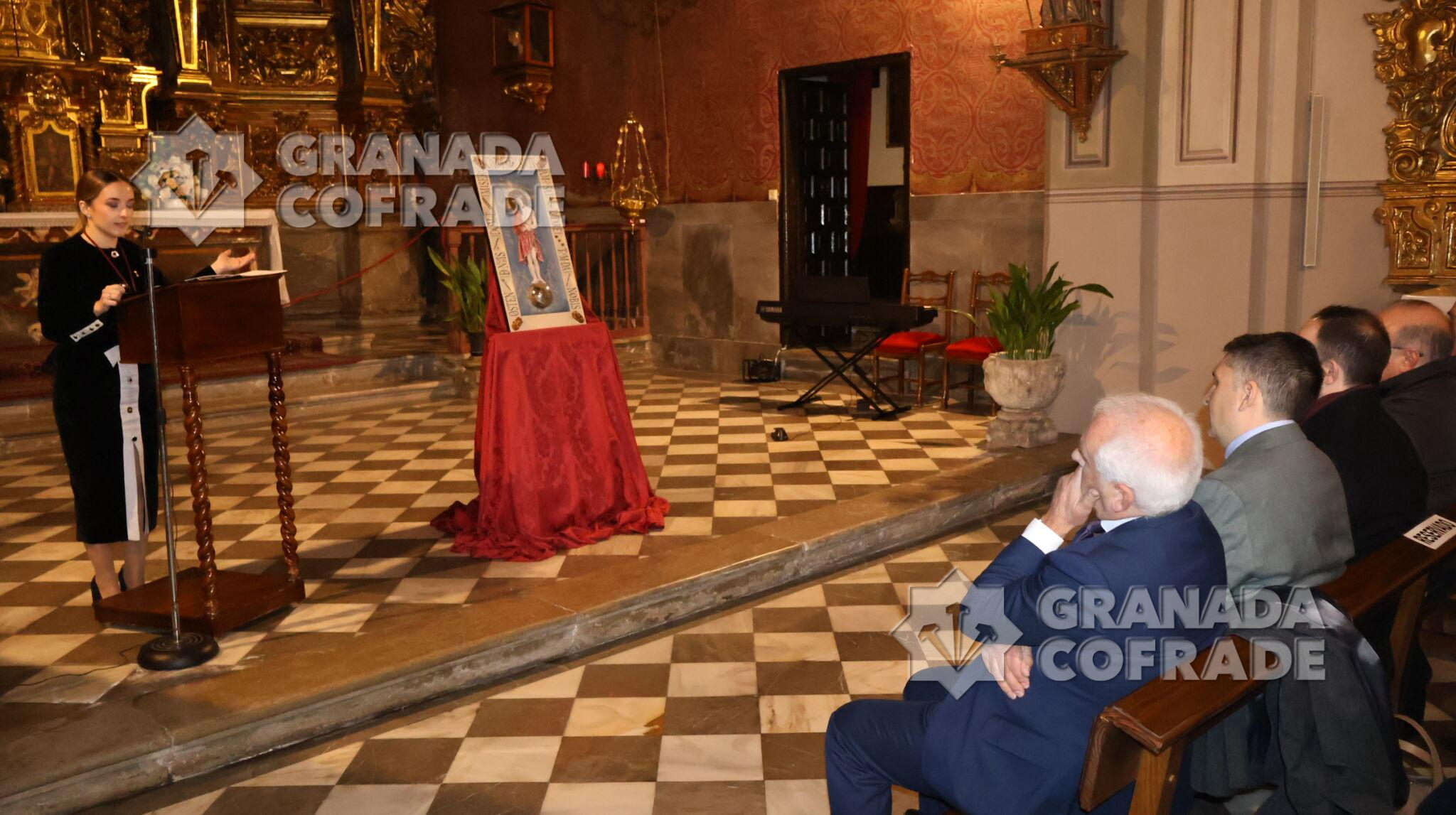 Lleno en la capilla de la iglesia conventual de la comunidad de religiosas de Santa Catalina de Siena para ver el cartel, «una creación artística que lejos de ser una simple obra pictórica cobra vida en la tridimensionalidad en un humilde homenaje a la escultura del gran imaginero José de Mora», como indicó la presentadora. Habló de «quien dio vida al Señor de la Sentencia y es por ello por lo que se rematan en las esquinas con los mascarones pétreos que custodian el carmen albaicinero, donde al volver a Granada habitó el escultor» recordó la presentadora. En un toto sereno y reflexivo Marta Alejandra Jiménez transcribió el el salmo 84 en latín que significa «Muéstranos Señor tu Misericordia y danos tu Salvación». «He aquí el que quita los pecados del mundo, así nos muestra Pablo Fernández Hurtado al Señor de la Sentencia en un relicario de compleja sencillez donde la tradición de los óleos, pigmentos, lápices pastel, arcilla y madera se funden con la modernidad de un papel impreso o un acetato de polivinilo a modo de orbe mundial sobre el que se refleja la figura del Señor de la Sentencia. Marta Alejandra Jiménez refirió del cartel que recoge «un mundo conformado tanto por escenas del arte clásico en el que se representan las capacidades humanas así como por noticias actuales que nos hacen reflexionar en si a pesar del paso de los siglos la humanidad sigue inmersa en los mismos pecados primitivos» indicó la presentadora de esta original obra de arte. Estaba el hermano mayor de la corporación y presidente de la Federación de Cofradías, Armando Ortiz, y miembros de su junta de gobierno, acompañados por los directores espirituales de la cofradía, los párrocos Manuel García Gálvez y José Gabriel Martín.