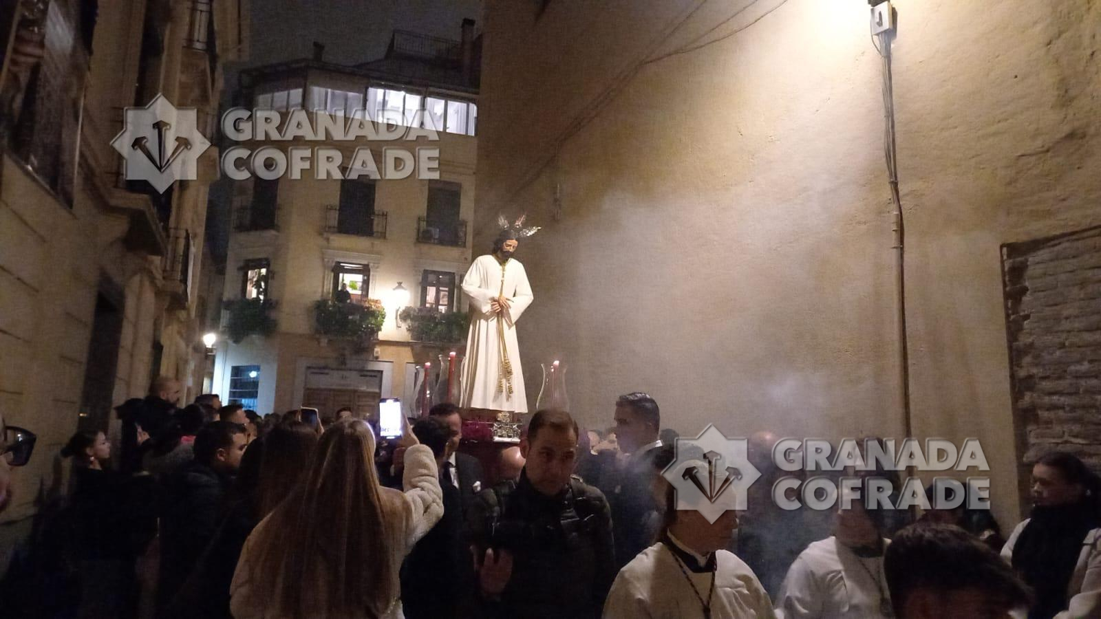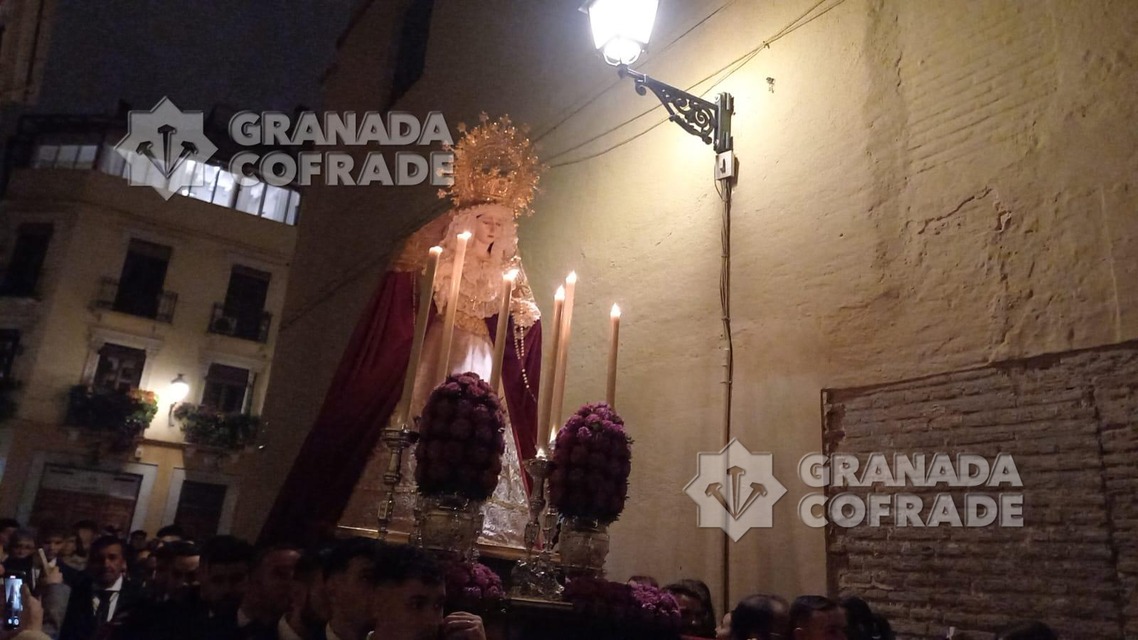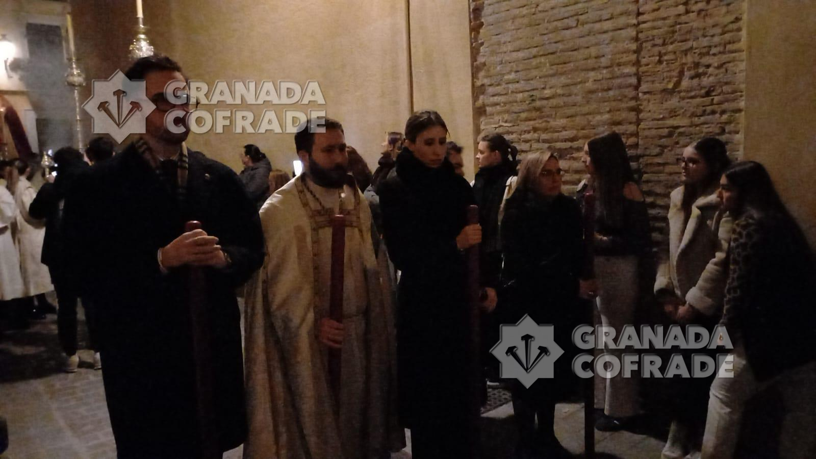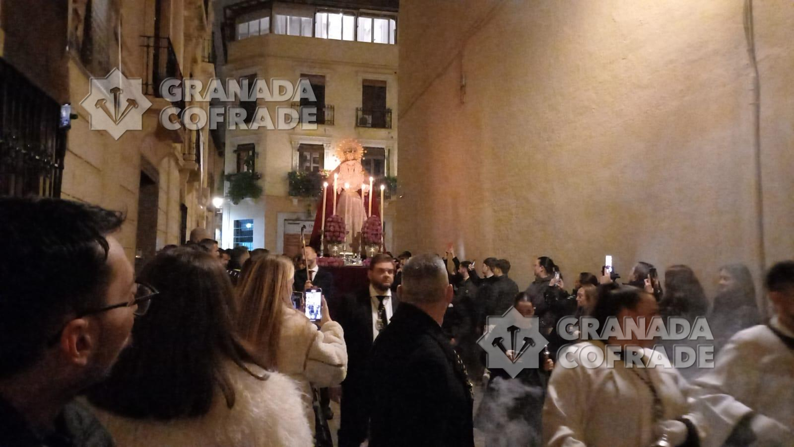 Dieciséis parejas de hermanos acompañaron al cortejo, en donde se presentaba al Señor con su tradicional túnica blanca y a la Virgen con saya brocada en color champagne amarronado y manto burdeos por su vestidor, Javier Núñez. Algo más de una hora tardó en completarse dicho traslado, por Niños Luchando y Cocheras de Santa Paula, adentrándose así por el barrio del Boquerón y desembocando en San Jerónimo, para acceder por la Plaza de la Romanilla y el Pie de la Torre a la plaza de Alonso Cano. En la presidencia de la hermandad, su hermana mayor, Alejandra Cabrera, junto al consiliario de la cofradía, Jaime Garrido García-Valdecasas, y la pregonera de la Semana Santa, María del Carmen Sánchez.