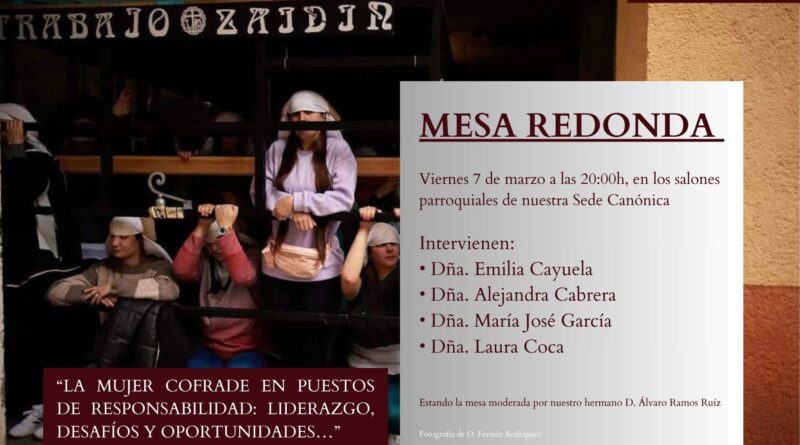El próximo viernes, Después de Ceniza, 7 de marzo a las 20:00h en los salones parroquiales de la hermandad del Santísimo Cristo del Trabajo, la hermandad de la parroquia del Corpus Christi convoca una mesar redonda con el título «La mujer cofrade en puestos de responsabilidad: liderazgo, desafíos y oportunidades». En esta cita está previsto que participen Emilia Cayuela, Alejandra Cabrera, María José García y  Laura Coca. La mesa estará moderada por el hermano de la corporación, en periodista Álvaro Ramos Ruiz.
