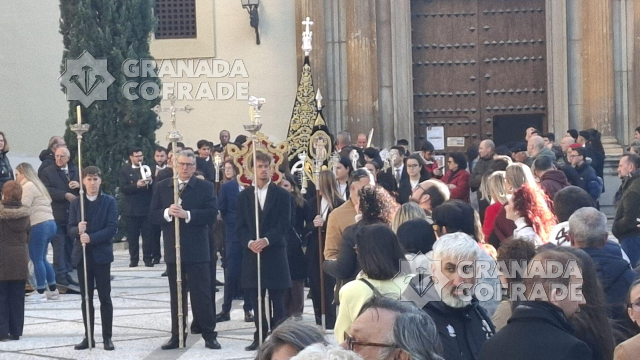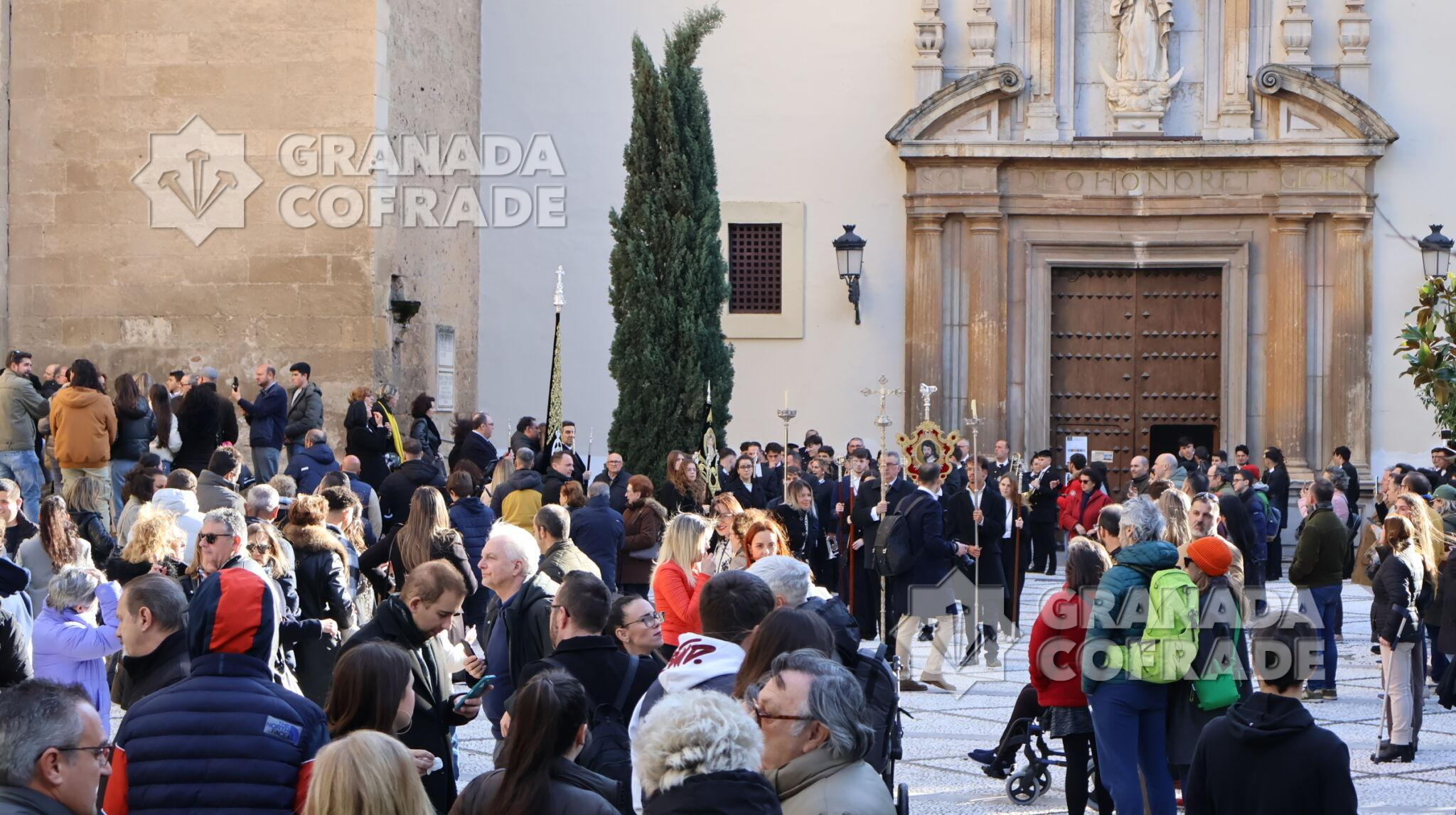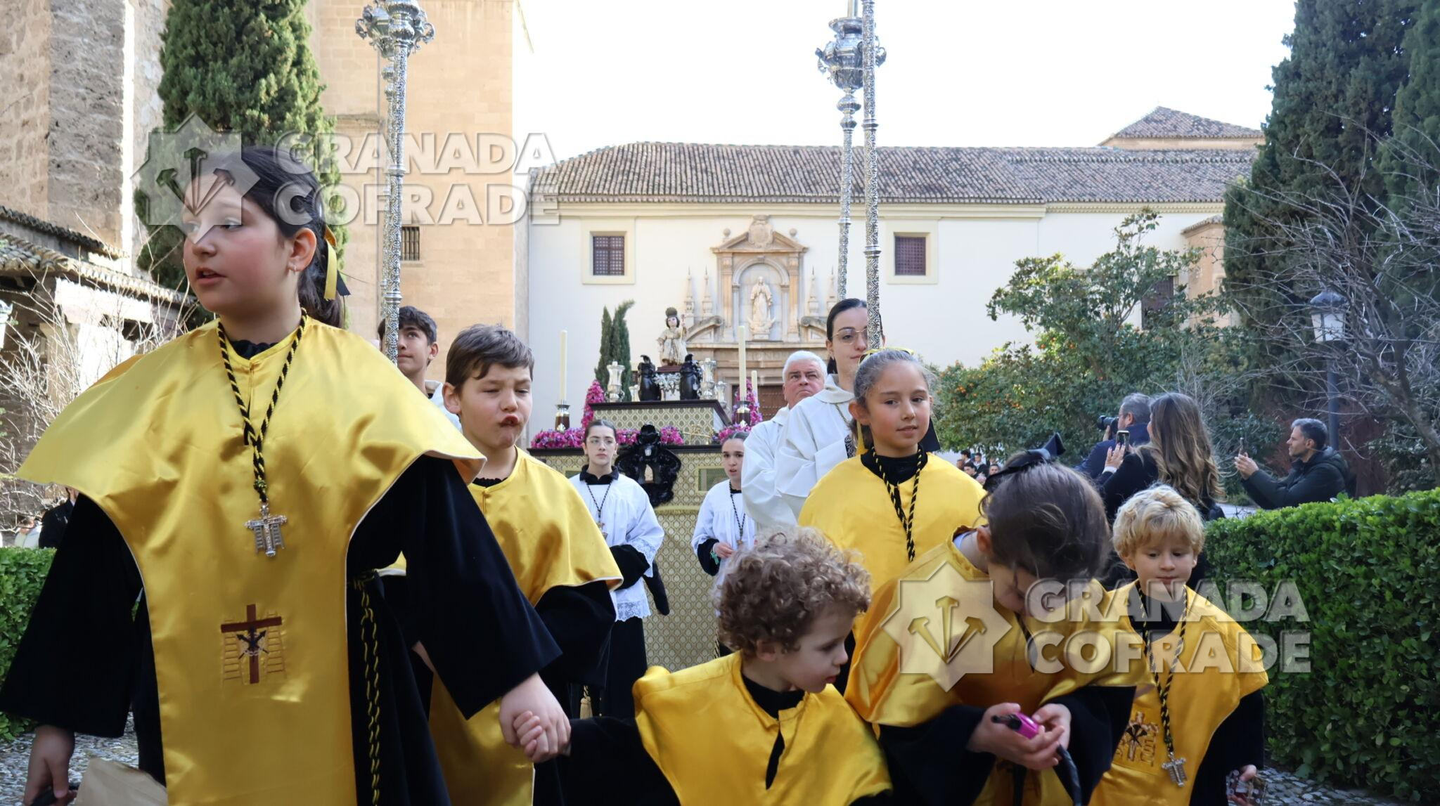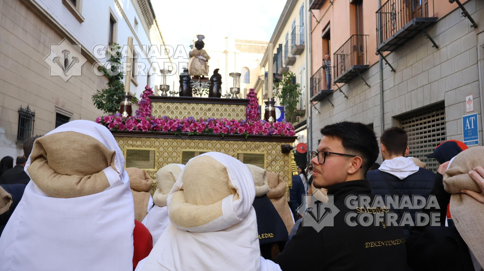 La imagen del Divino Redentor del monasterio de San Jerónimo, cedido a la hermandad de Nuestra Señora de la Soledad y Descendimiento del Señor por la comunidad de religiosas que regentan el referido templo contemplativo, presidió ayer tarde la procesión juvenil de esta corporación nazarena por las calles del centro de Granada. Partió desde el monasterio renacentista con un cortejo integrado por hermanos veteranos de la hermandad y miembros de la junta de gobierno. Ciriales precediendo el paso procesional realizado para esta salida de los costaleros que son cantera del futuro para esta cofradía.