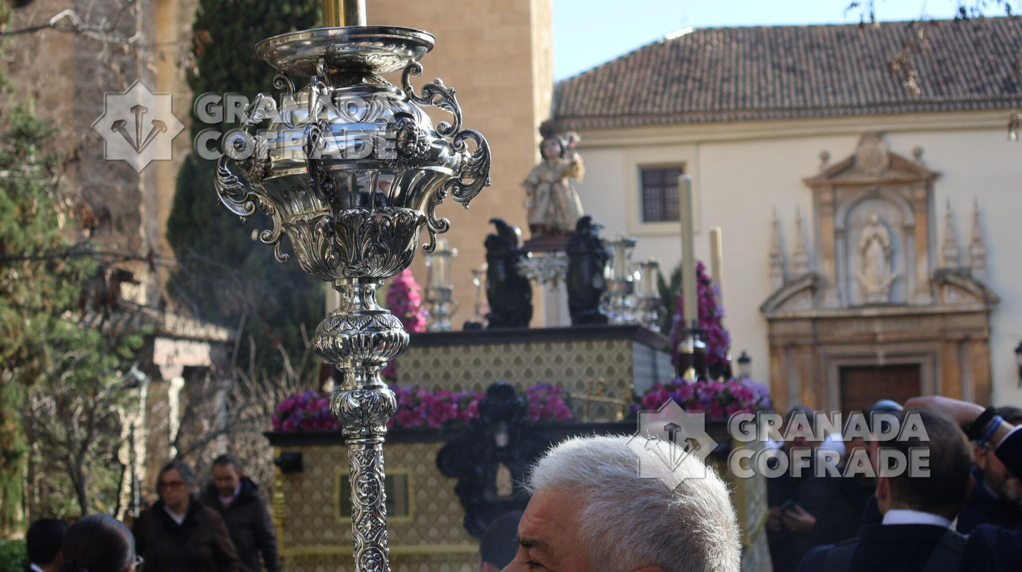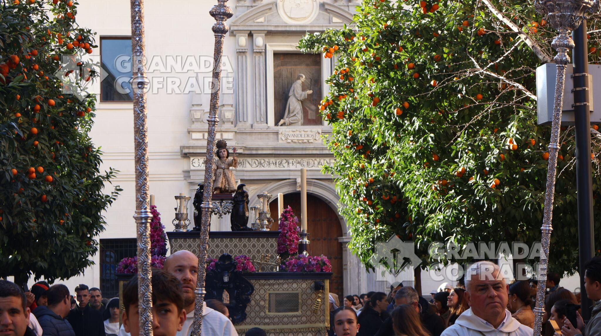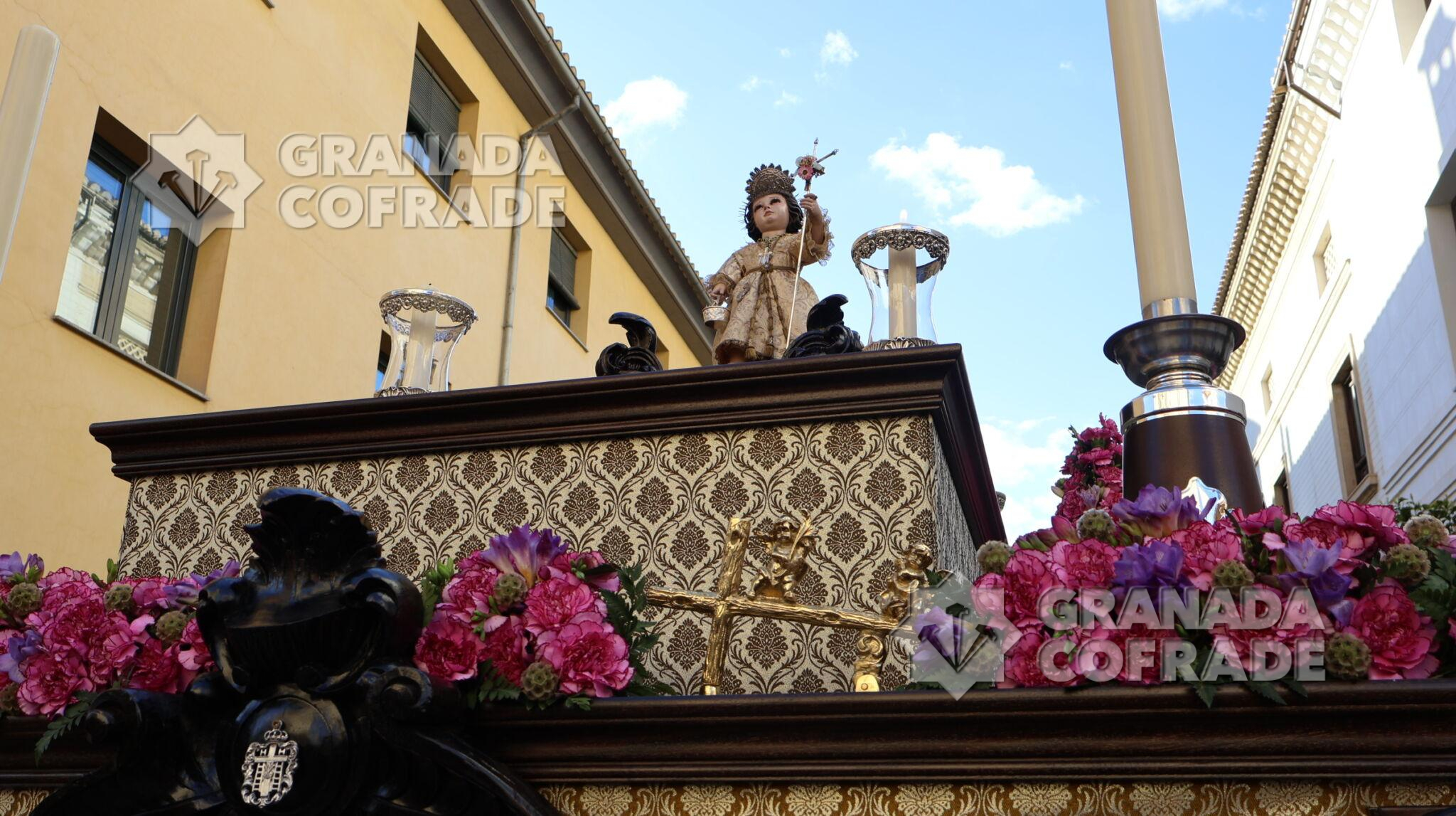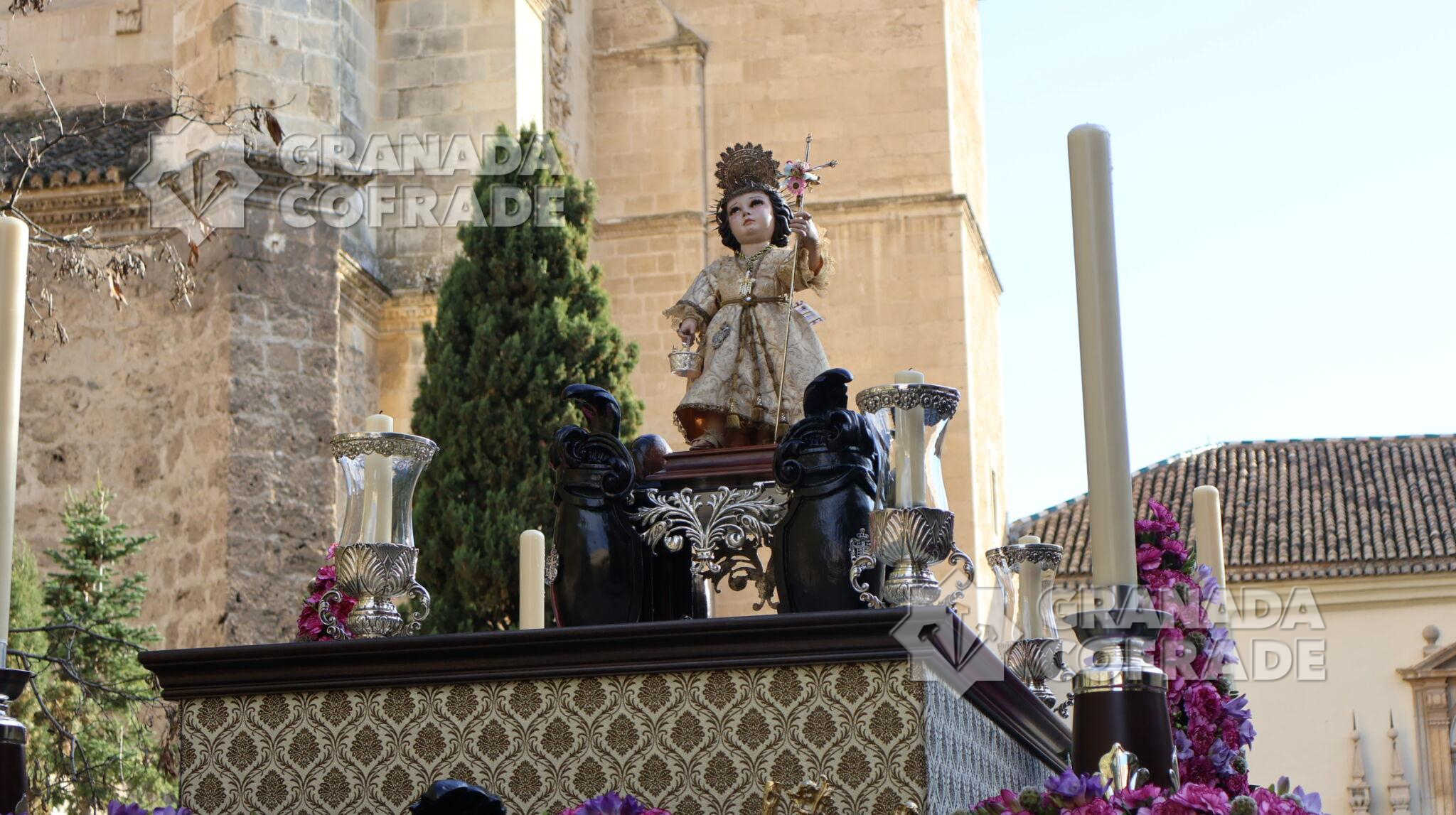 Orquídeas malvas y claveles morados componían principalmente el adorno floral del paso del Niño Dios, una talla fechada hacia el siglo XVIII. Formaban en el cortejo jóvenes de la hermandad de la Luz y el Trabajo, junto con miembros del grupo joven de esta cofradía jerónima y en la presidencia el hermano mayor, Patricio Carmona, junto al consiliario de la hermandad, el sacerdote agustino Francisco Ariza.