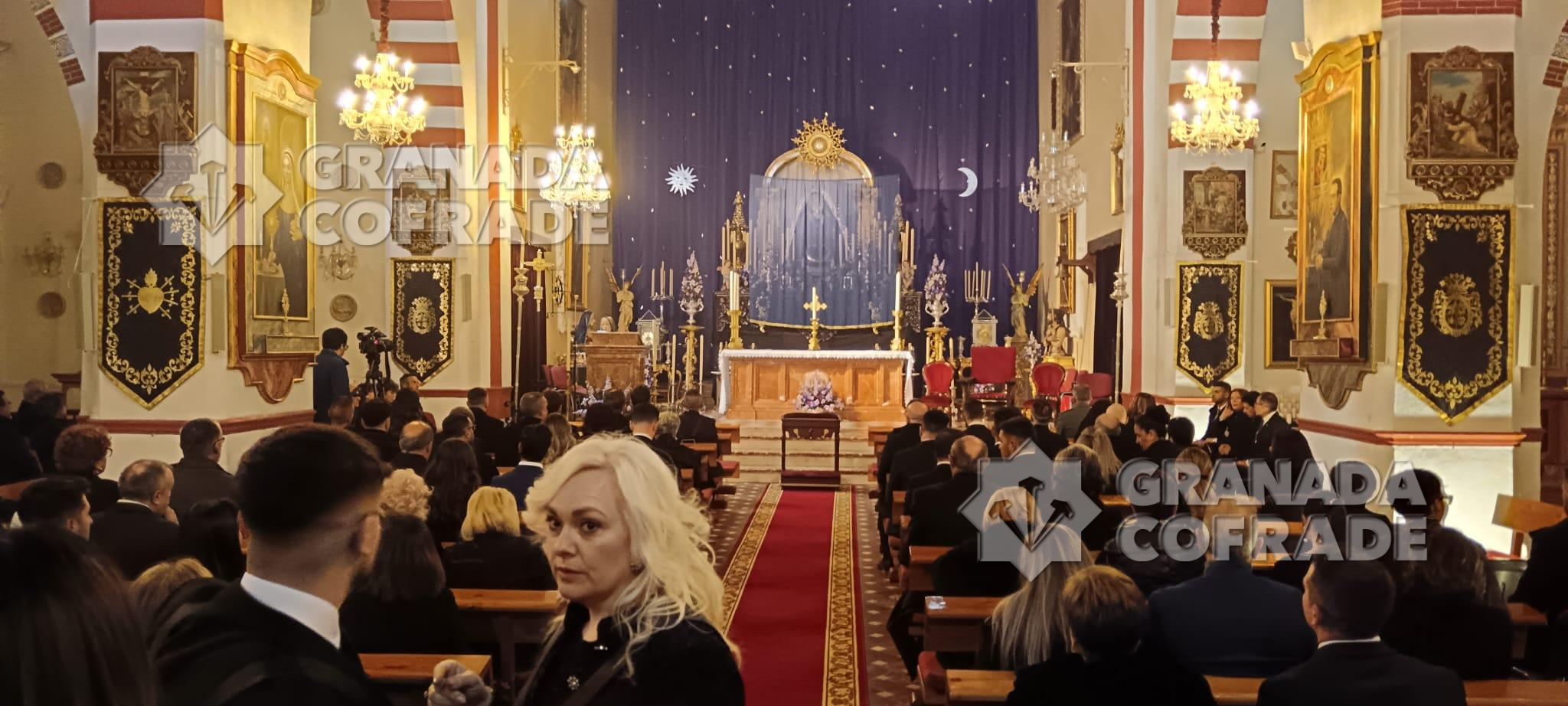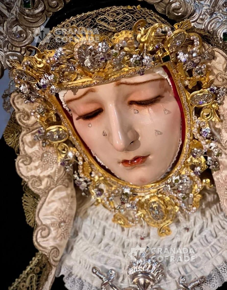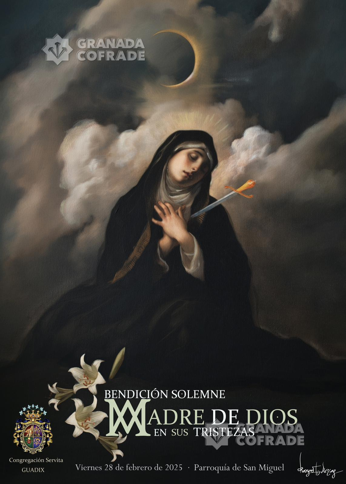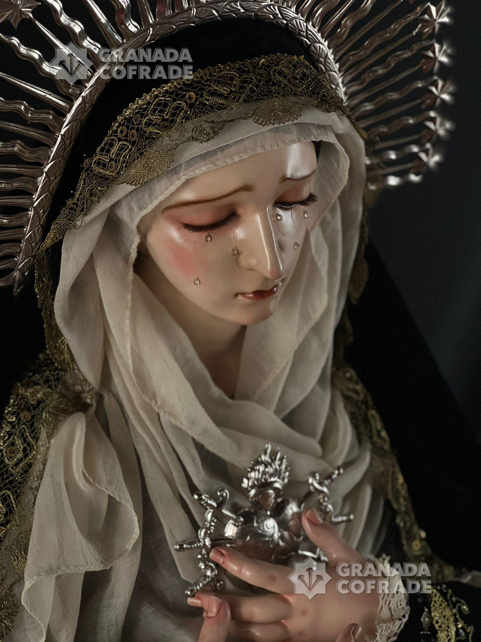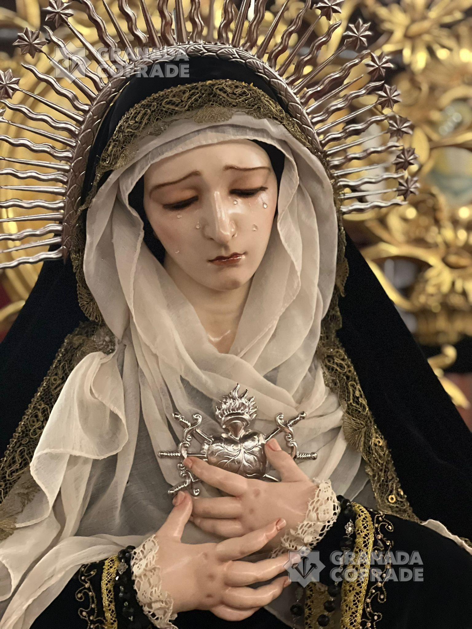 La Eucaristía de bendición corrió a cargo de Carlos Ros. La imagen es una escultura de vestir realizada en madera de cedro y policromada del más puro estilo granadino, con rasgos suaves y delicados, dolor psicológico más que físico, ensimismamiento y policromía clara. Se presenta de rodillas sobre un cojín y las manos sobre el pecho siguiendo la iconografía de las imágenes servitas. Un gran paño de tinieblas cubría todo el altar donde un bosque de cera y flor presidían la capilla mayor del templo. La Dolorosa aparecía velada hasta el mismo momento de la celebración y fue vestida por Álvaro Abril Vela estrenando enrallado y rostrillo de joyería.