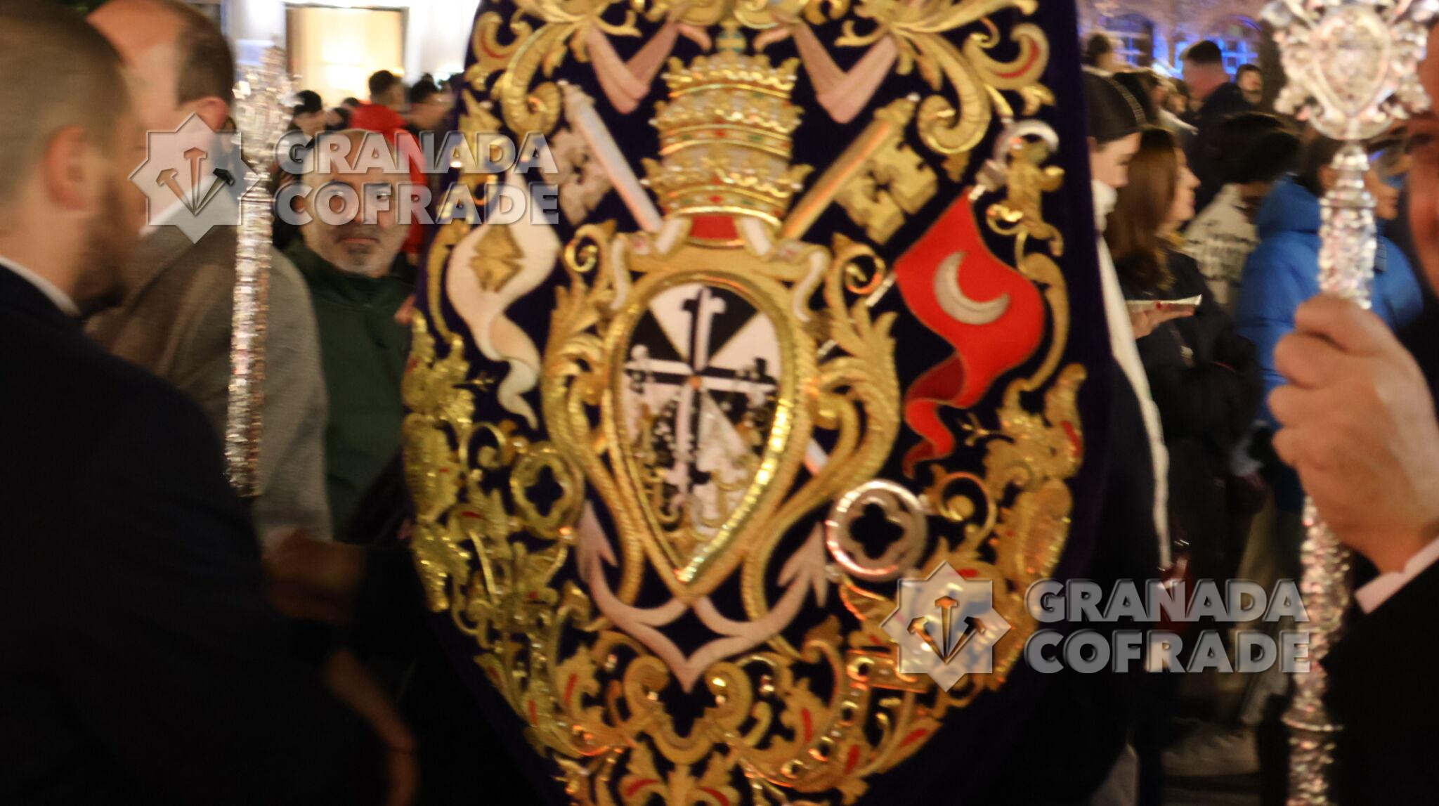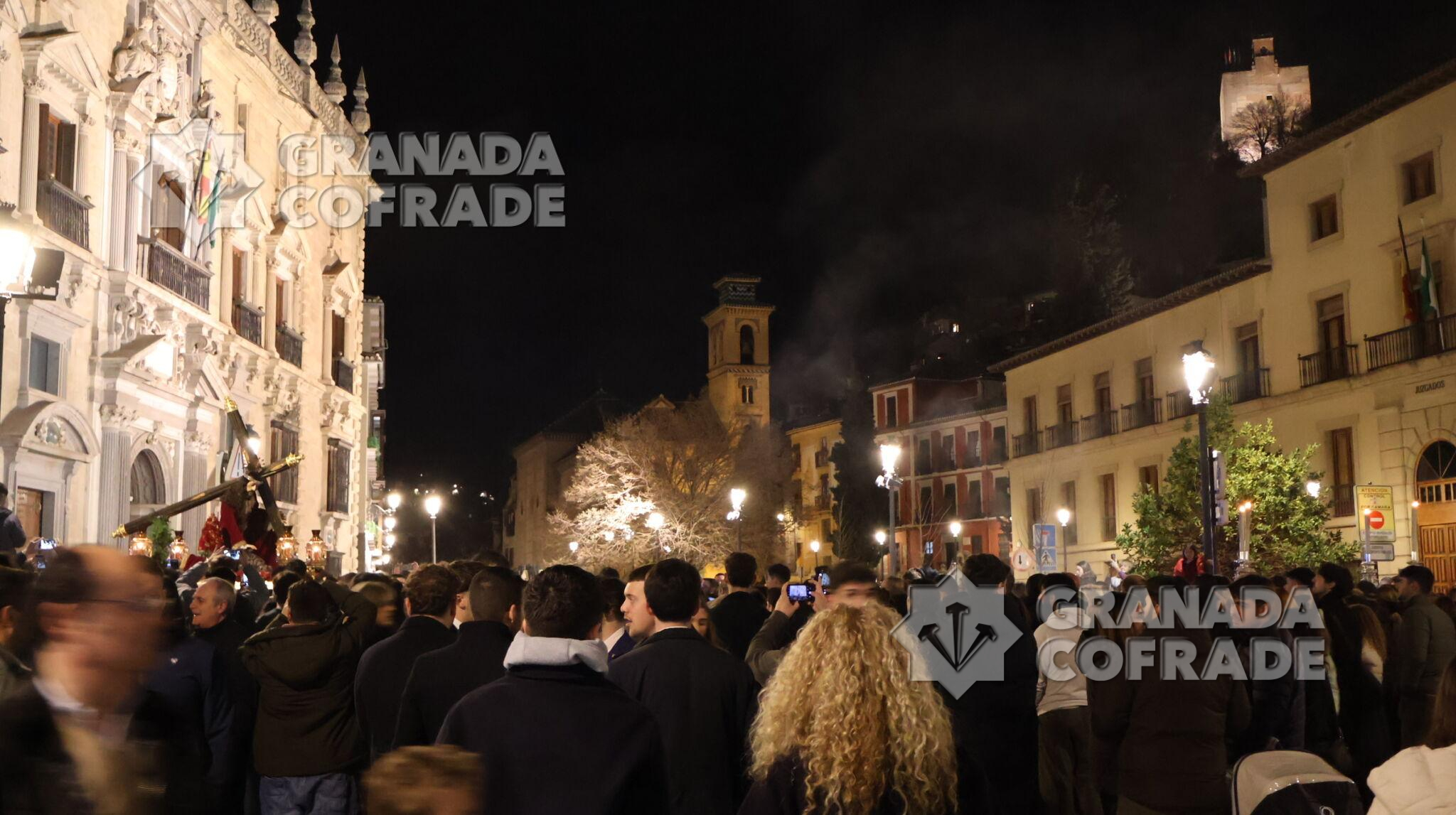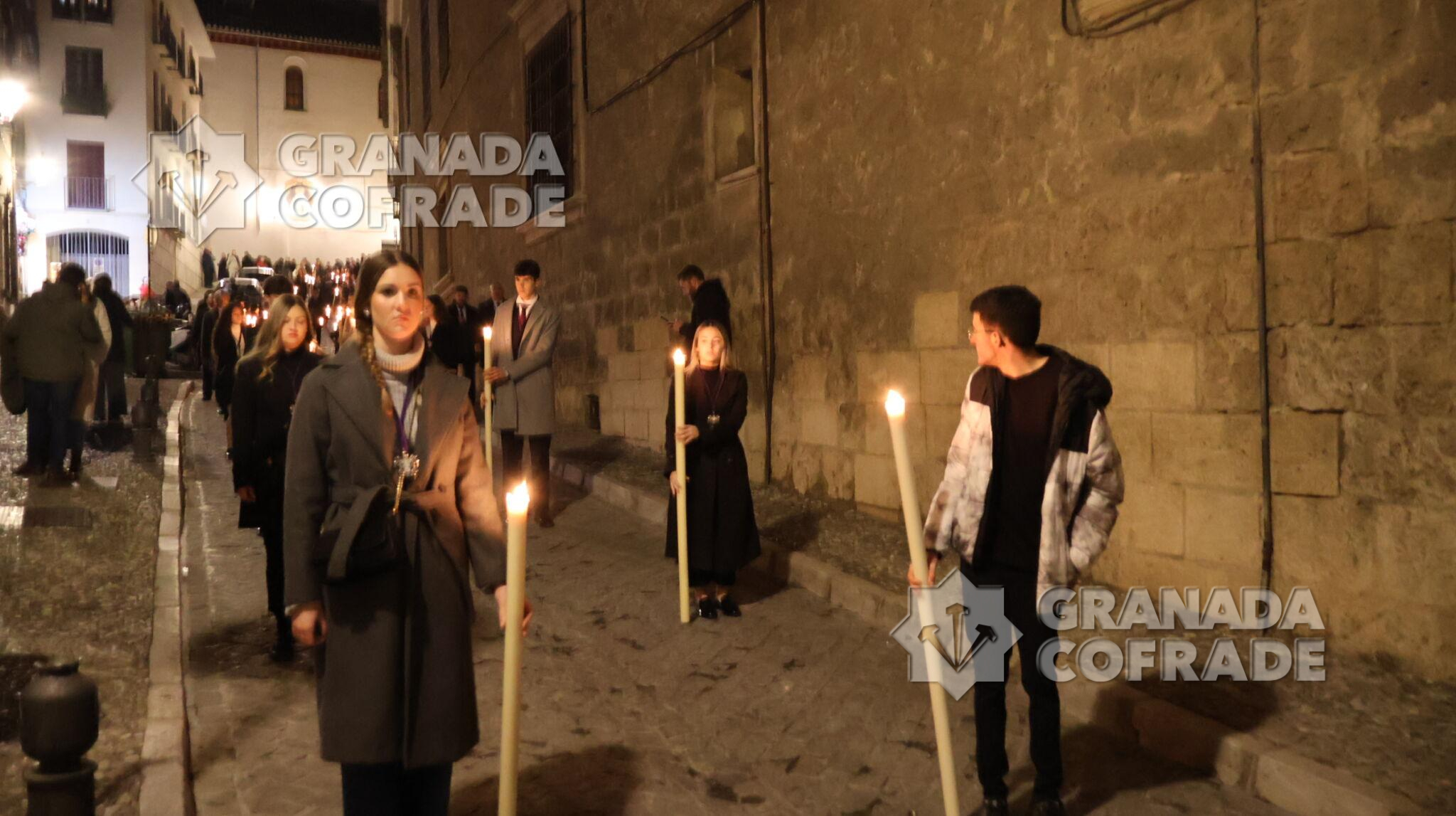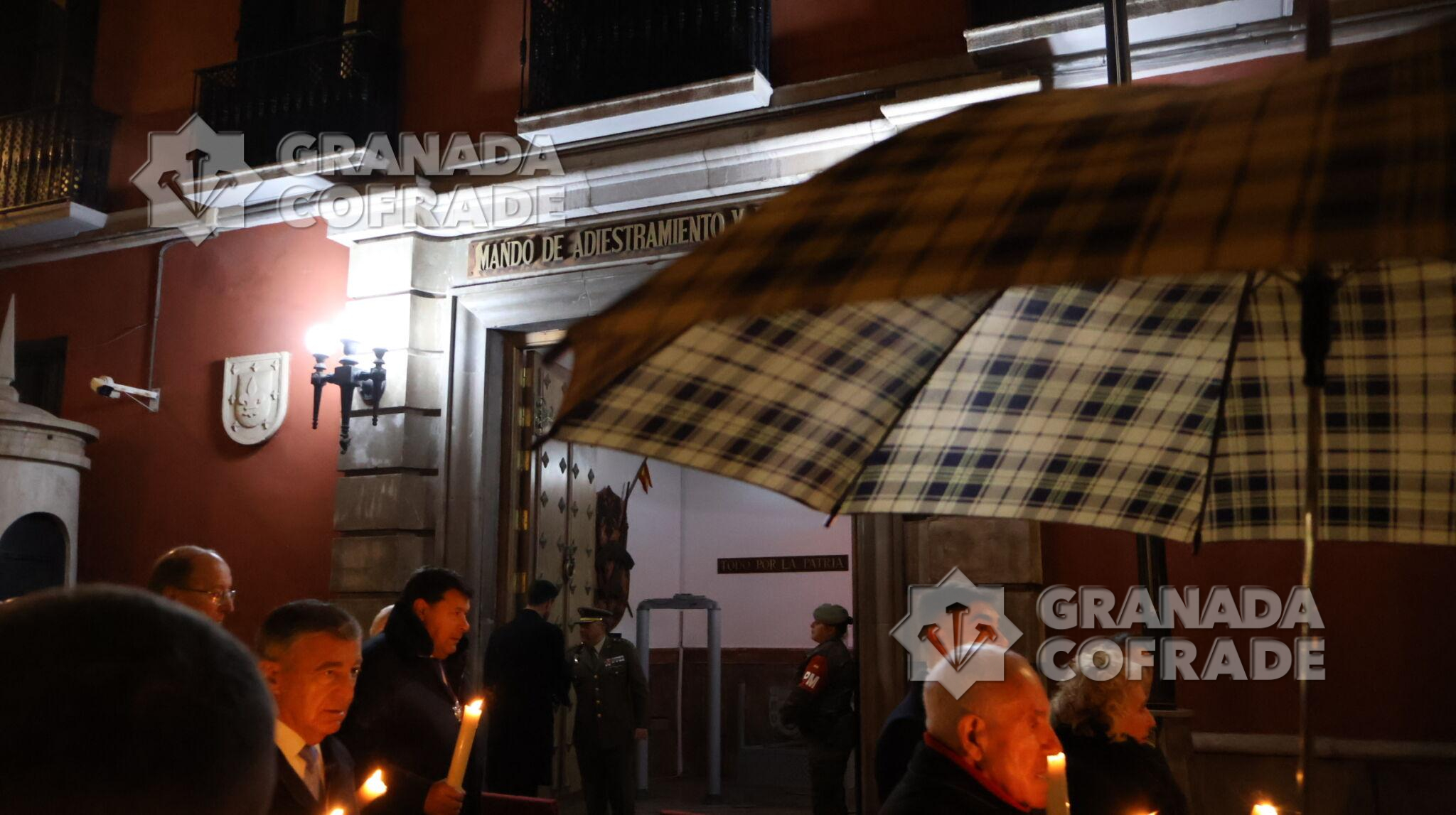 Amago de lluvia por la tarde y noche de ayer domingo que no pudo contener el deseo de la cofradía de Nuestra Señora del Rosario en sus Misterios Dolorosos para trasladar en Vía Crucis desde Santa Isabel la Real, de clarisas franciscanas, hasta el templo dominico de la plaza de Santo Domingo, como cada segundo domingo de cuaresma. La cofradía celebró la Eucaristía presidida por el sacerdote Javier Ortega, vicerrector del Seminario Mayor y delegado Episcopal para la Pastoral Vocacional de la Archidiócesis, que dirigió también el rezo del Vía Crucis que se realizó de manera ágil y evitando realizar muchas paradas por el riesgo de lluvia. De hecho al llegar a la plaza de San Juan de la Cruz, en la puerta del Madoc, comenzaron a caer tímidas gotas por lo que su paso fue rápido, sin acceder al interior como es costumbre. En la puerta estaba el Teniente General Jefe del Madoc, José Manuel de la Esperanza, quien salió a recibir el cortejo y realizó una «llamá» en las andas del Señor de las Tres Caídas.