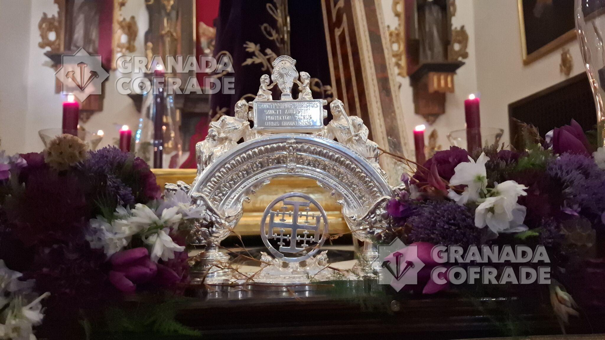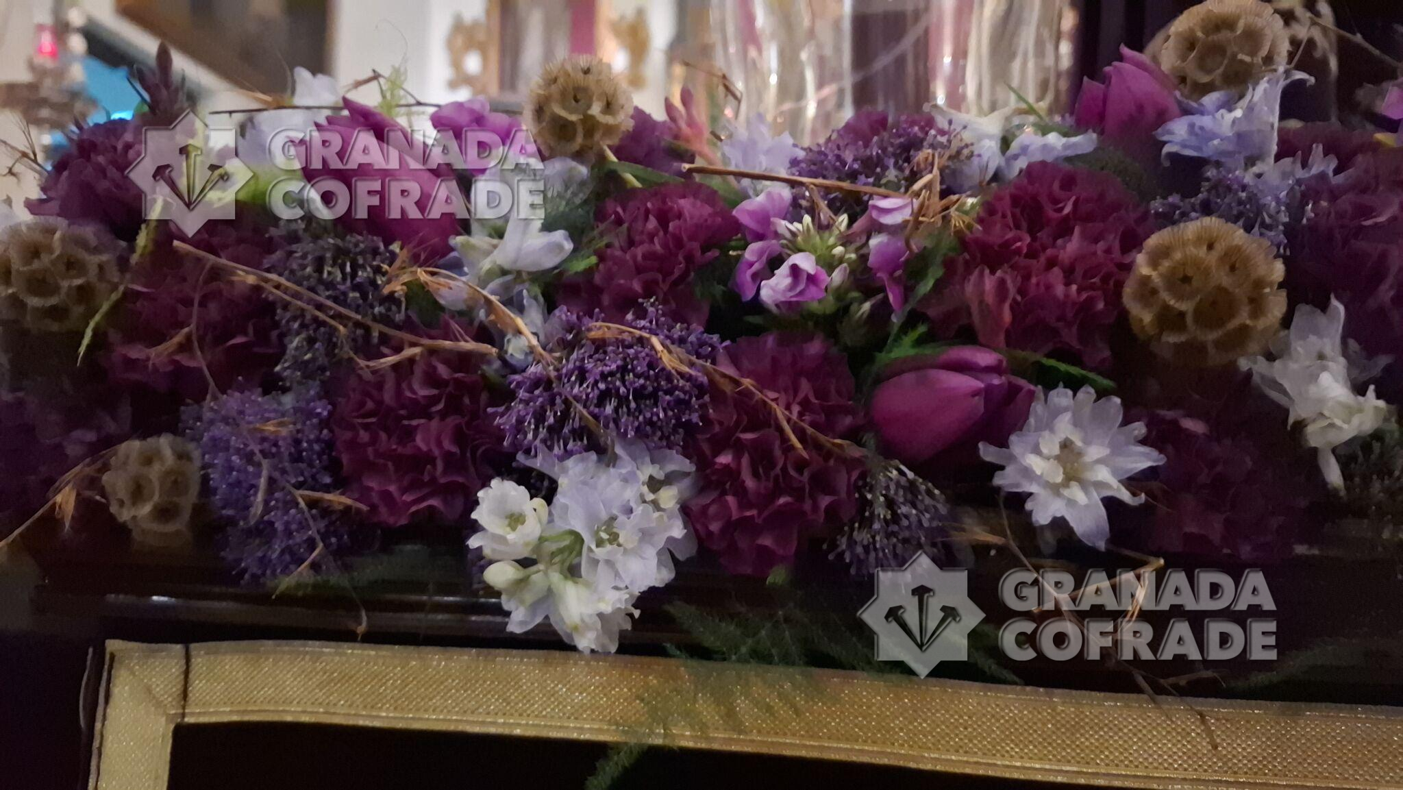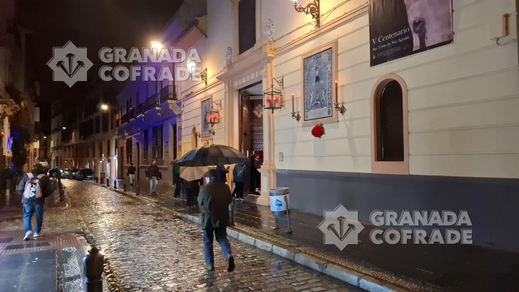 Con flor en tonalidad moradas, blancas y malvas, con fresias, claveles y tulipanes, principalmente, se había dispuesto el adorno floral de las andas de Vía Crucis de la hermandad del Santo Crucifijo de San Agustín que, finalmente, no pudo realizar su salida por las calles del entorno del templo de clarisas franciscanas. A primeras horas de la tarde y ante la lluvia que caía y que amenazaba continuar, se determinó suspender la salida del Nazareno de las Penas y del cortejo de hermanos que era bastante participativo un año más. El director espiritual de la hermandad, el redentorista Francisco José Tejerizo Linares dirigió el rezo por la noche, después de que el capellán de la comunidad religiosa, Elías Alcalde, realizare la celebración de la Eucaristía en el interior del templo.