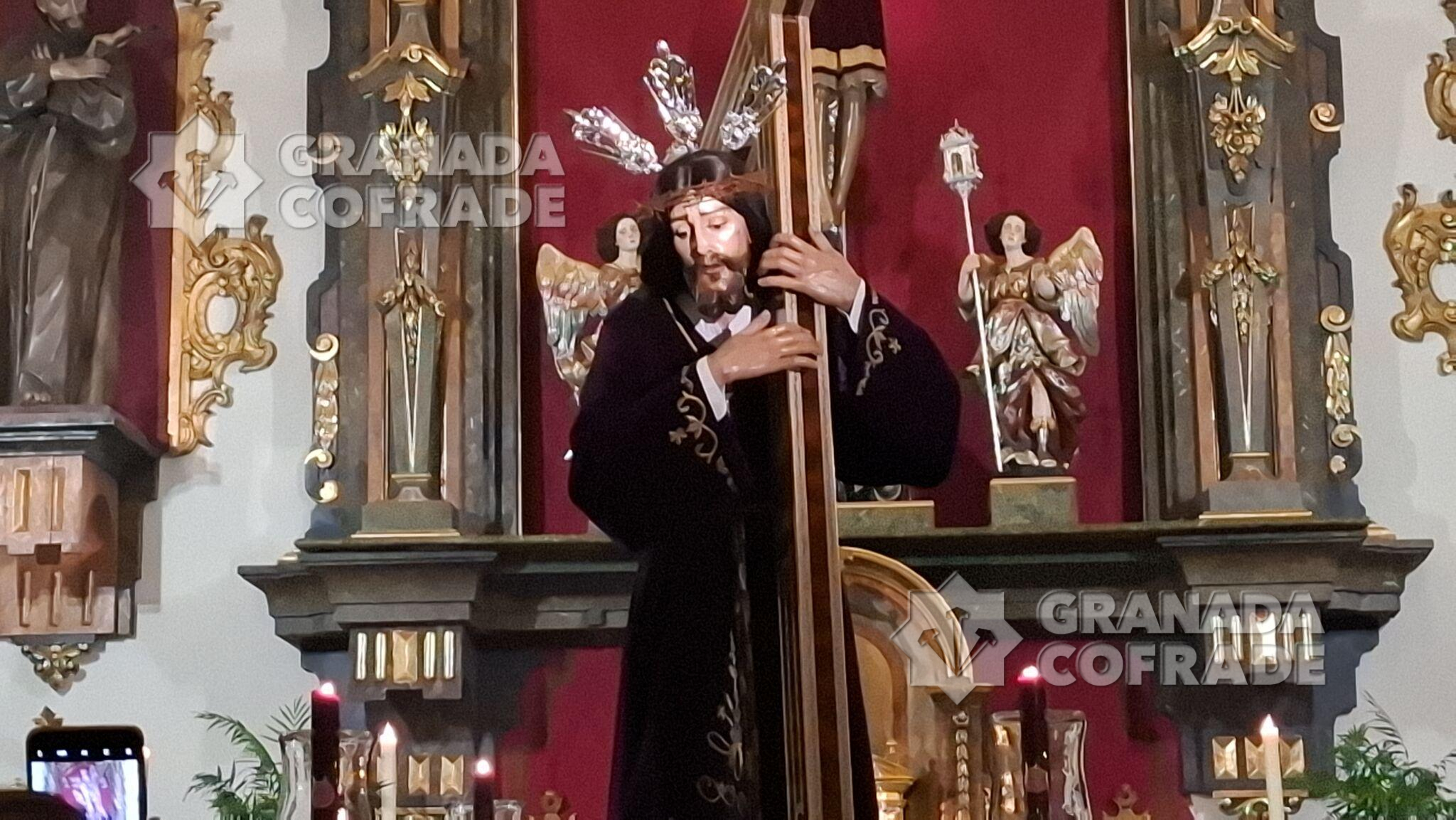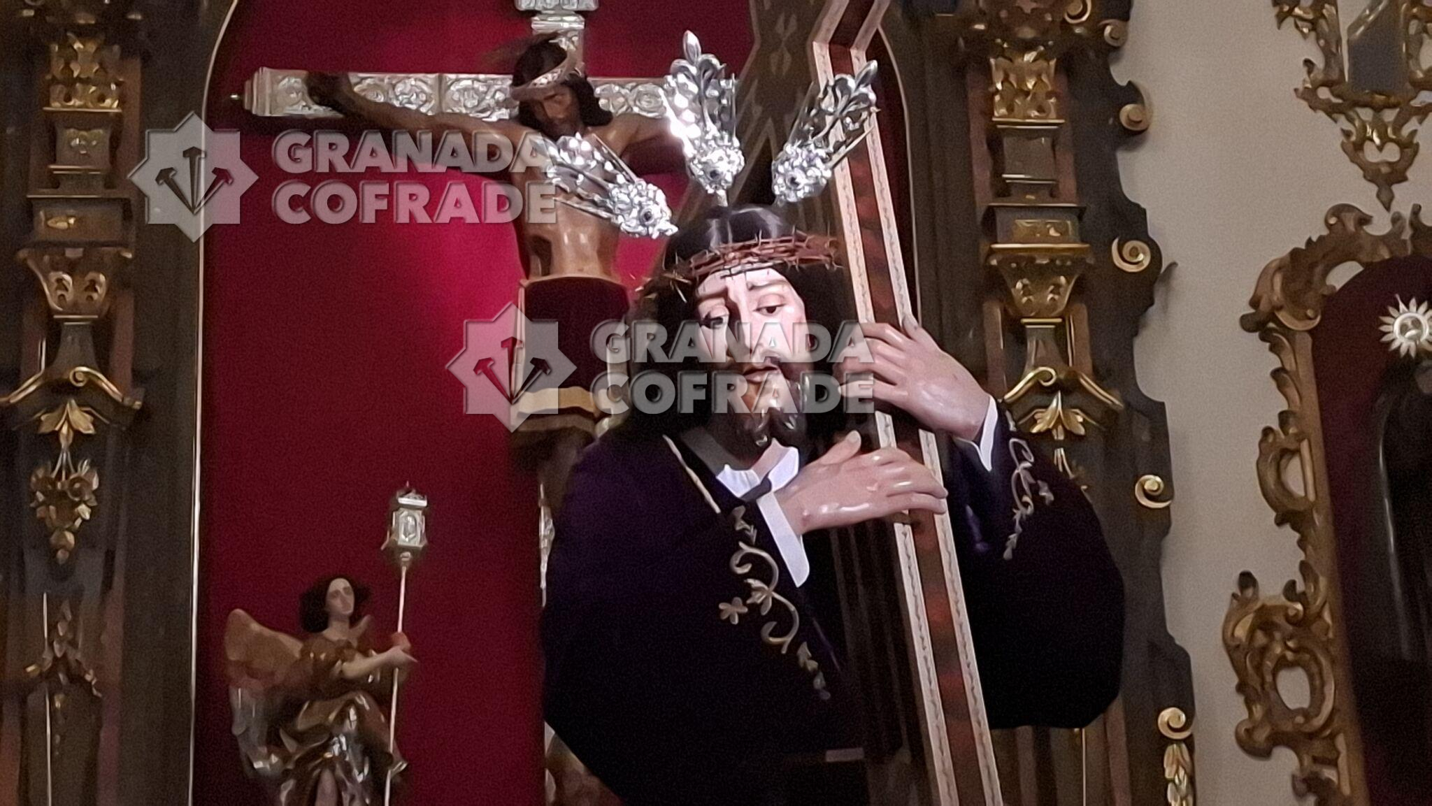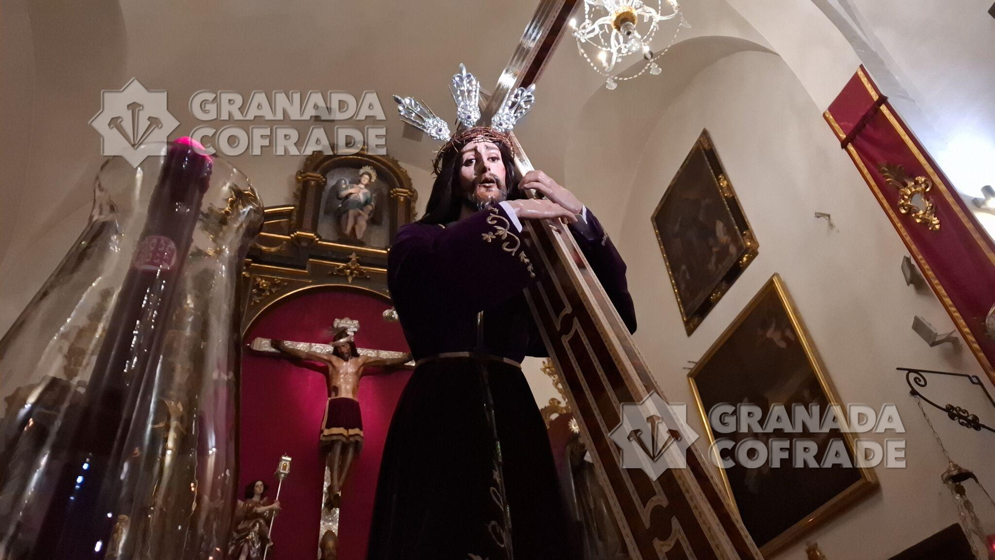 Con flor en tonalidad moradas, blancas y malvas, con fresias, claveles y tulipanes, principalmente, se había dispuesto el adorno floral de las andas de Vía Crucis de la hermandad del Santo Crucifijo de San Agustín que, finalmente, no pudo realizar su salida por las calles del entorno del templo de clarisas franciscanas. A primeras horas de la tarde y ante la lluvia que caía y que amenazaba continuar, se determinó suspender la salida del Nazareno de las Penas y del cortejo de hermanos que era bastante participativo un año más. El director espiritual de la hermandad, el redentorista Francisco José Tejerizo Linares dirigió el rezo por la noche, después de que el capellán de la comunidad religiosa, Elías Alcalde, realizare la celebración de la Eucaristía en el interior del templo.