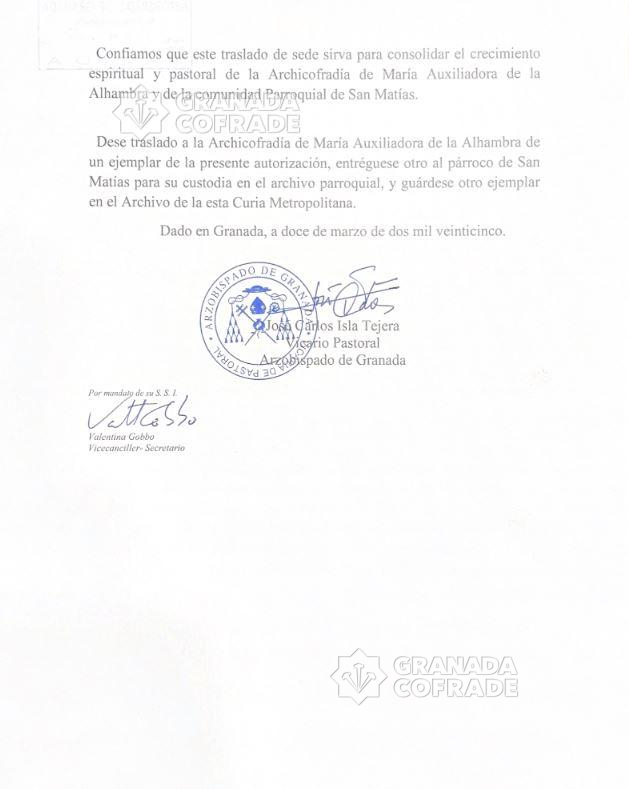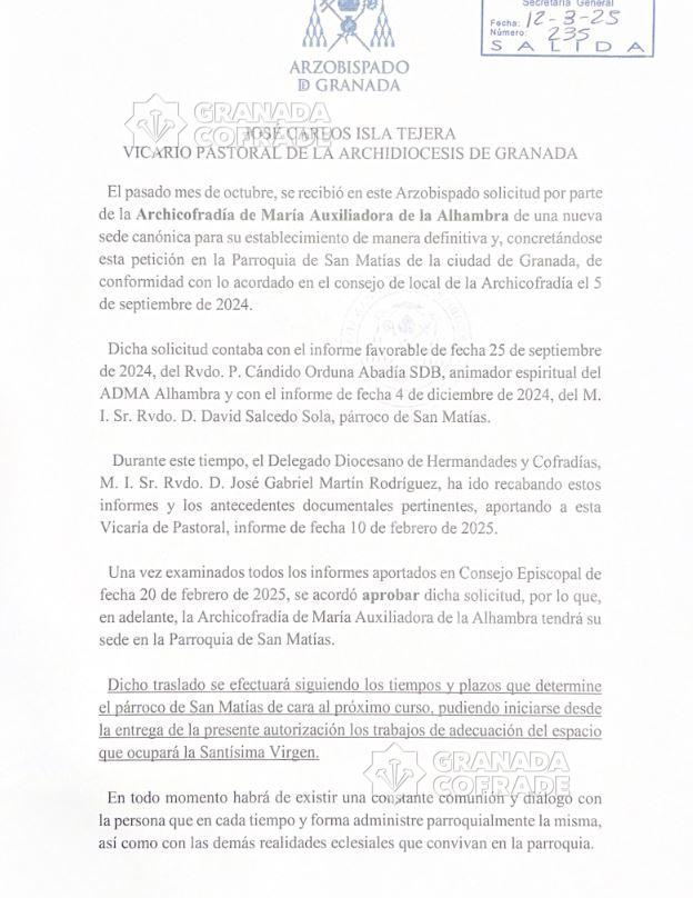 Tras la celebración el pasado mes de septiembre de la Asamblea General Extraordinaria de la Adma-Alhambra, convocada a tal efecto y siguiendo desde entonces todas las directrices y pasos dados al respecto la A complace comunicar que una vez aprobado por el Consejo Episcopal  y recibido  el decreto que adjunta este comunicado,  a partir del curso que viene nuestra sede canónica se trasladará  de forma definitiva a la Iglesia Parroquial Imperial de San Matías. Este cambio, tras años de arduo trabajo, representa una nueva etapa llena de oportunidades e ilusión para crecer juntos en la fe y fortalecer nuestros lazos como comunidad entorno a María Auxiliadora.