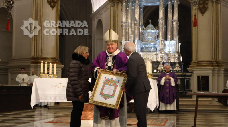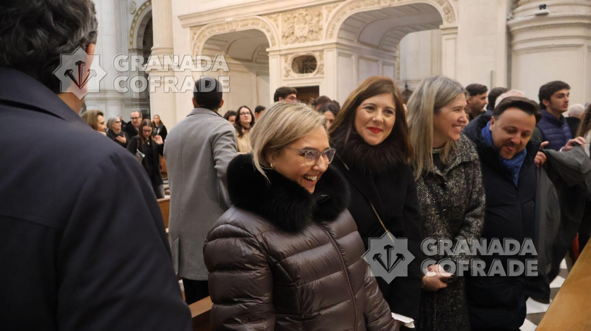 Después de la celebración, a la que asistieron miembros de la Orden Hospitalaria con su superior al frente, Julián Sapiña, y el presidente de la Asociación del Santo Escapulario de San Juan de Dios, José Luis Ramírez se procedió a la entrega del pergamino de nombramiento a la pregonera, Mamen Sánchez, para la lectura del pregón del próximo domingo. En un artístico pergamino enmarcado, obra de Carla Anaí Juvel, se recoge el nombramiento que el prelado entregó a la pregonera, acompañado por el presidente de la Federación de Cofradías, Armando Ortiz. Estuvieron presentes también las ediles Anabel Sánchez y Carolina Amate, acompañados por el concejal Francis Almohalla. La celebración Eucarística fue concelebrada por los sacerdotes, Eduardo García, deán de la Catedral y fray Juan José Hernández, rector de la basílica de San Juan de Dios, así como los canónigos de la Catedral y seminaristas.