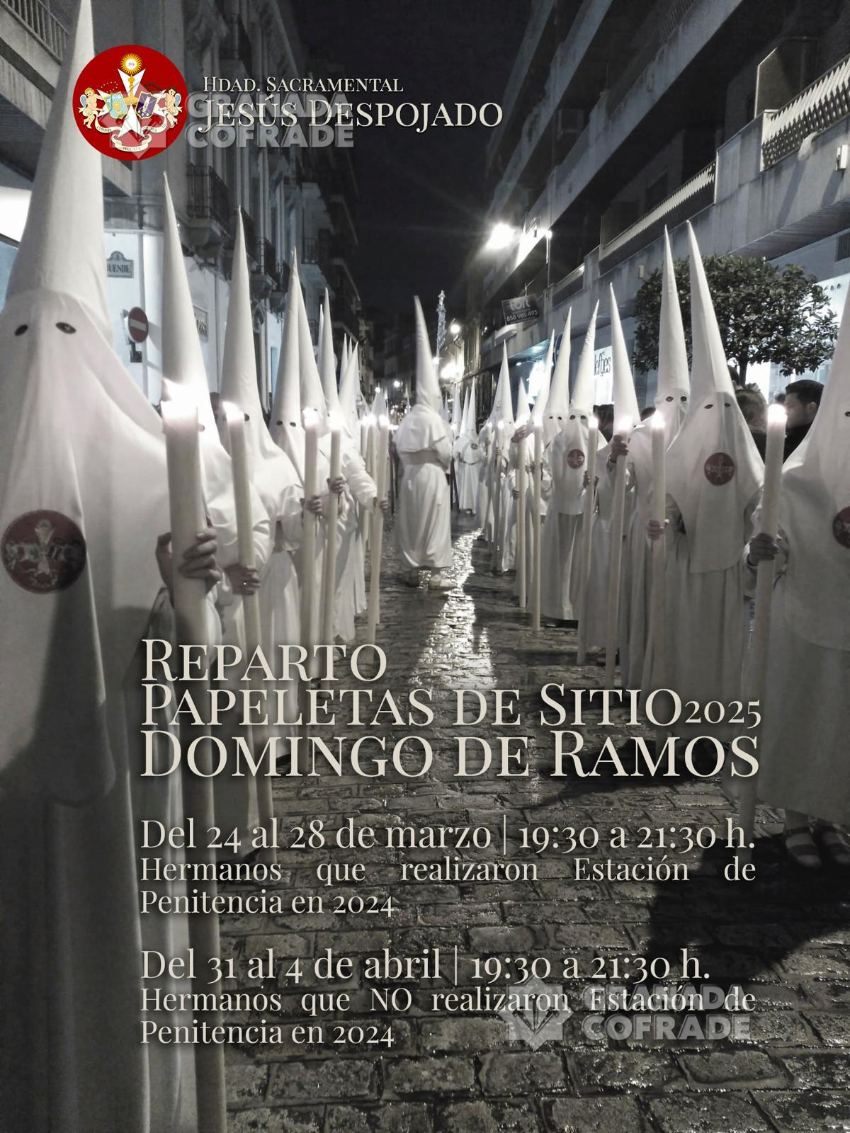 Por otra parte informan desde la junta de gobierno que se continúa con el reparto de papeletas de sitio durante la semana del 31 de marzo al 4 de abril (de lunes a viernes) de 19:30 a 21:30 horas en nuestra Casa de Hermandad.